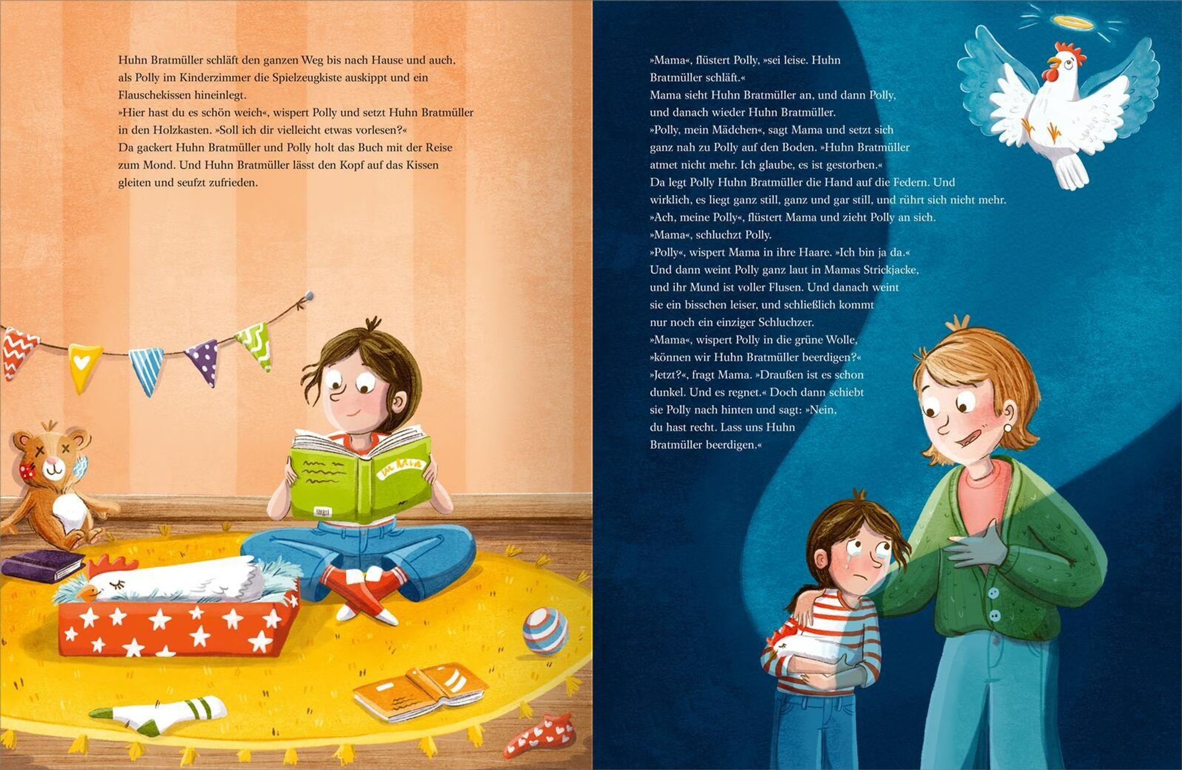 Polly hat kein Meerschweinchen und keine Katze und keinen Hund. Polly hat ein Huhn. Wenn Polly gackert, kommt Huhn Bratmüller angerannt, ganz egal, wo es gerade Würmer sucht. Es reitet auf Pollys Schultern durch den Garten, und wenn Huhn Bratmüller müde wird, nimmt Polly es auf den Schoß und wiegt es hin und her. Doch plötzlich geht es Huhn Bratmüller nicht mehr gut. Es ist sehr müde und dann wacht es eines Tages nicht mehr auf. Polly ist furchtbar traurig und weint dicke Tränen in Mamas Kuschelpullover. Und dann beschließt sie, einen Drandenken-Friedhof zu errichten, direkt im Garten. Da können alle Tiere ein Grab bekommen. Egal ob verkaufte Schweine, kleine Kaninchen oder ausgeflogene Kanarienvögel. Polly findet für jedes Tier ein passendes Plätzchen zum Erinnern und für die letzte Ruhe. Und Polly ist sicher, ihr Huhn Bratmüller ist im Himmel das allerschnellste Huhn. Schließlich hat es ja Doppelflügel.