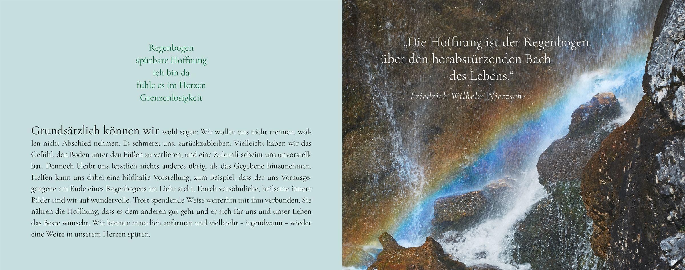 "Wenn ein geliebter Mensch von uns gegangen ist, so bleibt er doch Bestandteil unserer Welt - nicht nur in der Erinnerung. Wenn wir wollen, können wir ihn spüren, jetzt und überall: in jedem Sandkorn, in jedem Windhauch, in jedem Sonnenstrahl, im Duft jeder Blume, im Rauschen des Regens, im Funkeln der Sterne." (Holger Aurin)