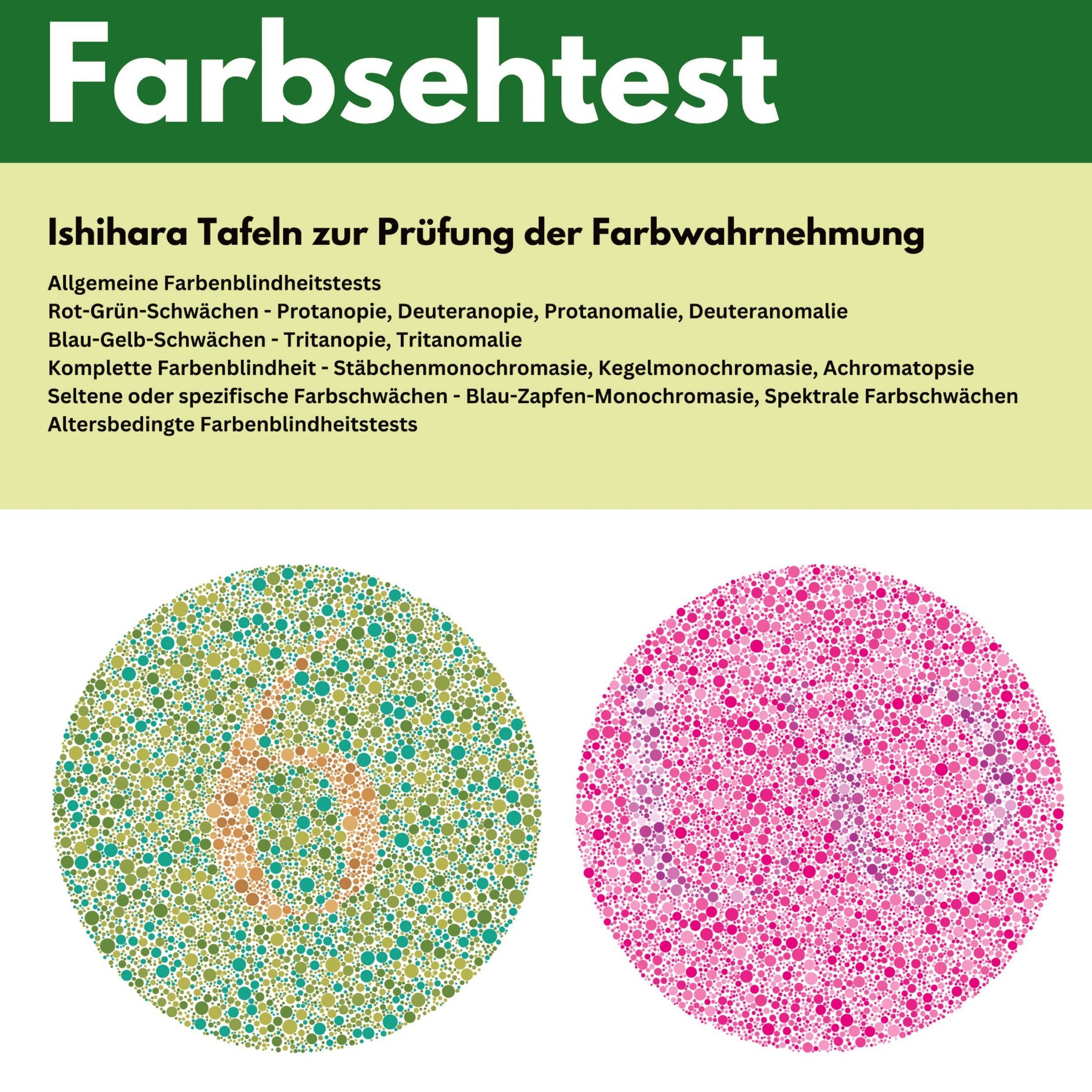 - Ishihara Tafeln zur Prüfung der Farbwahrnehmung, Rot-Grün-Schwäche, Blau-Gelb-Schwäche, Seltene Farbwahrnehmungsstörungen, Altersbedingte Farbsehschwäche