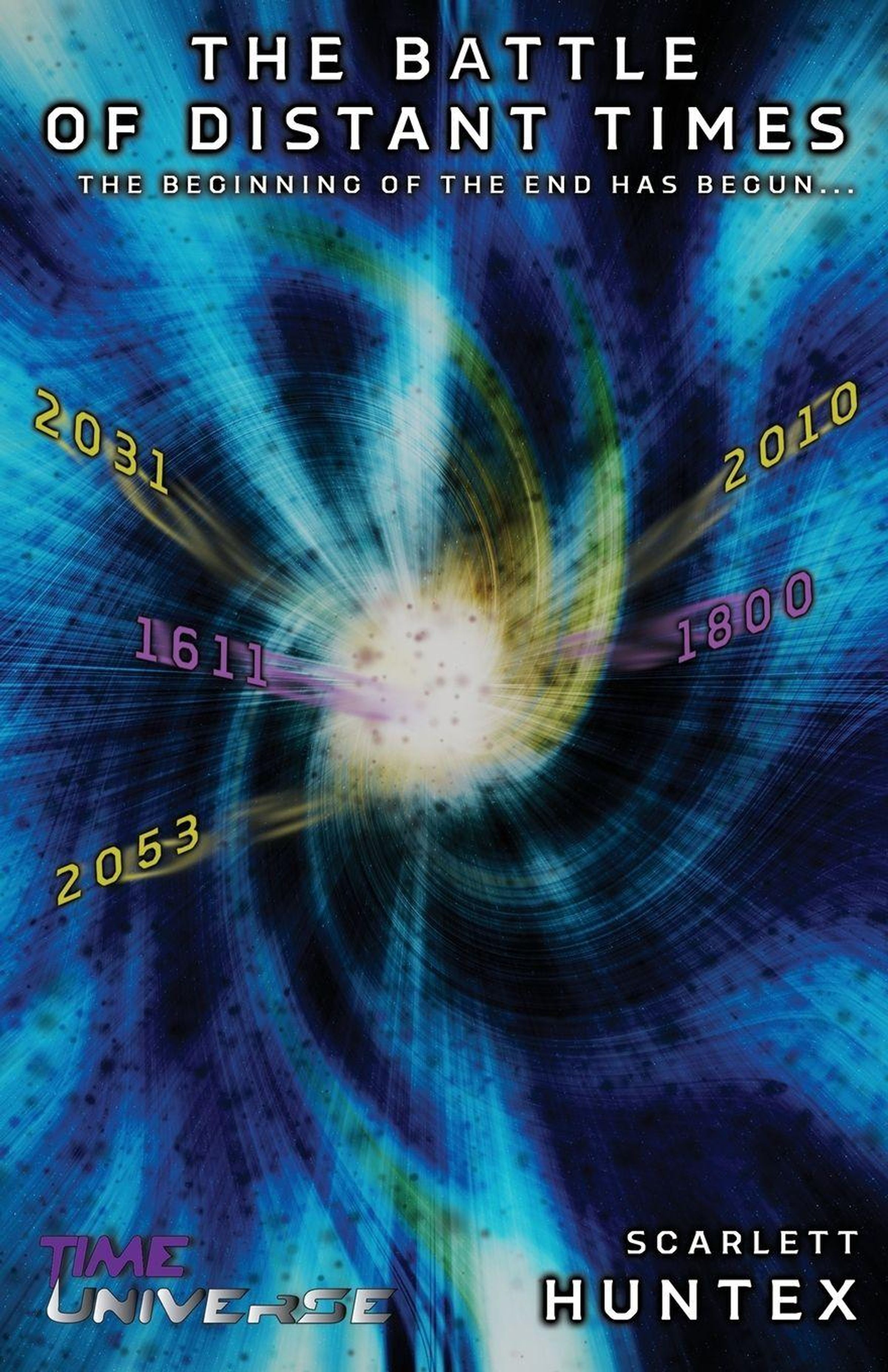 Text: "THE BATTLE OF DISTANT TIMES," "THE BEGINNING OF THE END HAS BEGUN," Jahreszahlen 1611-2053, "SCARLETT HUNTEX." Dynamische, blaue Energiemuster., Buch