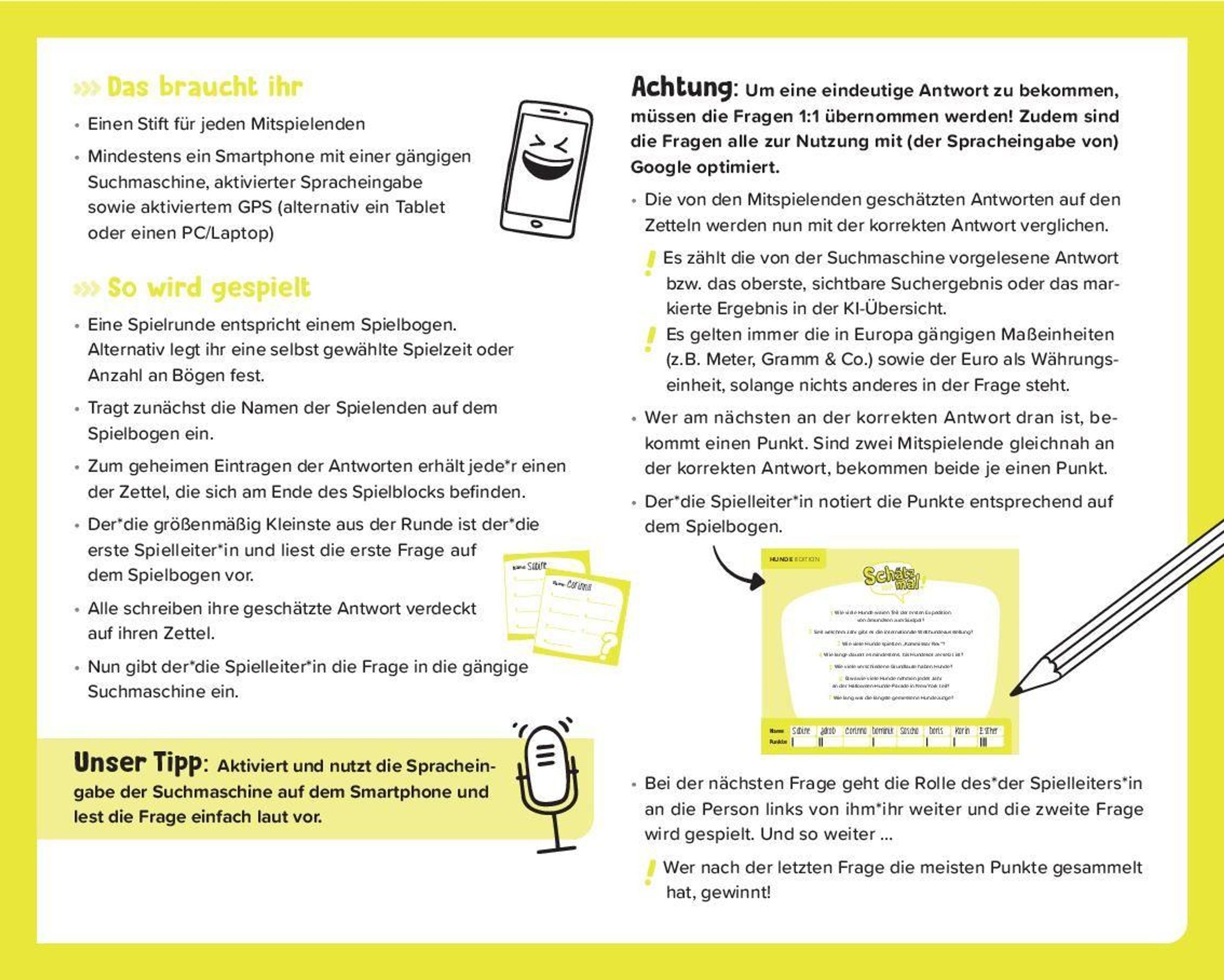 Ihr erhaltet einen Block (10 x 16 cm) mit stabilem Papprücken, angenehmem Matt-Cover mit Lackeffekten und über 150 Schätzfragen auf 64 Seiten, der auch perfekt zum Mitnehmen geeignet ist.