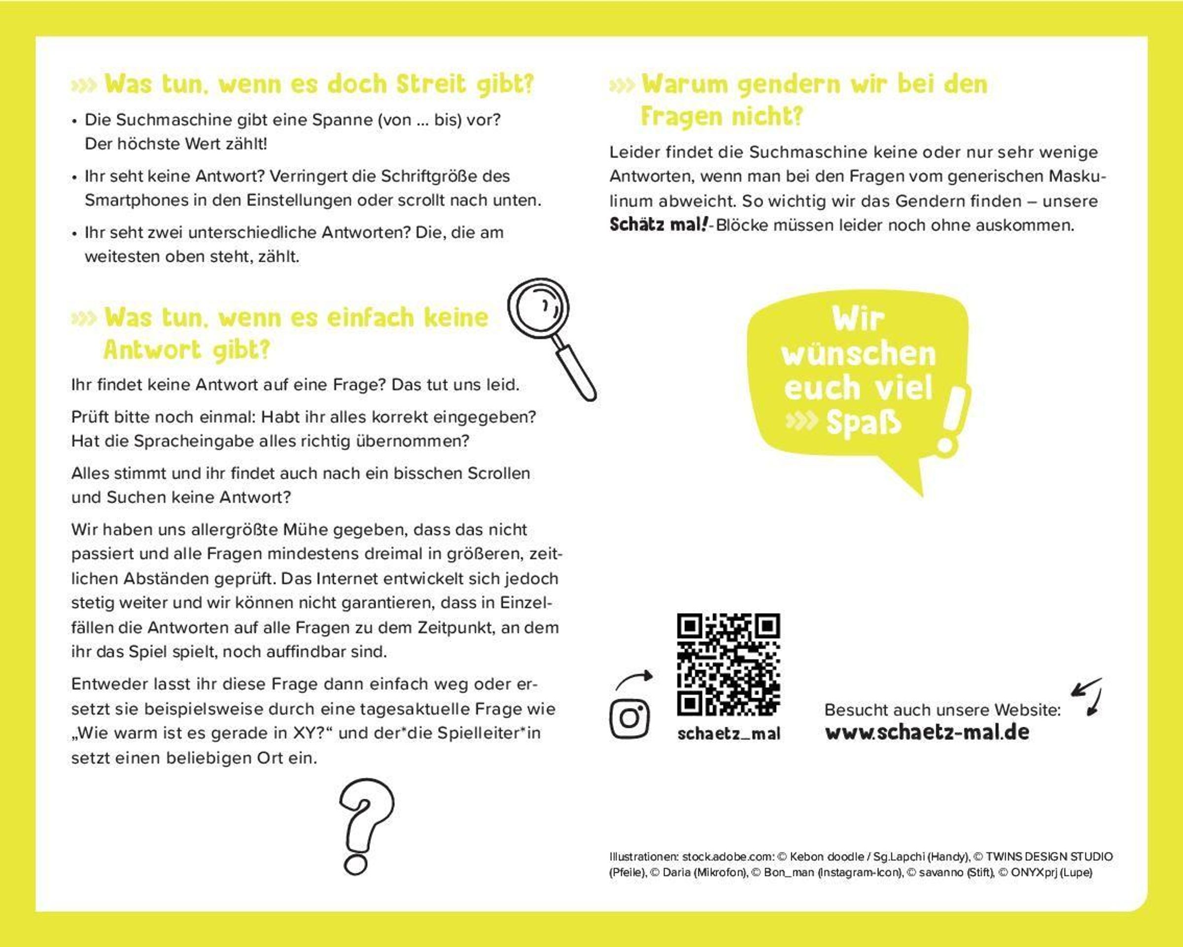 Daheim, bei Feiern oder im Urlaub -- für zwanglose, spaßige Spielerunden mit Freunden und Familie oder auch als Geschenk und Mitbringsel ist "Schätz mal!" immer genau das Richtige!