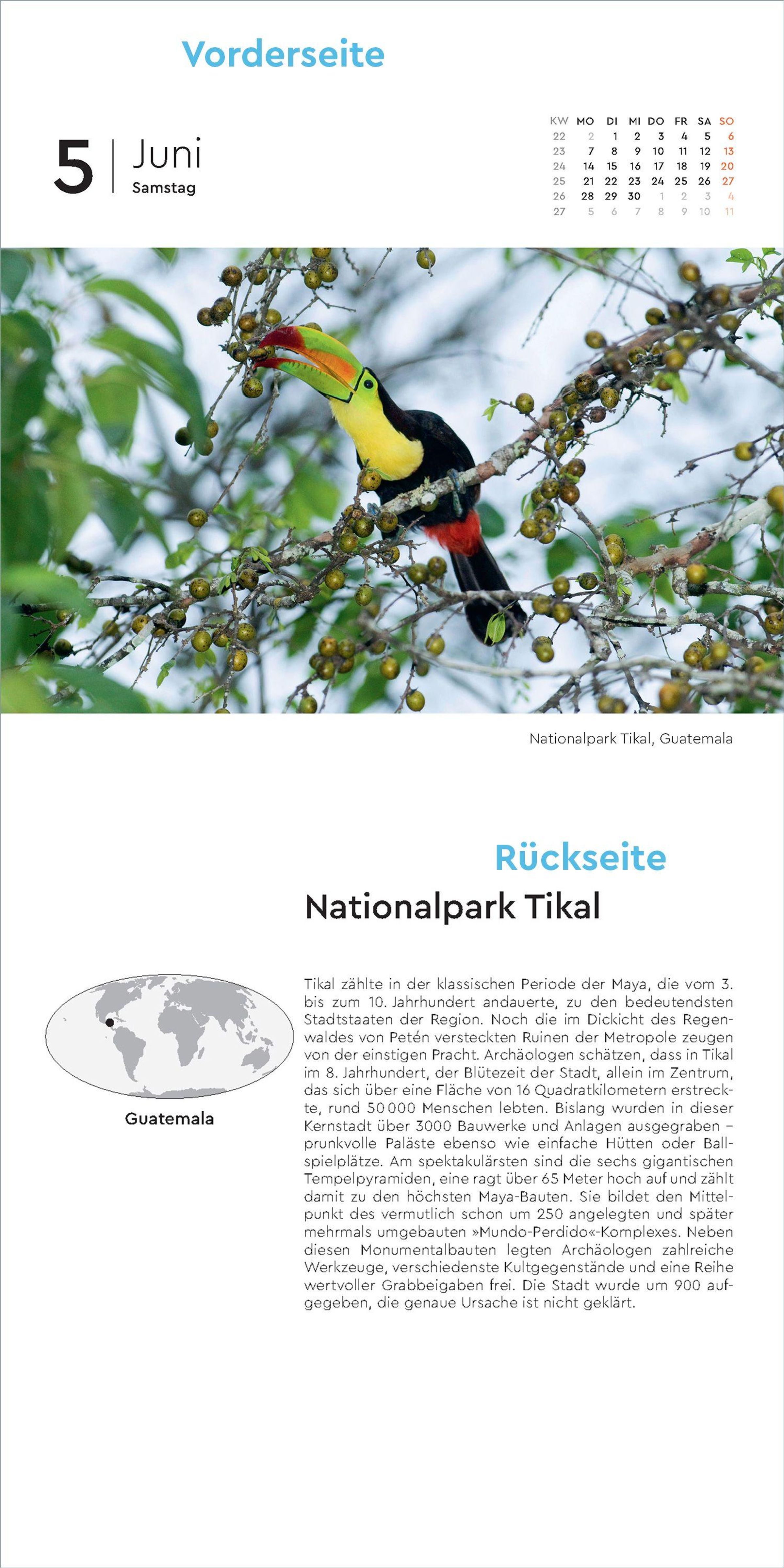 Dieser KUNTH Abreißkalender "Schätze der Natur" 2027 führt zu 365 traumhaften Orten in Bild und Text. Täglich gibt es Neues zu entdecken, und täglich illustrieren brillante Bilder ein neues Thema. Der Kalender von KUNTH präsentiert Tag für Tag in außergewöhnlichen Bildern und informativen Texten Naturerbestätten, Nationalparks und andere schützenswerte Paradiese und zeigt eindrücklich, worin ihre einzigartige Schönheit liegt und warum sie mit ihrer Flora und Fauna bewahrenswert sind.