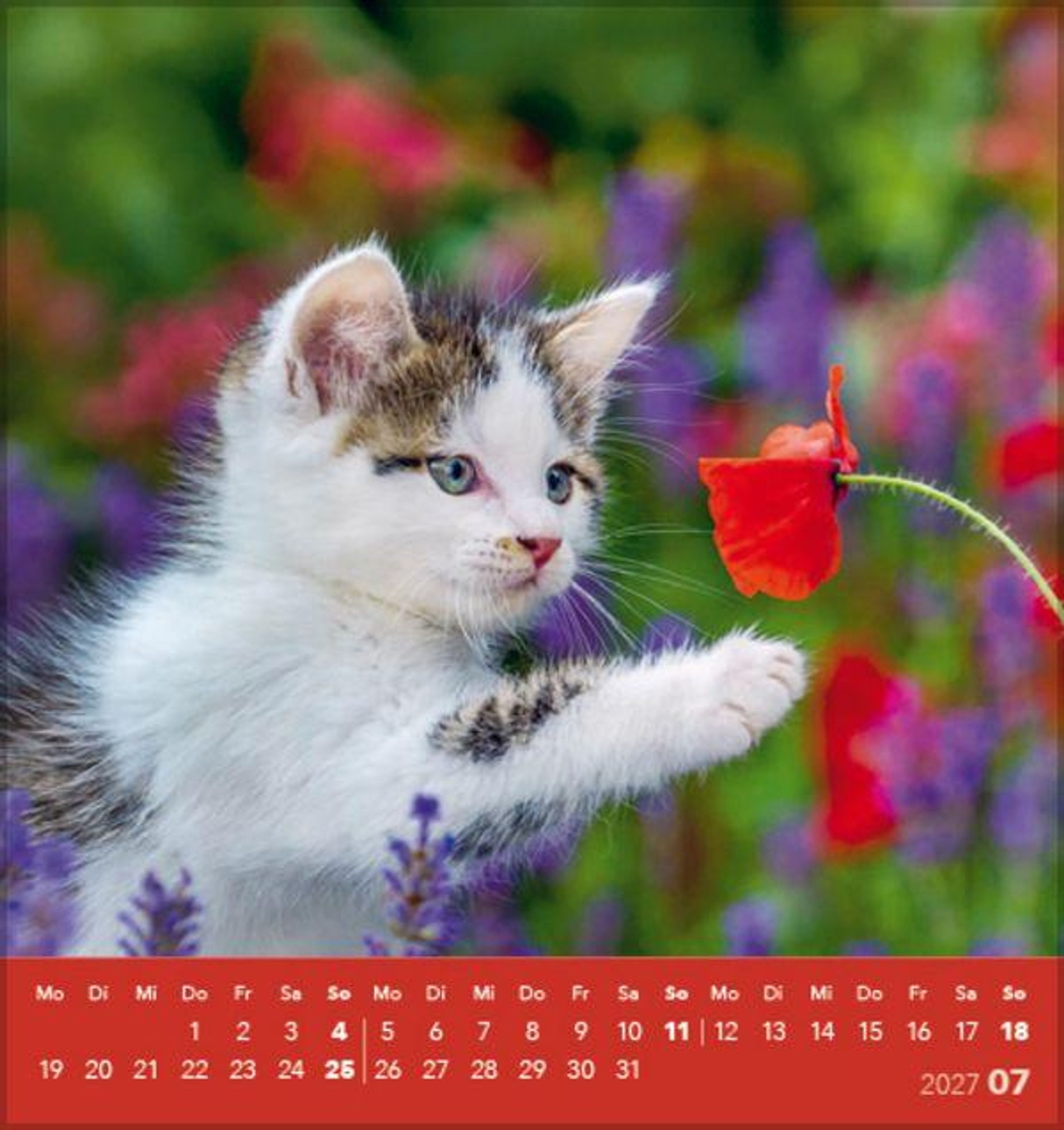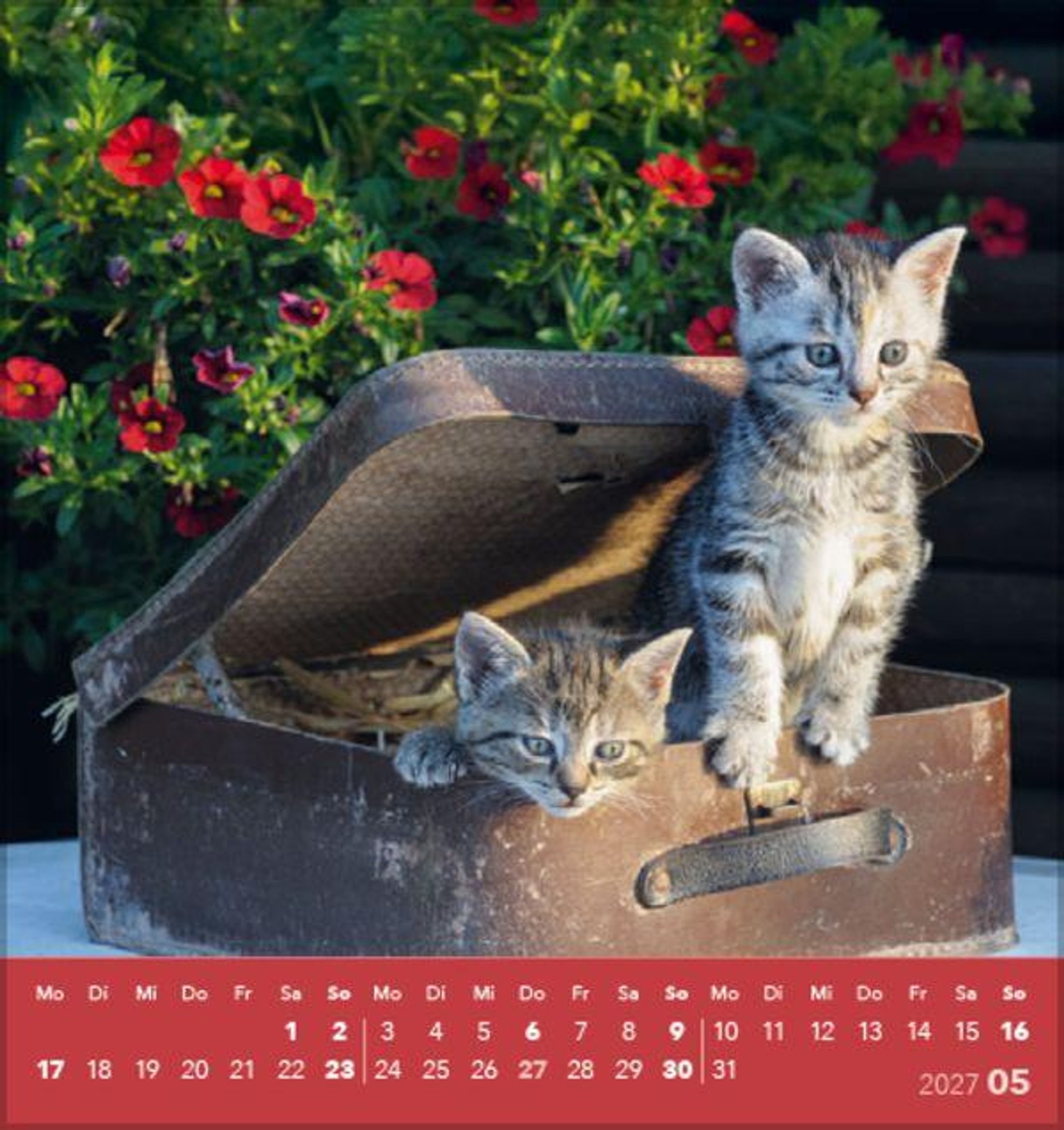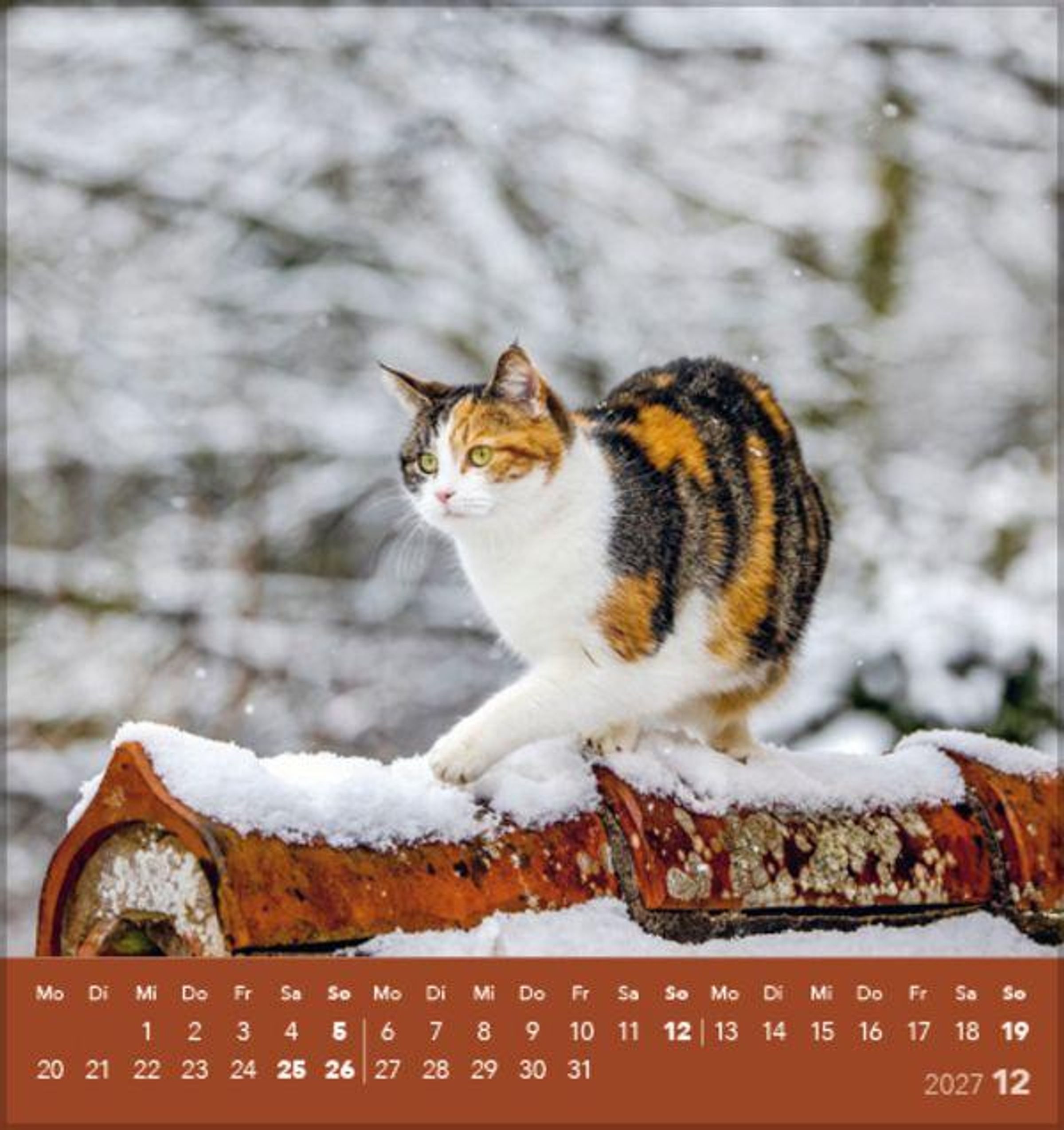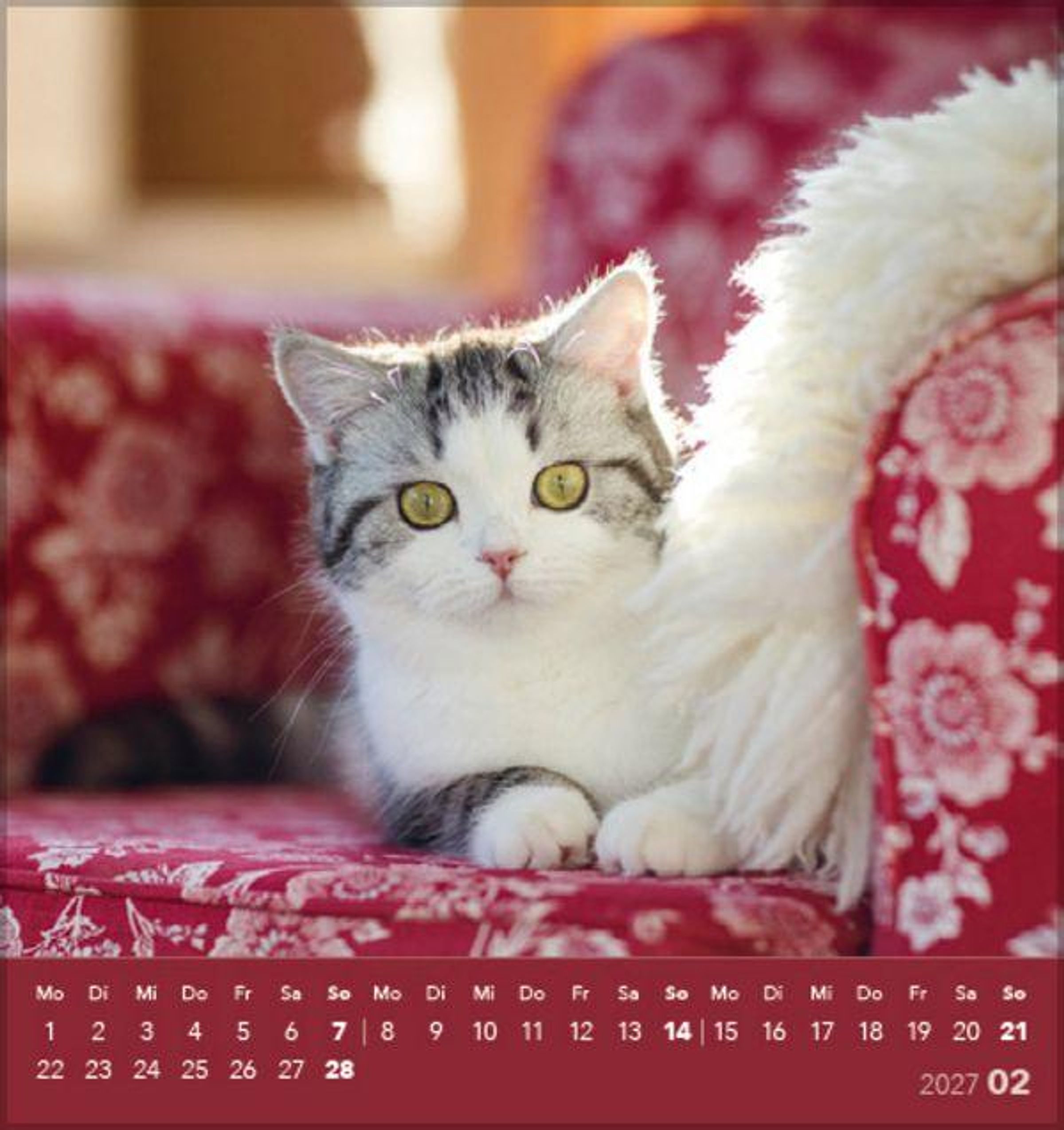 Aufstellbarer Postkartenkalender mit bezaubernden Fotos von eleganten Stubentigern und rührend niedlichen Kätzchen.