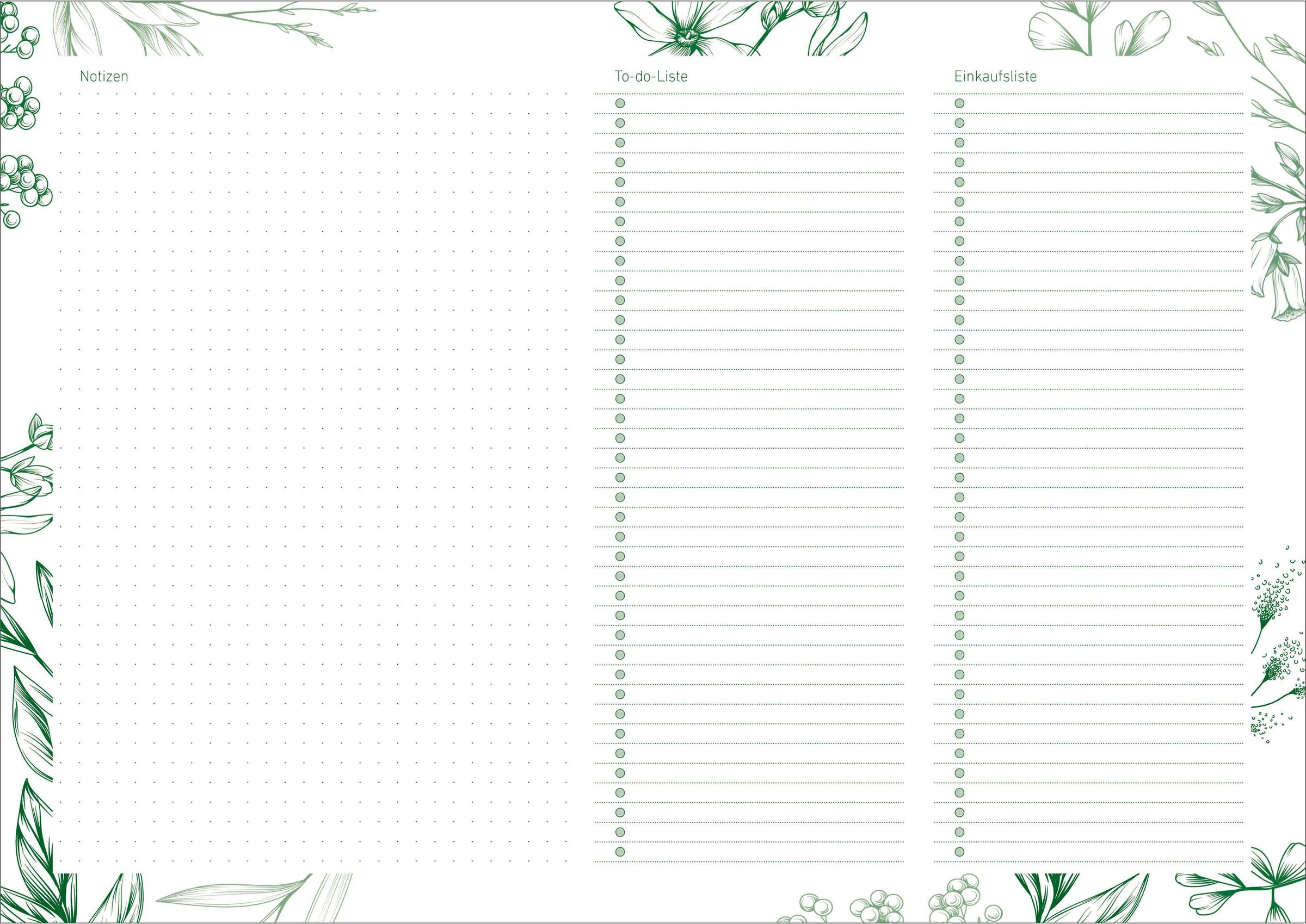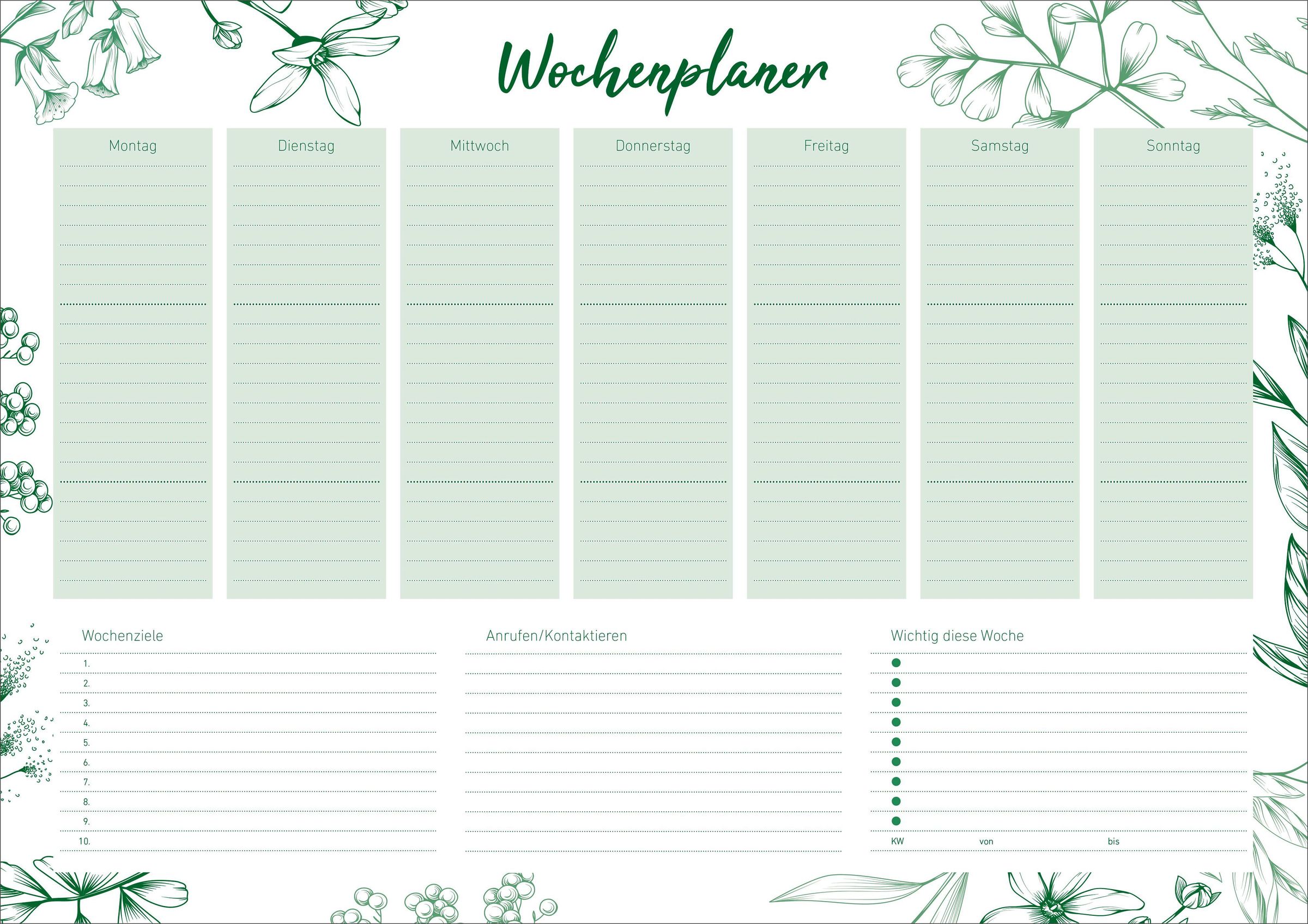 „Wochenplaner“ in grüner Schrift; sieben Spalten für Wochentage, Blumenmotive umrahmen das Design., Kalender