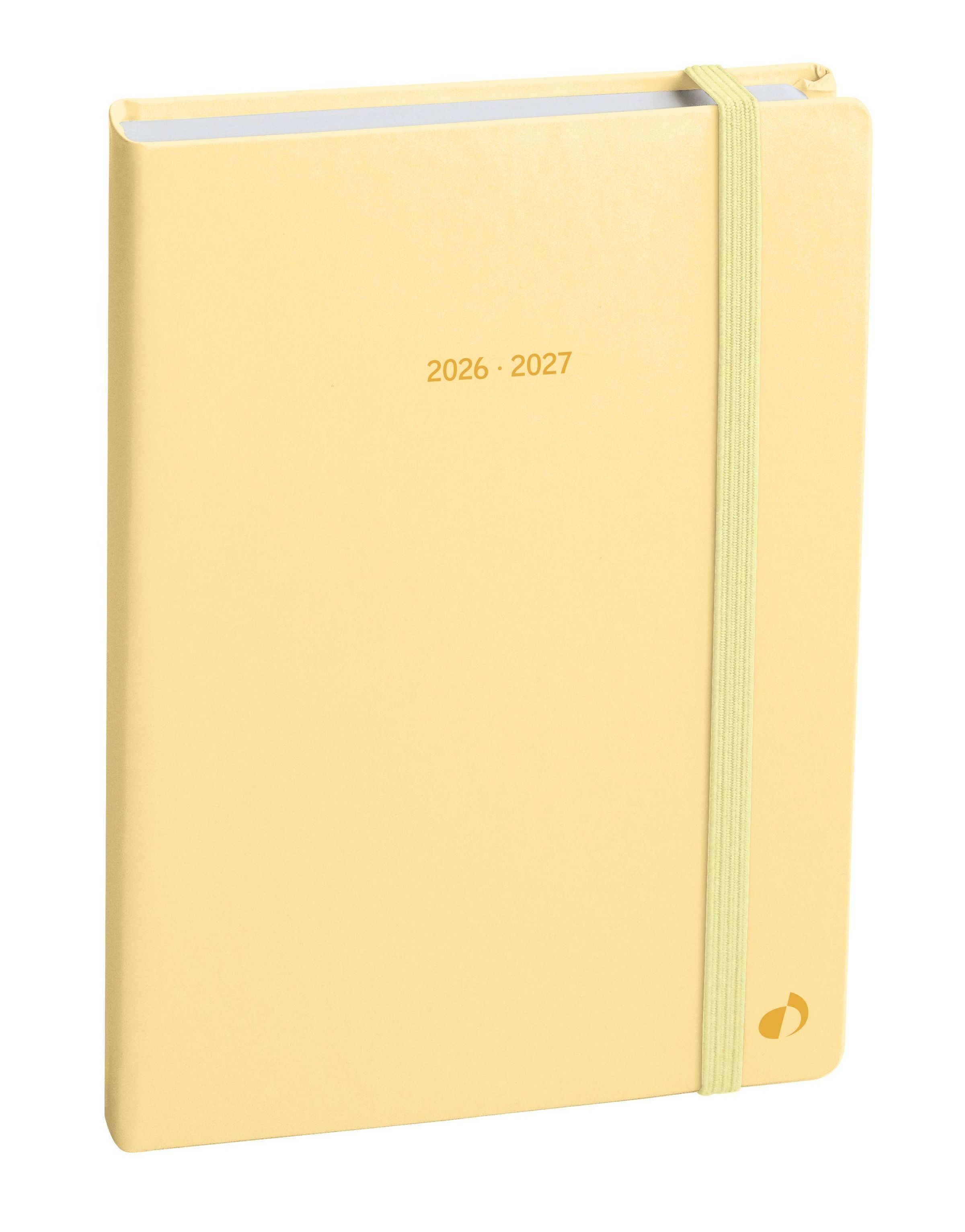 Text: "2026 · 2027". Ein hellgelber Kalender mit einem elastischen Verschlussband., Buch