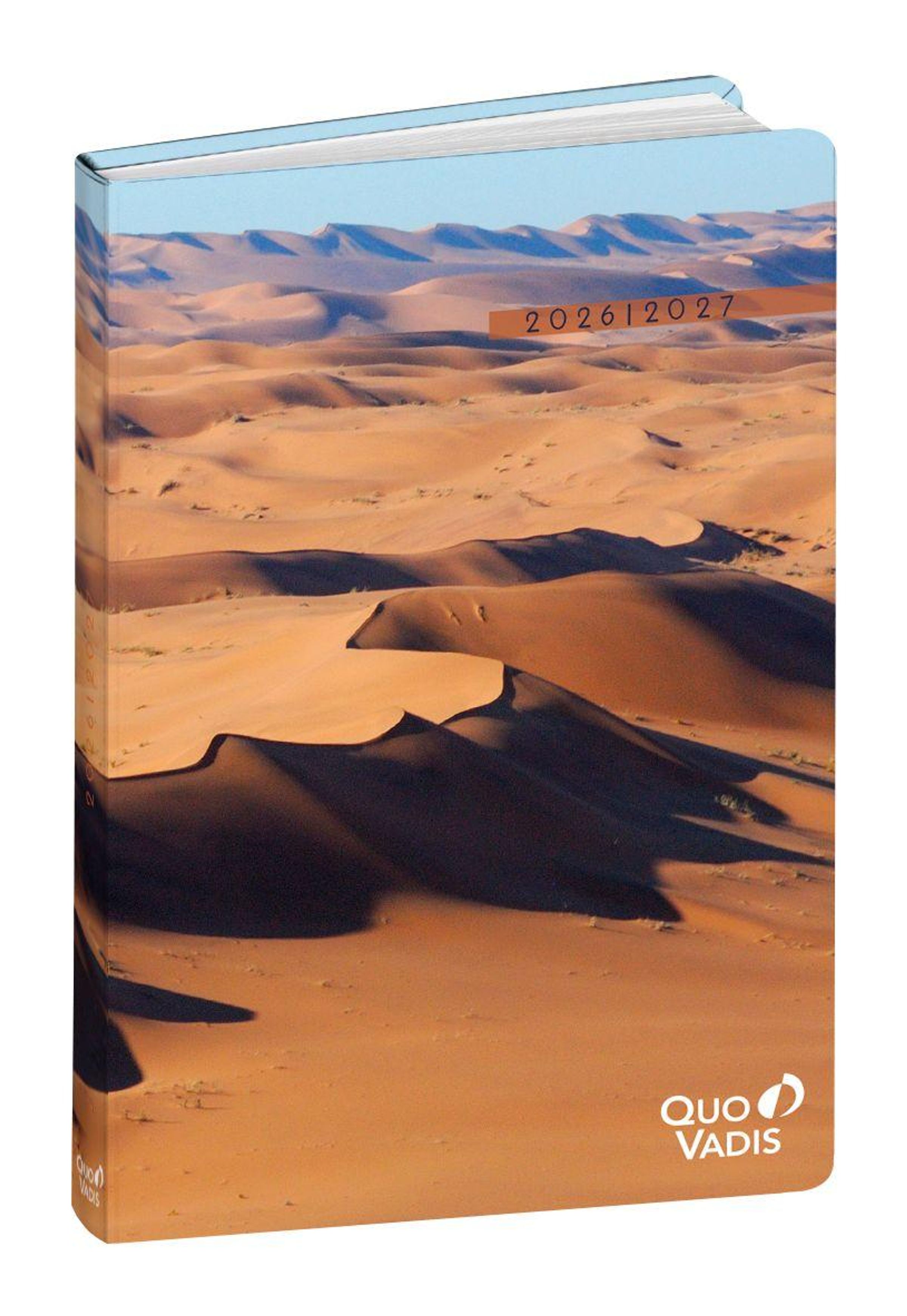 „2026 | 2027“ und „Quo Vadis“. Ein Notizbuch mit Wüstenlandschaft und Dünen auf dem Cover., Buch
