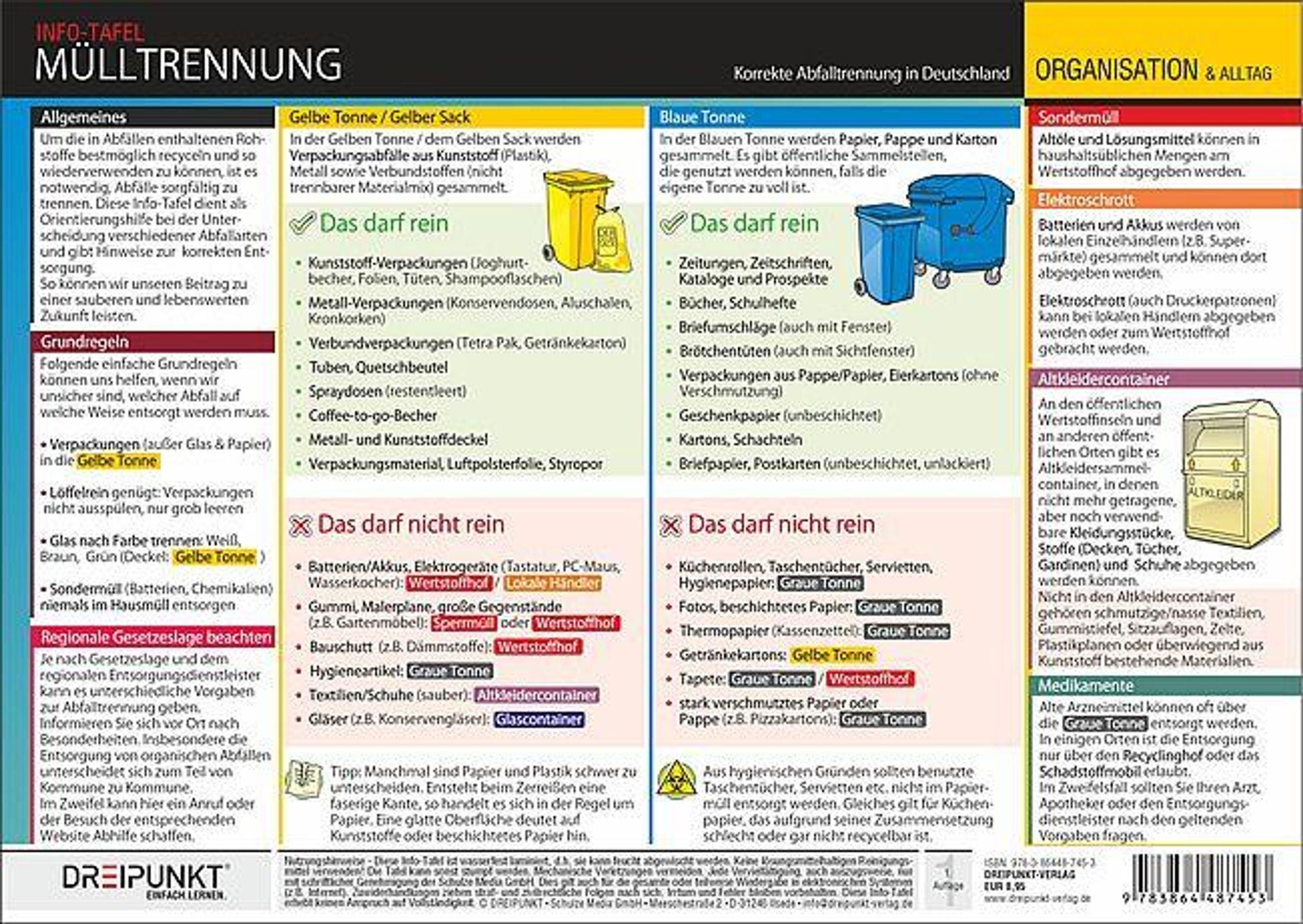 Diese zweiseitig bedruckte Info-Tafel gibt Antworten zu vielen Fragen rund um die Themen Mülltrennung und -entsorgung. Mit vielen anschaulichen Beispielen zu korrekter Entsorgung sowie häufig gemachten Fehlern.