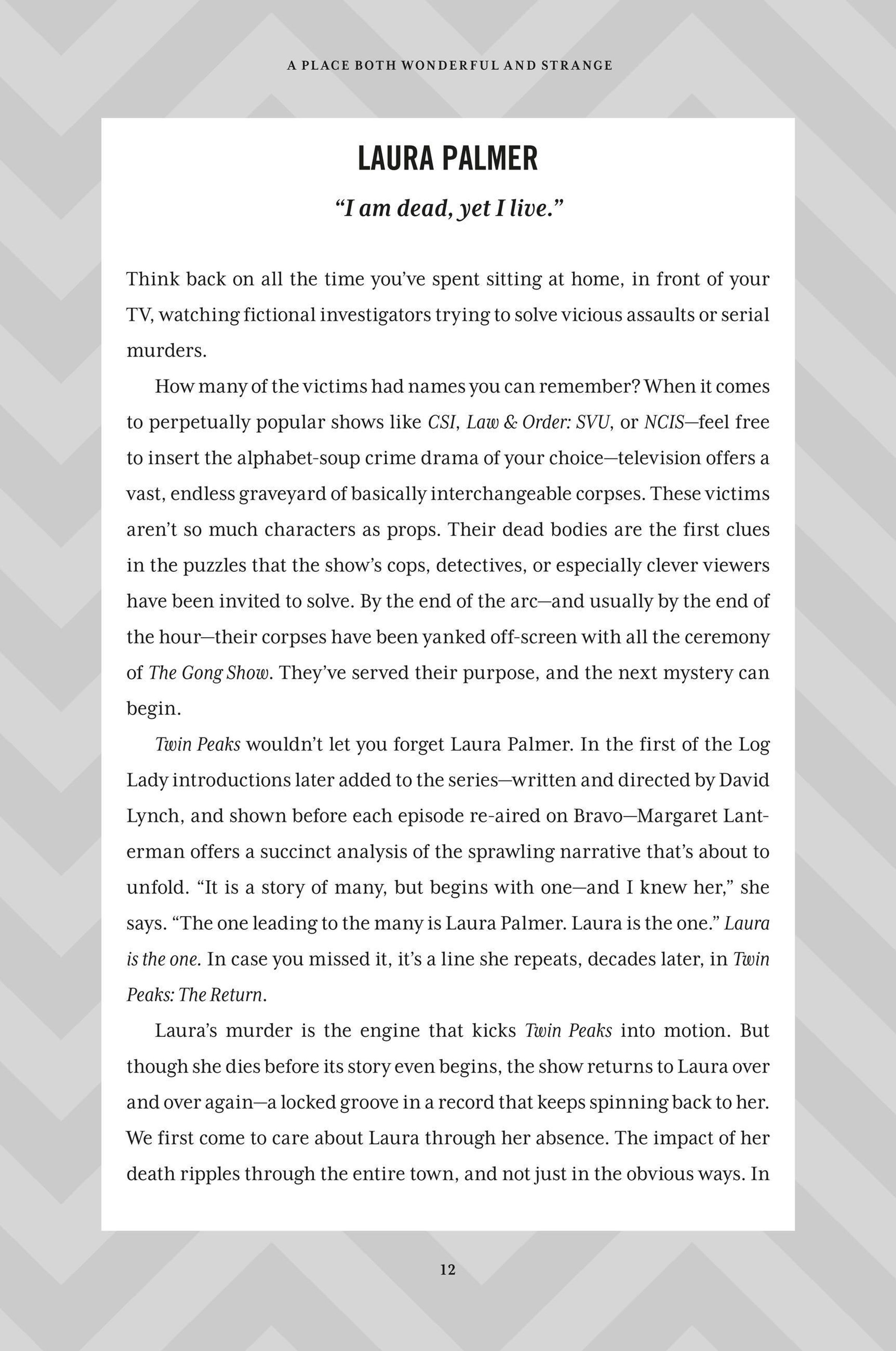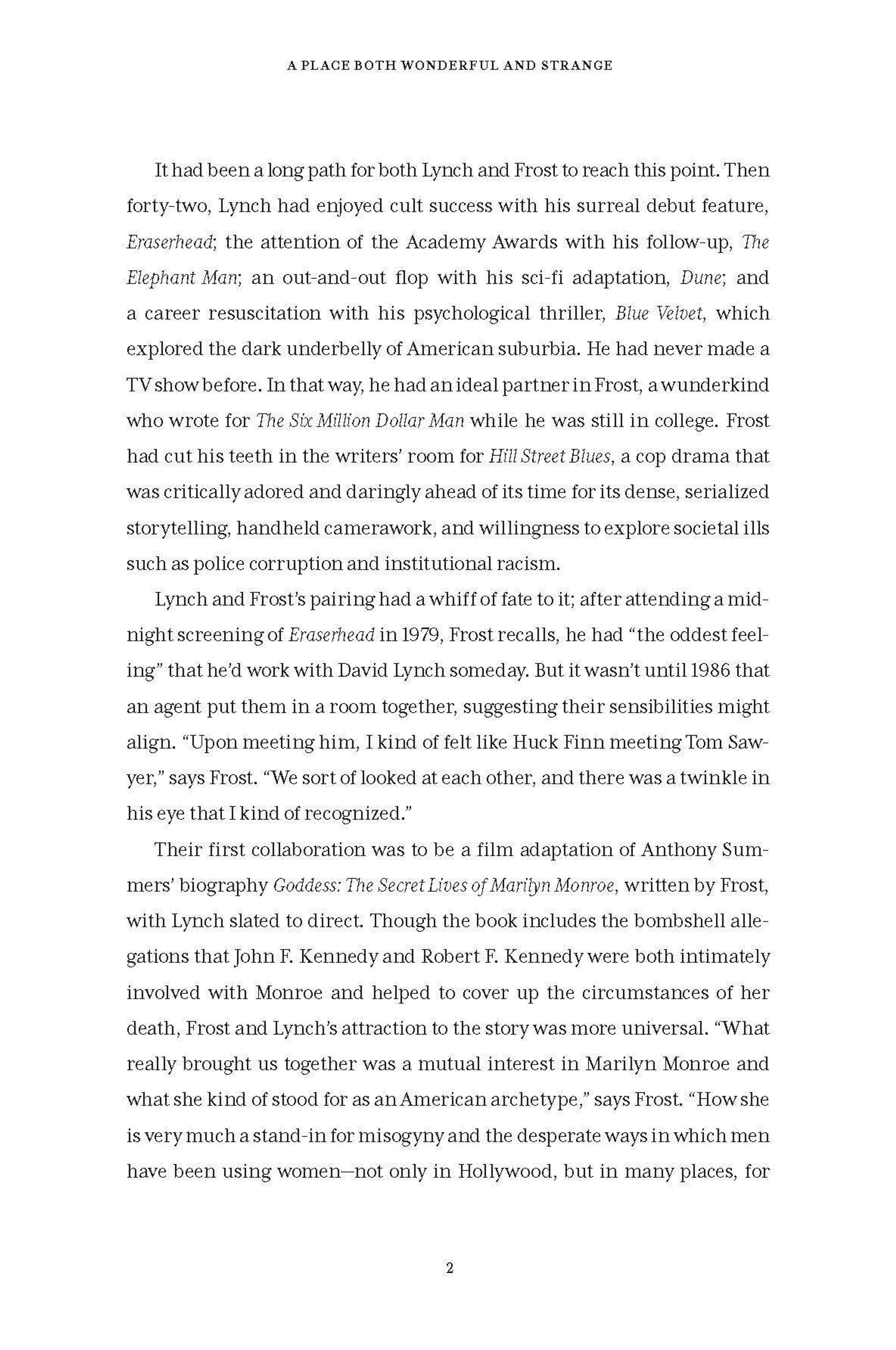 In A Place Both Wonderful and Strange , entertainment reporter Scott Meslow takes readers behind the curtain of Lynch's and Frost's dedication to finishing what they started, with both the prequel film and Showtime's Twin Peaks: The Return , offering dozens of original and revelatory interviews that cast a whole new light on the extraordinary show. Twin Peaks fans will discover how hard the mercurial Lynch and affable Frost fought impatient ABC execs (ultimately losing) to keep Laura Palmer's murder unsolved, as well as the omerta-like secrecy around the filming of the show. For a series that left as many questions unanswered as answered, Meslow's deep reporting will give readers a new perspective, detailing scenes left on the cutting--room floor and how Season Two's finale stunned and infuriated studio execs in what Mark Frost calls "a defiant middle finger to what they [studio executives] thought the show should be."