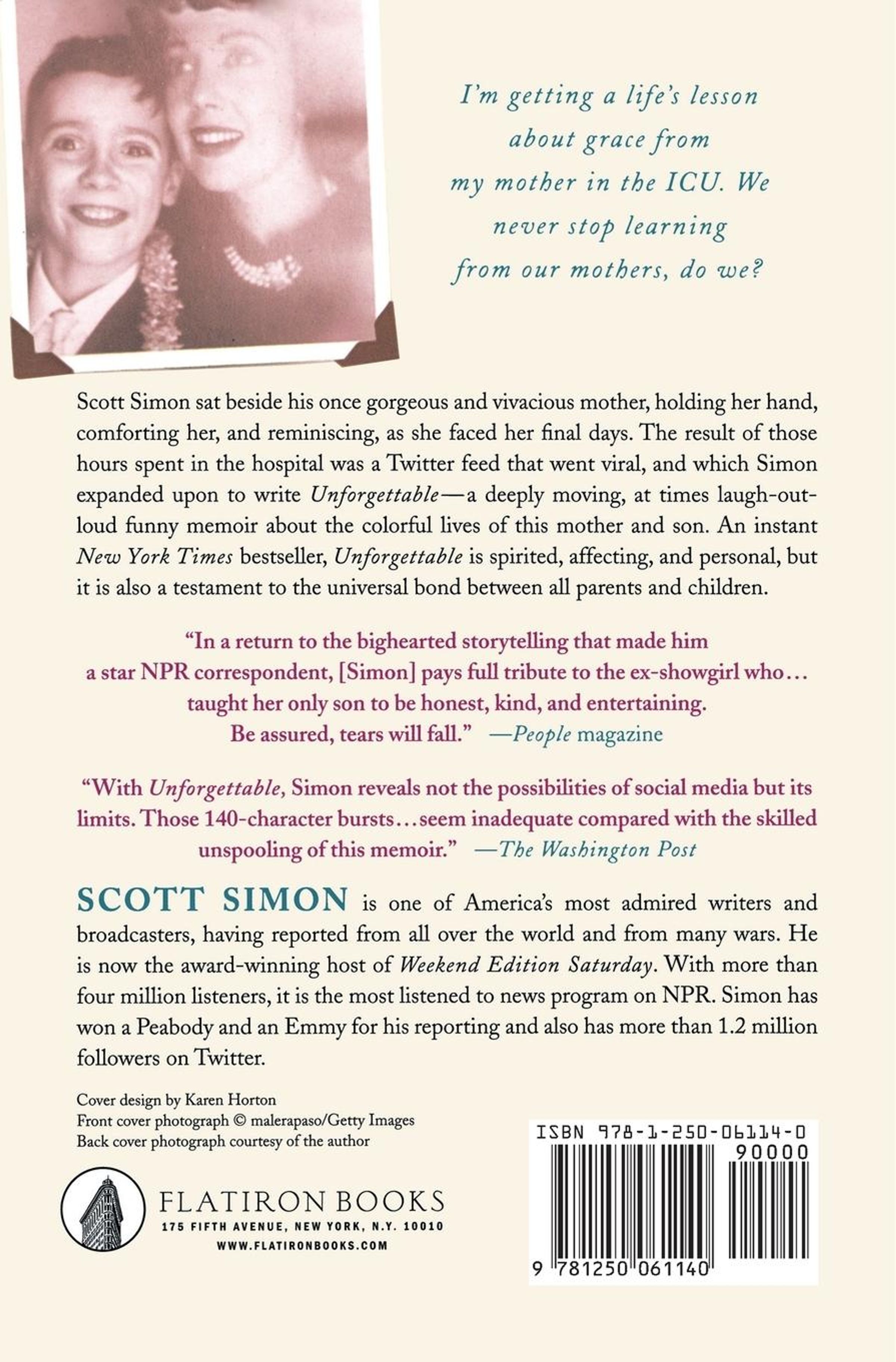Scott Simon sat beside his once gorgeous and vivacious mother, holding her hand, comforting her, and reminiscing about good times and bad as she faced her final days. The result of those hours spent in the hospital is Unforgettable -a deeply moving, at times laugh-out-loud funny memoir about the colorful life of this mother and son. An instant New York Times bestseller, Unforgettable is a spirited, affecting, and personal tribute, and it is a testament to the universal bond between all parents and children.