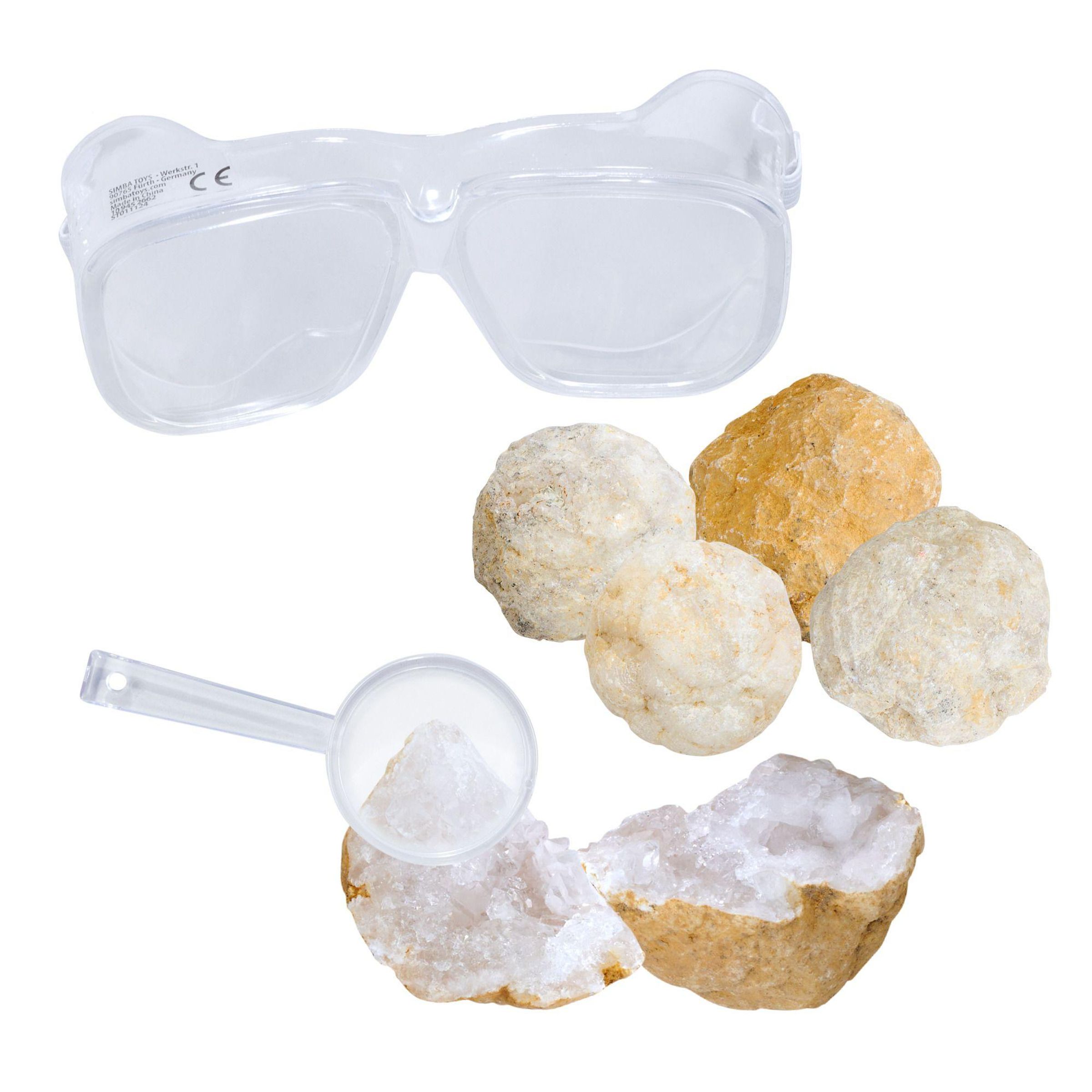 5 echte Geoden, je 3-4cm, inkl. Schutzbrille und Lupe, CB, 3J+