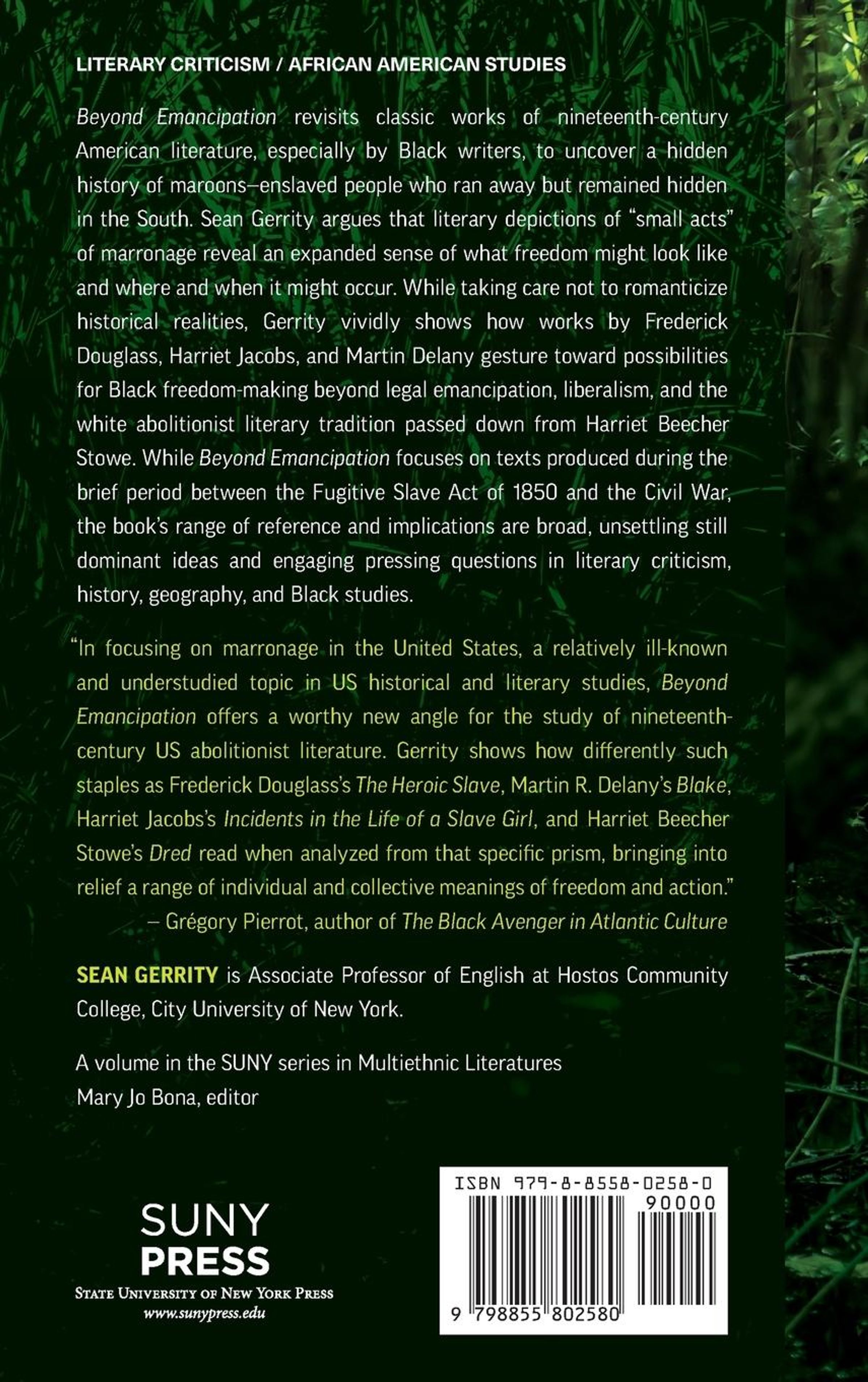Explores how African American literary representations of maroons in the decade leading up to the Civil War complicate conventional narratives and geographies of slavery and freedom in the United States. Beyond Emancipation revisits classic works of nineteenth-century American literature, especially by Black writers, to uncover a hidden history of maroons-enslaved people who ran away but remained hidden in the South. Sean Gerrity argues that literary depictions of "small acts" of marronage reveal an expanded sense of what freedom might look like and where and when it might occur. While taking care not to romanticize historical realities, Gerrity vividly shows how works by Frederick Douglass, Harriet Jacobs, and Martin Delany gesture toward possibilities for Black freedom-making beyond legal emancipation, liberalism, and the white abolitionist literary tradition passed down from Harriet Beecher Stowe. While Beyond Emancipation focuses on texts produced during the brief period between the Fugitive Slave Act of 1850 and the Civil War, the book's range of reference and implications are broad, unsettling still dominant ideas and engaging pressing questions in literary criticism, history, geography, and Black studies.