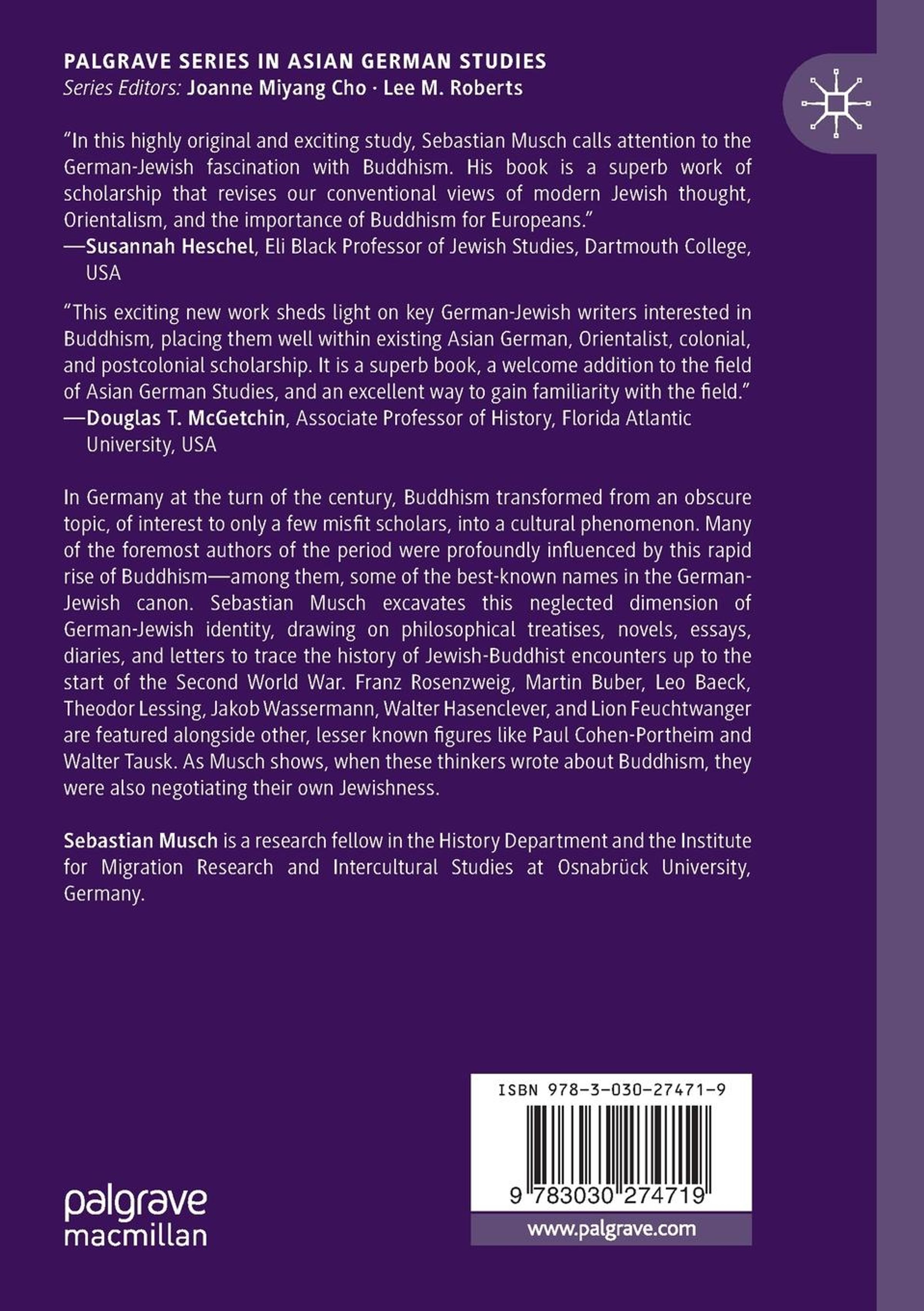 In Germany at the turn of the century, Buddhism transformed from an obscure topic, of interest to only a few misfit scholars, into a cultural phenomenon. Many of the foremost authors of the period were profoundly influenced by this rapid rise of Buddhism-among them, some of the best-known names in the German-Jewish canon. Sebastian Musch excavates this neglected dimension of German-Jewish identity, drawing on philosophical treatises, novels, essays, diaries, and letters to trace the history of Jewish-Buddhist encounters up to the start of the Second World War. Franz Rosenzweig, Martin Buber, Leo Baeck, Theodor Lessing, Jakob Wassermann, Walter Hasenclever, and Lion Feuchtwanger are featured alongside other, lesser known figures like Paul Cohen-Portheim and Walter Tausk. As Musch shows, when these thinkers wrote about Buddhism, they were also negotiating their own Jewishness.