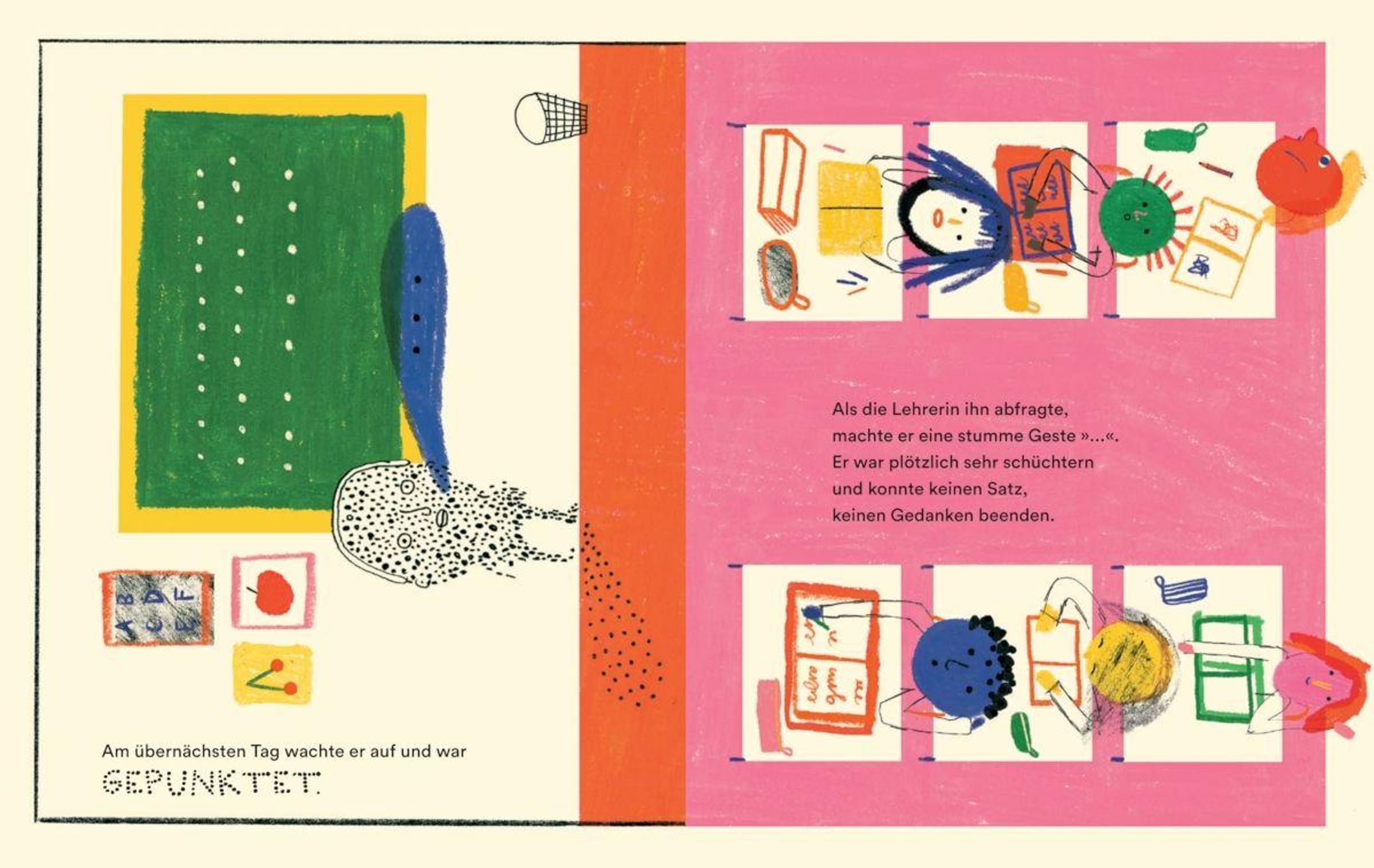Hugo ist nicht mehr wie gestern. Jeden Tag sieht er ein bisschen anders aus: mal kringelig, mal gepunktet, mal gestrichelt. Hugo fragt sich: Bin ich noch ich?