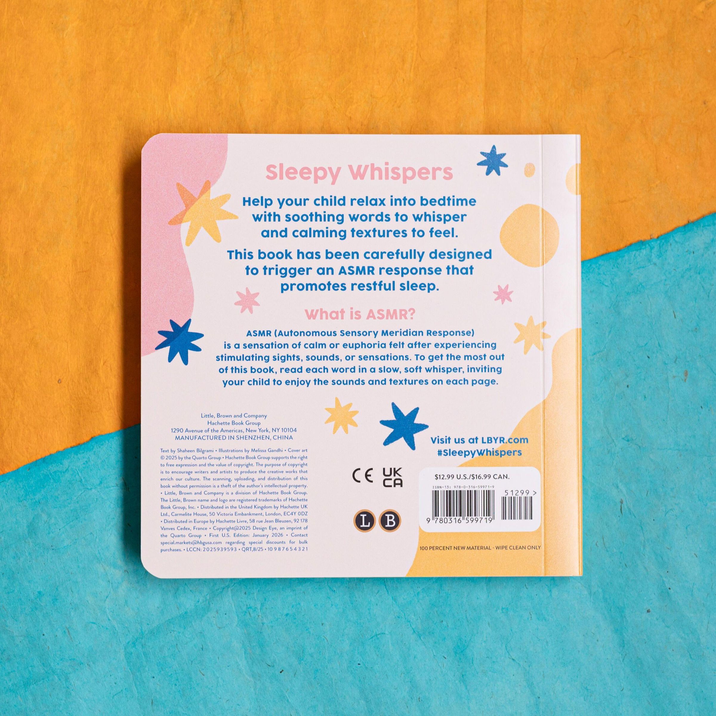 Sleepy Whispers is a tactile, soothing book designed to calm and relax. Every spread features high-quality textures that work with the text and illustrations to trigger an Autonomous Sensory Meridian Response. ASMR is a physical sensation of calm or euphoria, sometimes described as a gentle tingle, that promotes restful sleep, reduces anxiety, and also aids neurodiverse children in self-regulation. Featuring a calming text to whisper-aloud, a repetitive counting element, and an interactive design that encourages bonding between adult and child, this gentle book is the perfect addition to any peaceful bedtime routine.