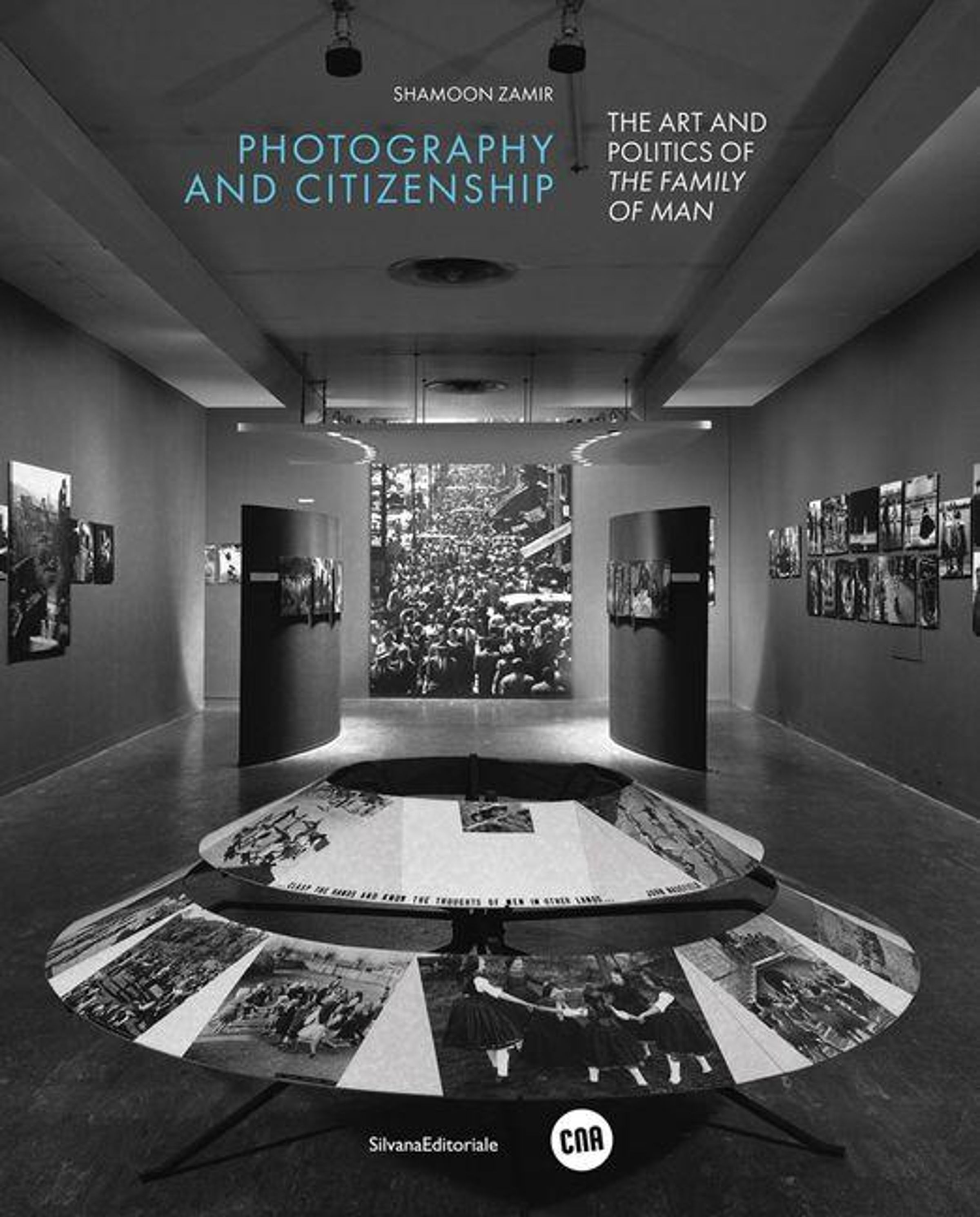 "Photography and Citizenship" und "The Art and Politics of The Family of Man" in einem Ausstellungsraum voller Fotos., Buch