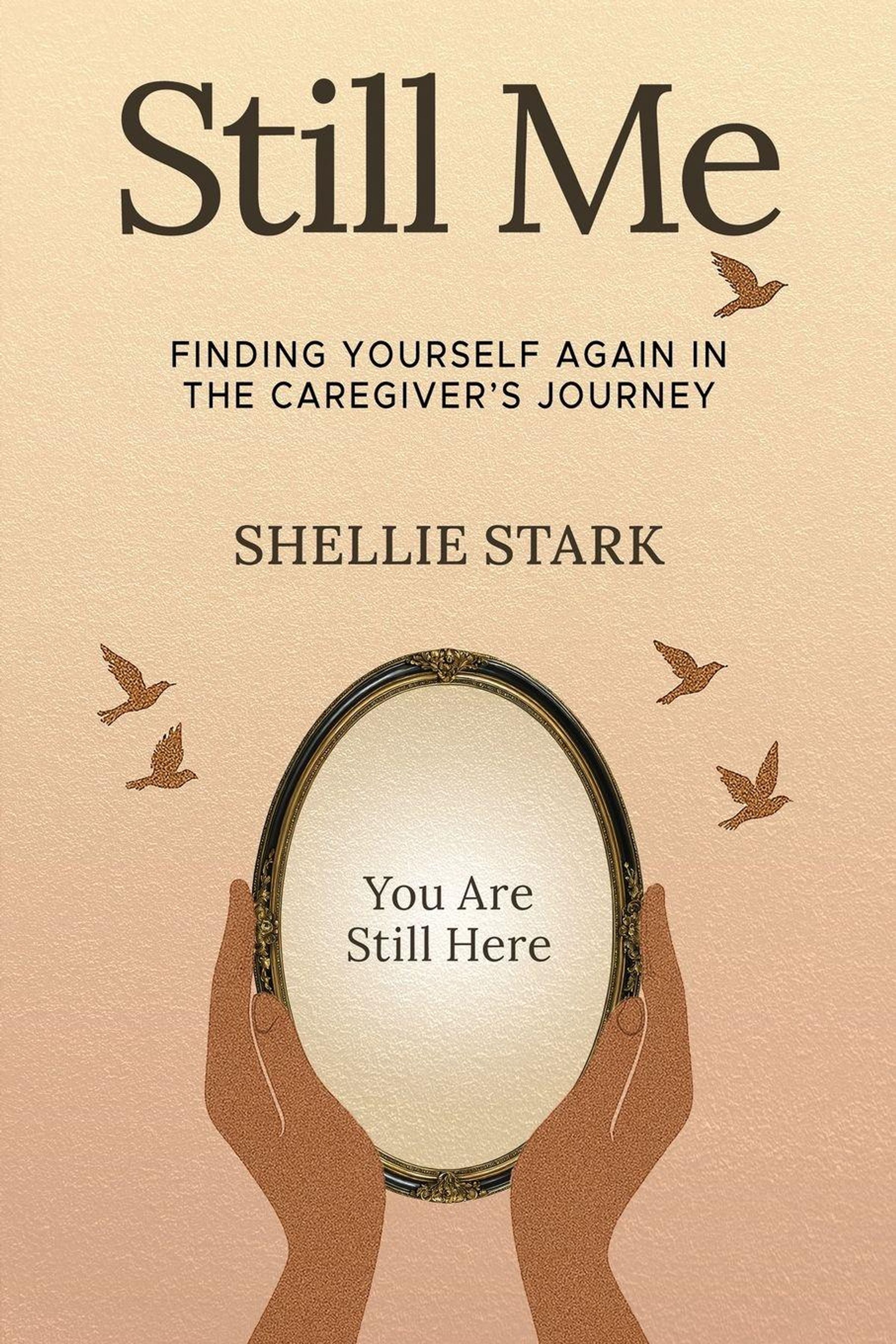 "Still Me" ist oben, "You Are Still Here" in einem Spiegel gehalten von braunen Händen. Fünf fliegende Vögel., Buch