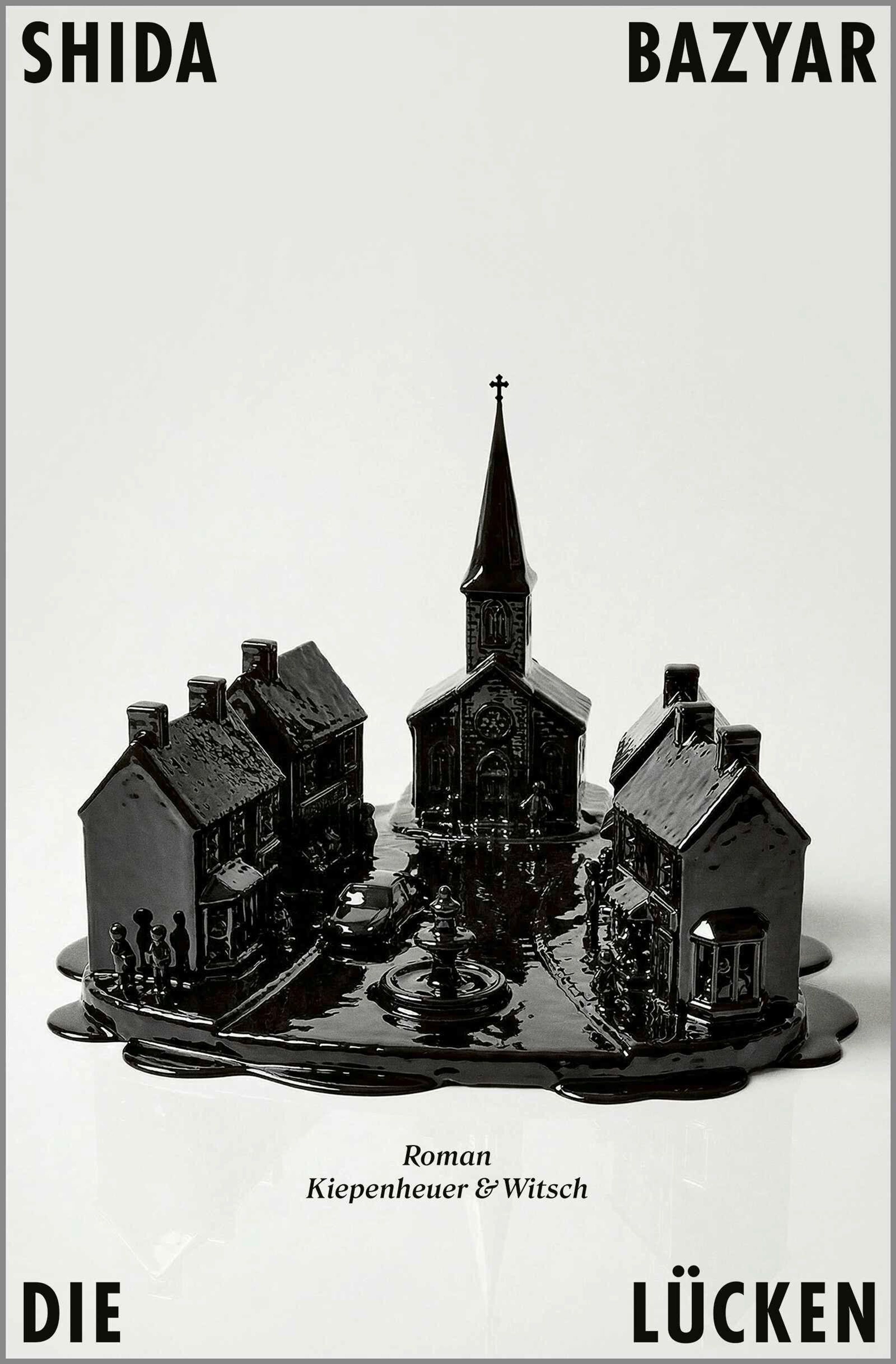 Text: "SHIDA BAZYAR", "DIE LÜCKEN", "Roman Kiepenheuer & Witsch". Darstellung eines geschmolzenen, schwarzen Dorfes., Buch