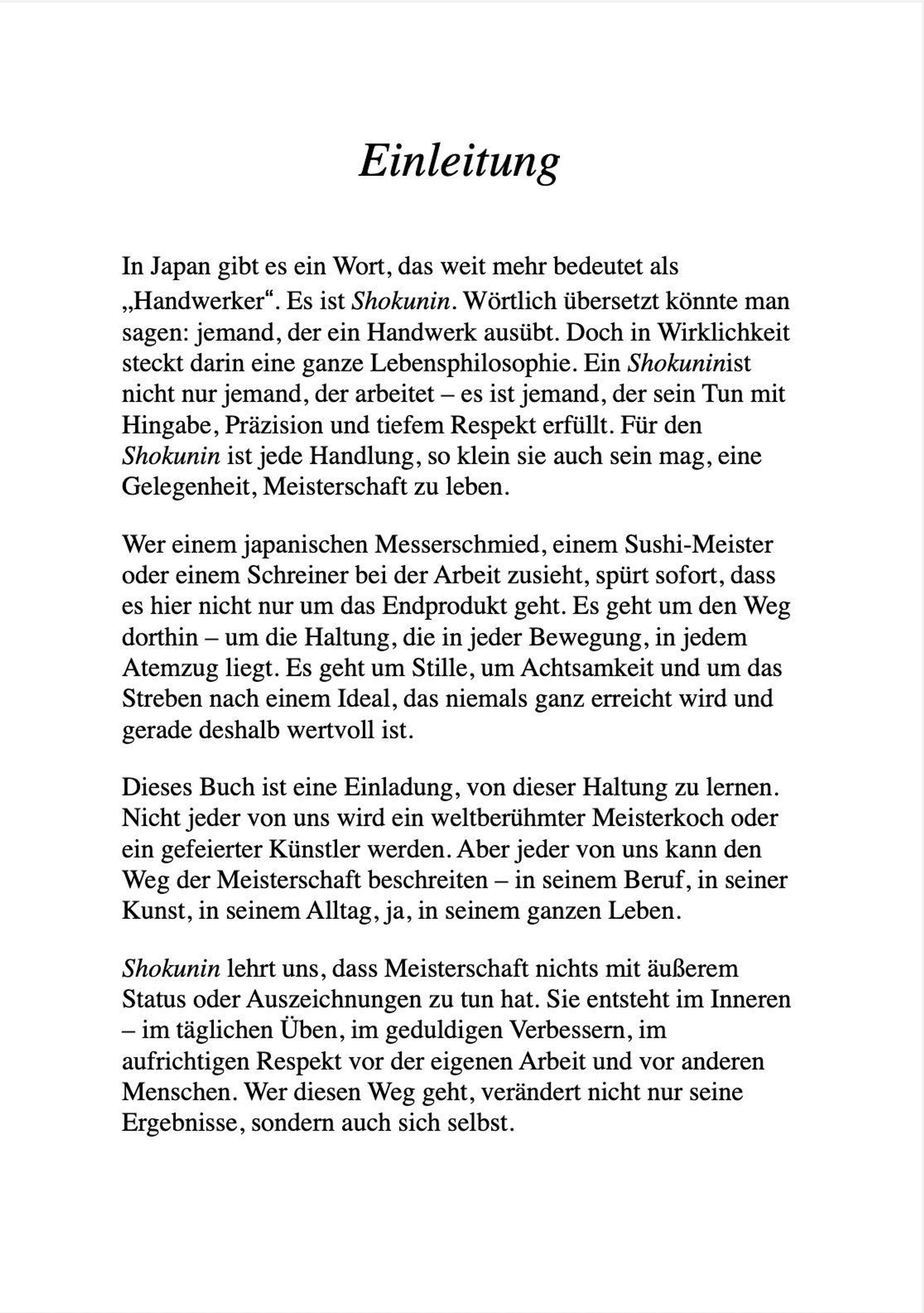 Shokunin - so nennen die Japaner Menschen, die ihre Arbeit mit Hingabe, Präzision und Respekt erfüllen. Ein Sushi-Meister, der seit Jahrzehnten denselben Handgriff übt. Ein Schreiner, der Holz wie ein lebendiges Wesen behandelt. Ein Töpfer, der Schönheit in Unvollkommenheit findet. Sie alle zeigen: Meisterschaft entsteht nicht im Ergebnis, sondern im Prozess.
