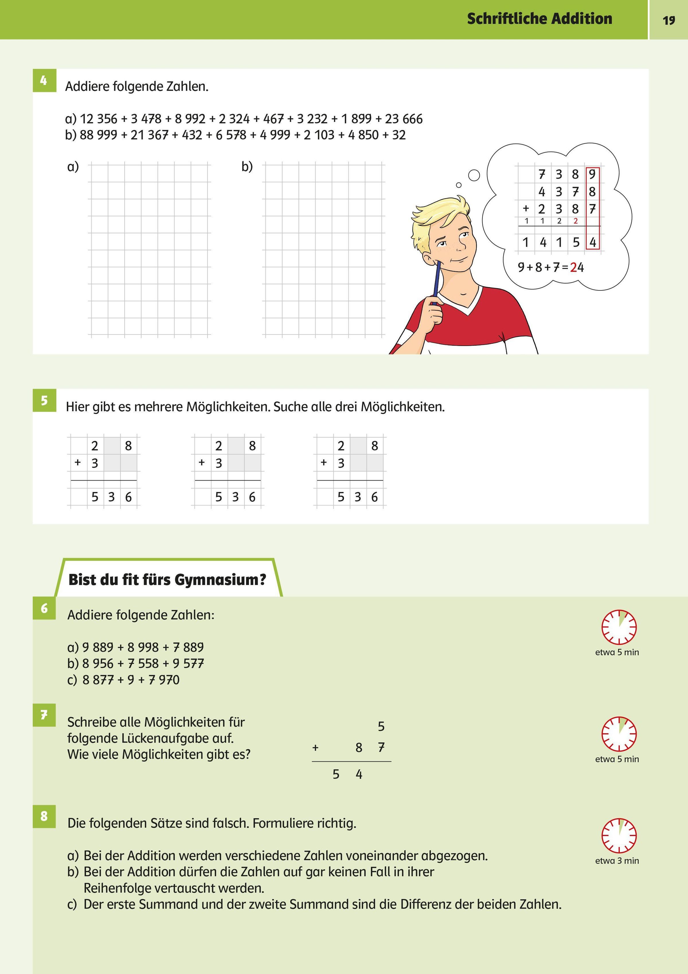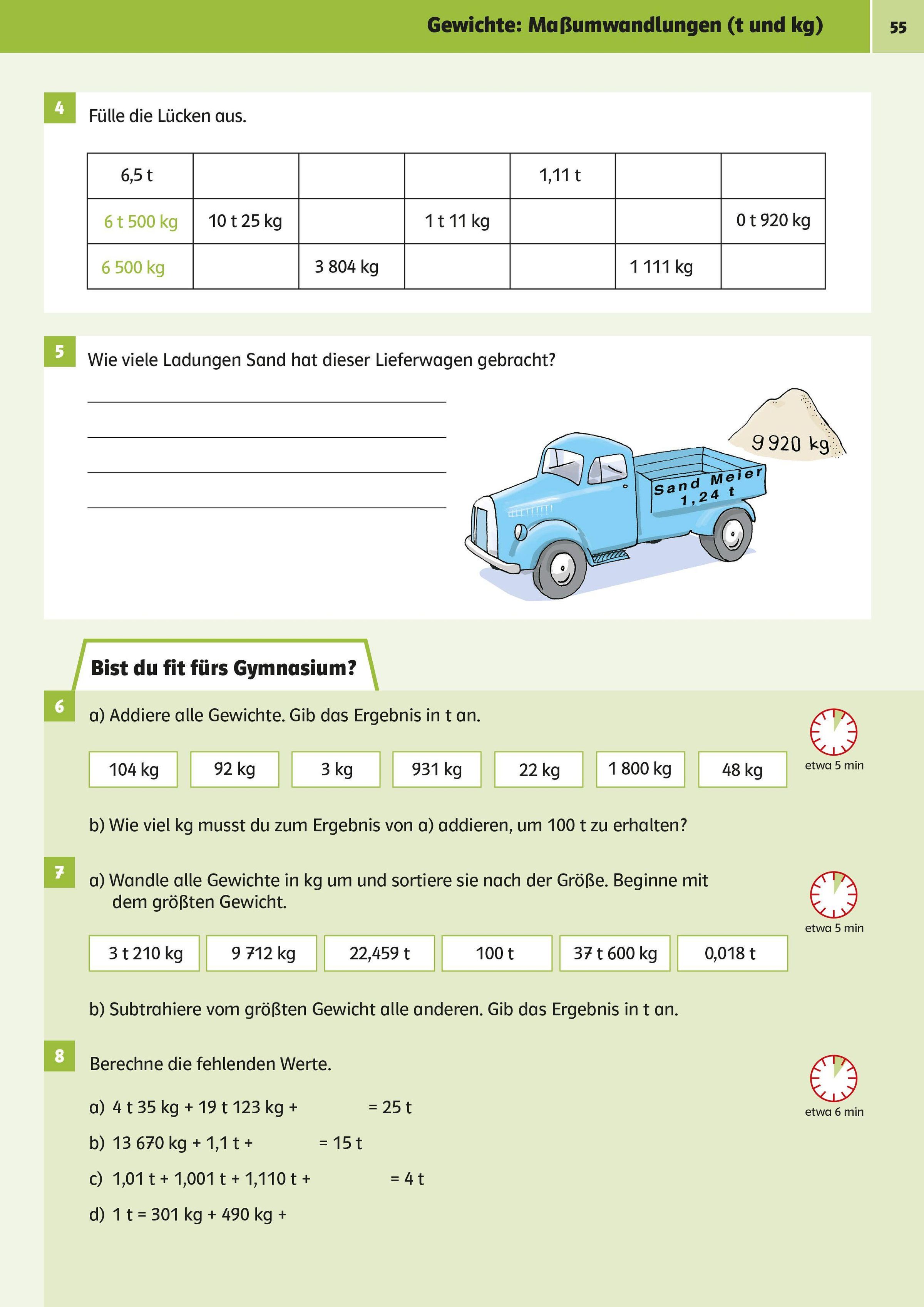 Auf jeder Doppelseite gibt es spezielle Übungen mit Zeitangaben, die künftige Gymnasiasten können müssen.