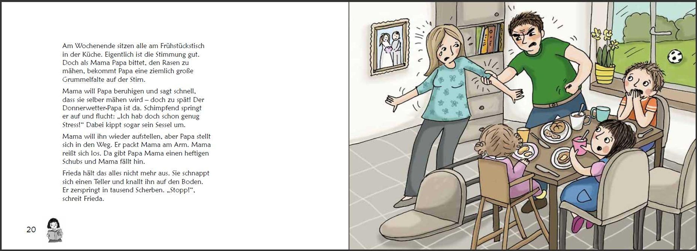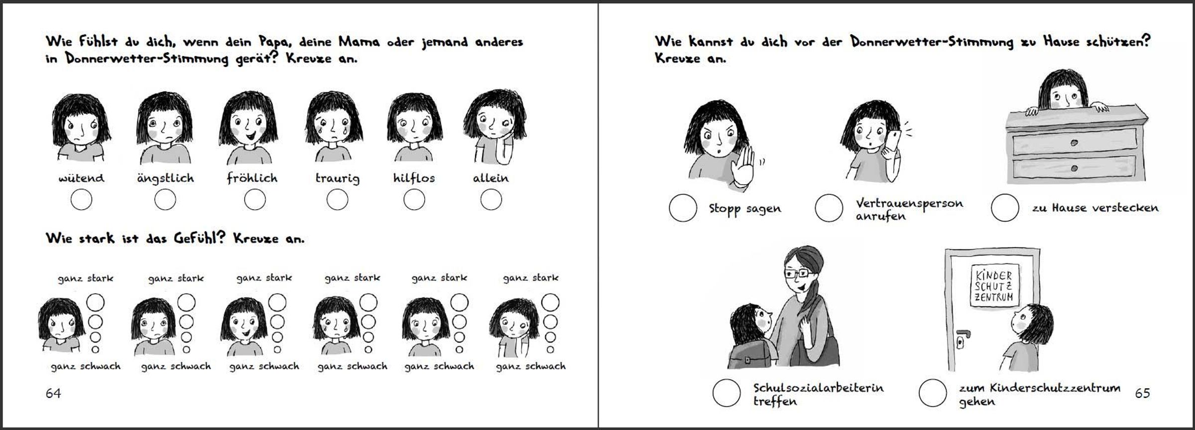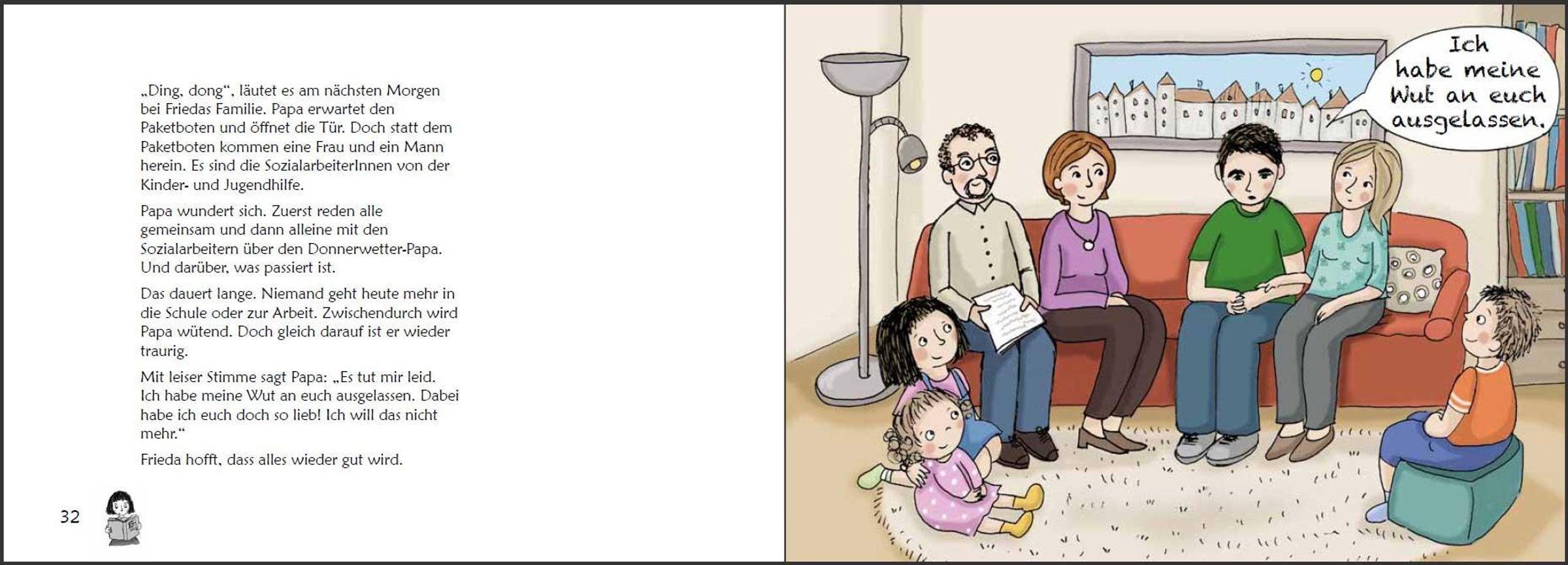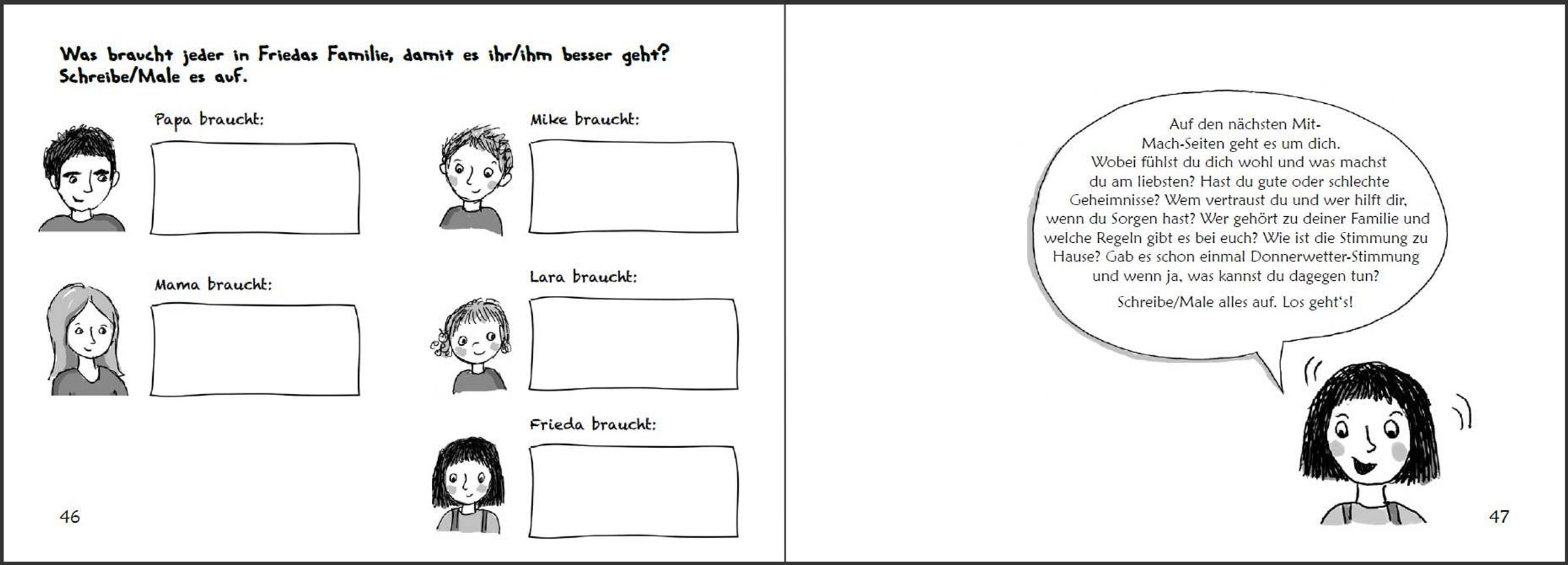 * Ab 6 Jahren * In vielen Familien läuft es ähnlich wie bei Frieda: Papa ist gestresst. Dann wird er laut und sogar grob. Mama und die Geschwister haben Angst vor Papas Donnerwetter und wissen sich nicht zu helfen. Die kindgerecht illustrierte Geschichte dieses Buches schreckt vor ernsten Themen nicht zurück. Denn wenn Gewalt im Spiel ist, muss klar sein: So nicht, Gewaltprävention geht uns alle an! Dass auch Kinder zur Lösung eines Gewalt-Problems beitragen können, zeigt Frieda: Sie fasst Mut und vertraut sich nach einem Kinderrechte-Projekttag in der Schule der Schulsozialarbeiterin an. Auf diese Weise erhält die ganze Familie tatkräftige Unterstützung. "Stark gegen Gewalt" ist ein original SOWAS!-Titel, der von Psychotherapeutin Mag. Sigrun Eder und Heilpädagogin Hannah-Marie Heine entwickelt wurde. Auf die farbenfroh illustrierte Bildergeschichte folgen zahlreiche Mit-Mach-Seiten. Diese leiten Kinder Schritt für Schritt vom Problem zur Lösung. Auf diese Weise ist gewährleistet, dass jedes Kind weiß, was in schwierigen Situationen zu tun ist. Inhaltlich wird dabei die Aufmerksamkeit zuerst auf die Lebenswelt von Frieda gelenkt und dann auf jene des Kindes. Die persönlichen Antworten können auf gut beschreibbarem Papier angekreuzt, aufgeschrieben oder aufgemalt werden. Als Bonus-Material gibt es Frieda und ihre "Stark gegen Gewalt"-Fähigkeiten zum Ausmalen und Ausschneiden. Auf Karton geklebt können Kinder so ihre "Stark gegen Gewalt"-Erinnerungskärtchen basteln. Diese befähigen sie, in Konfliktsituationen gewaltfrei zu handeln. Kinder lernen in "Stark gegen Gewalt", Konflikte und verschiedene Arten von Gewalt zu unterscheiden. Die vermittelten Konfliktlösefähigkeiten helfen dabei, Auseinandersetzungen gewaltfrei zu lösen. Außerdem werden Kinder dazu ermutigt, selbst erlebte oder beobachtete Gewalt anzusprechen und durch cleveres Verhalten zu stoppen. Eltern, Pädagogen, Sozialarbeitern, Psychotherapeuten und allen, die mit Kindern arbeiten, hilft "Stark gegen Gewalt", gewalttätiges Verhalten sichtbar zu machen und der Eskalation von Konflikten durch Gewaltfreie Kommunikation und Resilienz wirkungsvoll vorzubeugen. Daher ist dieses Buch nicht nur für Betroffene geeignet, sondern dient auch zur Gewaltprävention in Familien, an Schulen und in allen Betreuungseinrichtungen. SOWAS!-Titel sind in einfacher Sprache verfasst und erweitern den kindlichen Wortschatz. Unsere handlichen Sachbücher genießen das Vertrauen von Tausenden Anwendern. www. sowas-buch. de