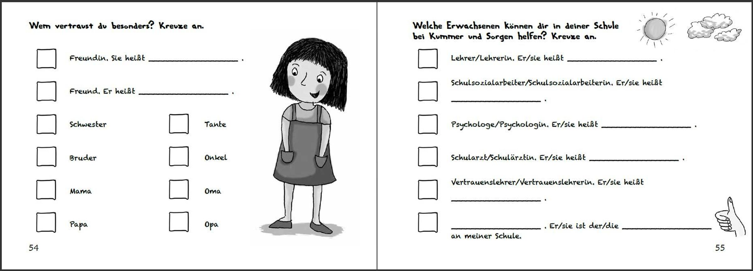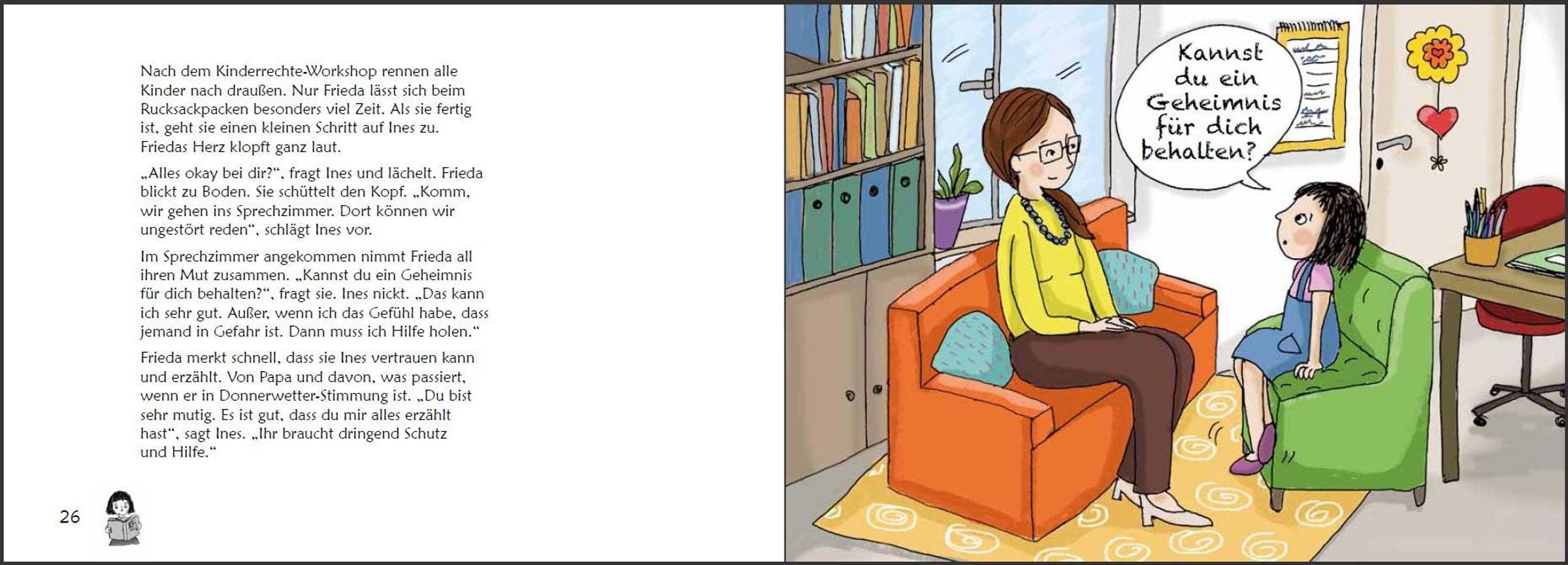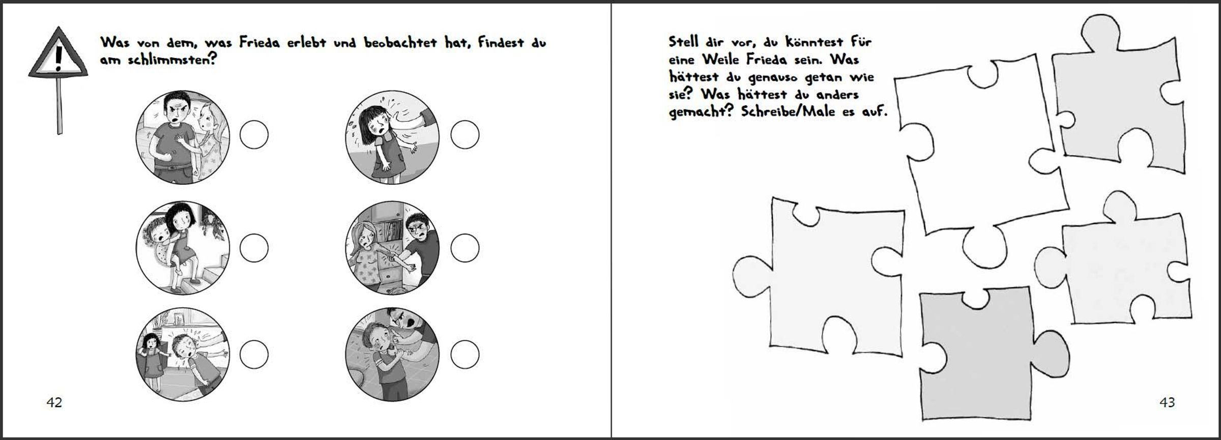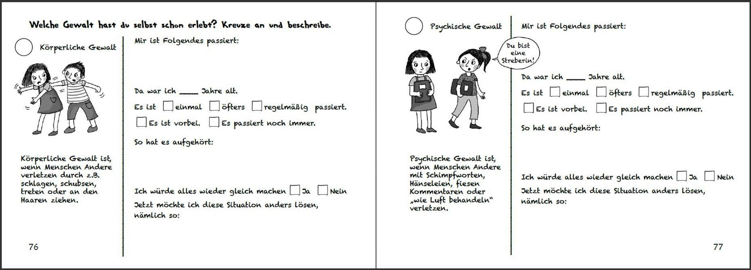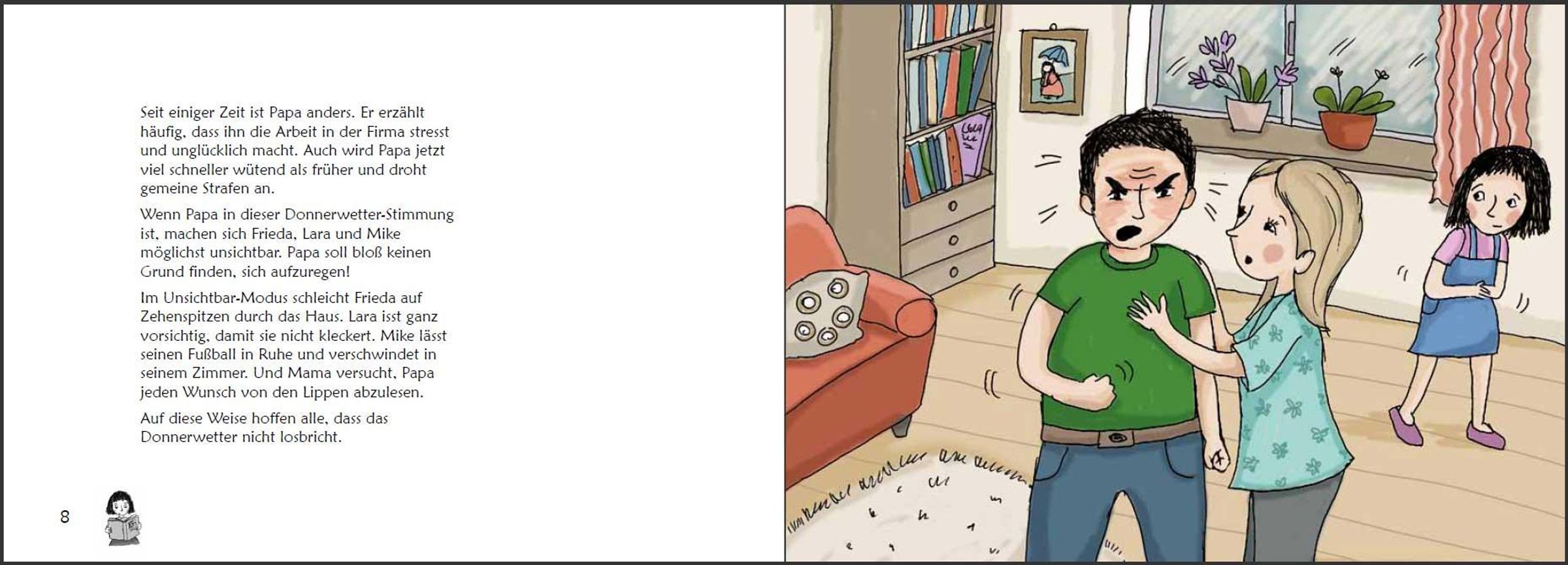 * Ab 6 Jahren * In vielen Familien läuft es ähnlich wie bei Frieda: Papa ist gestresst. Dann wird er laut und sogar grob. Mama und die Geschwister haben Angst vor Papas Donnerwetter und wissen sich nicht zu helfen. Die kindgerecht illustrierte Geschichte dieses Buches schreckt vor ernsten Themen nicht zurück. Denn wenn Gewalt im Spiel ist, muss klar sein: So nicht, Gewaltprävention geht uns alle an! Dass auch Kinder zur Lösung eines Gewalt-Problems beitragen können, zeigt Frieda: Sie fasst Mut und vertraut sich nach einem Kinderrechte-Projekttag in der Schule der Schulsozialarbeiterin an. Auf diese Weise erhält die ganze Familie tatkräftige Unterstützung. "Stark gegen Gewalt" ist ein original SOWAS!-Titel, der von Psychotherapeutin Mag. Sigrun Eder und Heilpädagogin Hannah-Marie Heine entwickelt wurde. Auf die farbenfroh illustrierte Bildergeschichte folgen zahlreiche Mit-Mach-Seiten. Diese leiten Kinder Schritt für Schritt vom Problem zur Lösung. Auf diese Weise ist gewährleistet, dass jedes Kind weiß, was in schwierigen Situationen zu tun ist. Inhaltlich wird dabei die Aufmerksamkeit zuerst auf die Lebenswelt von Frieda gelenkt und dann auf jene des Kindes. Die persönlichen Antworten können auf gut beschreibbarem Papier angekreuzt, aufgeschrieben oder aufgemalt werden. Als Bonus-Material gibt es Frieda und ihre "Stark gegen Gewalt"-Fähigkeiten zum Ausmalen und Ausschneiden. Auf Karton geklebt können Kinder so ihre "Stark gegen Gewalt"-Erinnerungskärtchen basteln. Diese befähigen sie, in Konfliktsituationen gewaltfrei zu handeln. Kinder lernen in "Stark gegen Gewalt", Konflikte und verschiedene Arten von Gewalt zu unterscheiden. Die vermittelten Konfliktlösefähigkeiten helfen dabei, Auseinandersetzungen gewaltfrei zu lösen. Außerdem werden Kinder dazu ermutigt, selbst erlebte oder beobachtete Gewalt anzusprechen und durch cleveres Verhalten zu stoppen. Eltern, Pädagogen, Sozialarbeitern, Psychotherapeuten und allen, die mit Kindern arbeiten, hilft "Stark gegen Gewalt", gewalttätiges Verhalten sichtbar zu machen und der Eskalation von Konflikten durch Gewaltfreie Kommunikation und Resilienz wirkungsvoll vorzubeugen. Daher ist dieses Buch nicht nur für Betroffene geeignet, sondern dient auch zur Gewaltprävention in Familien, an Schulen und in allen Betreuungseinrichtungen. SOWAS!-Titel sind in einfacher Sprache verfasst und erweitern den kindlichen Wortschatz. Unsere handlichen Sachbücher genießen das Vertrauen von Tausenden Anwendern. www. sowas-buch. de