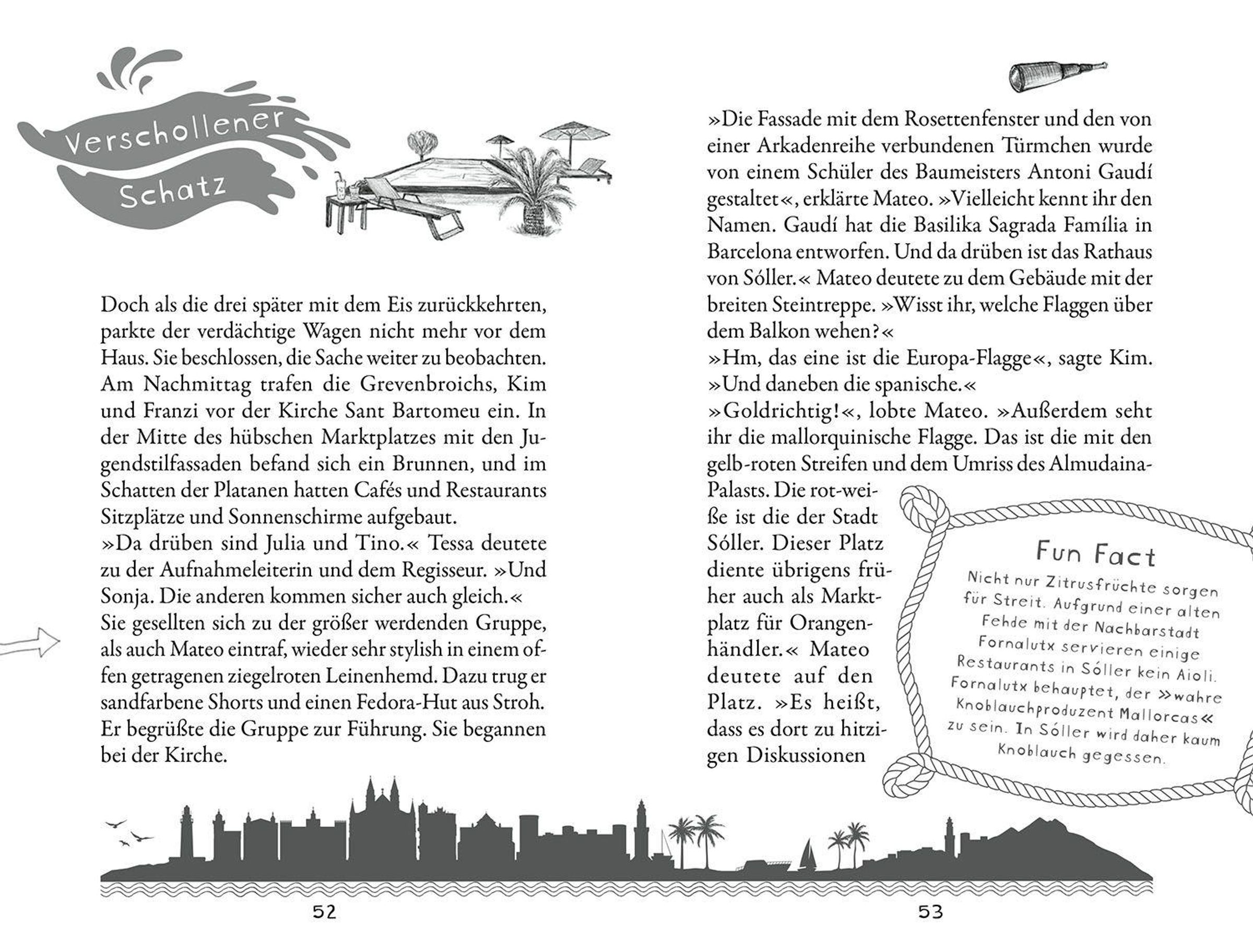 Mallorca, Sonne - und ein neuer Fall: Kim und Franzi begleiten Marie und ihre Familie zu Dreharbeiten nach Sóller. Das Ferienhaus an der Küste scheint der perfekte Ort zum Entspannen, doch kaum haben sie ihre Koffer ausgepackt, häufen sich in der Umgebung geheimnisvolle Einbrüche - und das gerade jetzt, wo im Ort das große Piratenfest stattfindet. Wer steckt dahinter? Ein gewöhnlicher Dieb oder etwa der Geist einer Piratin, die einst einen Schatz hier versteckt haben soll? Zusammen mit einem jungen Touristenführer begeben sich die drei !!! auf Spurensuche, entdecken verborgene Winkel der Insel und lassen sich von alten Geschichten und geheimnisvollen Hinweisen leiten. Zwischen Olivenhainen, Festtrubel und unerwarteten Begegnungen erleben sie ein Mallorca, das voller Rätsel steckt - und in dem Mut, Freundschaft und Spürsinn gefragt sind.