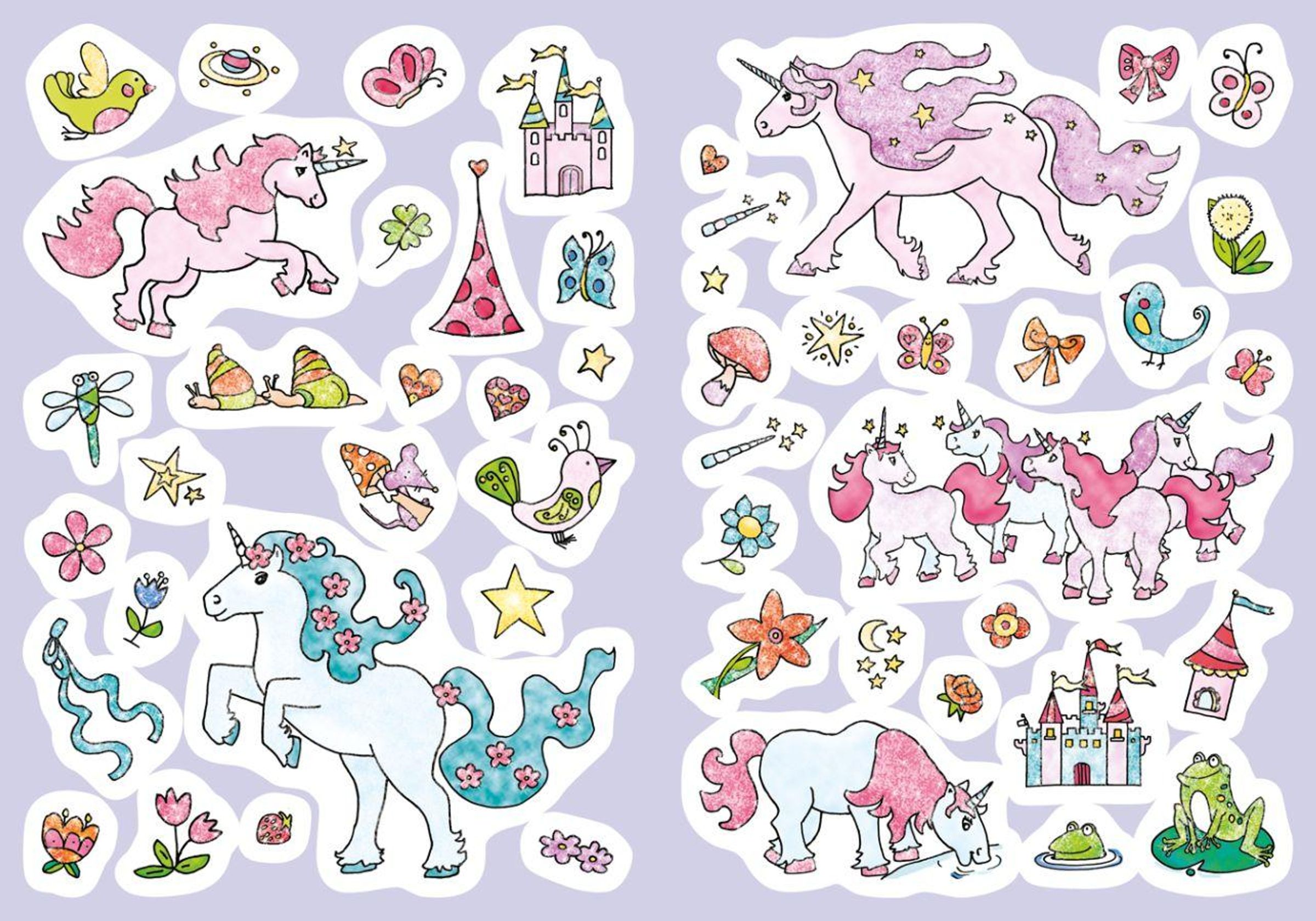 Einhörner stehen als Symbol für das Gute. Und sie sollen Glück bringen, sagt die Legende. In jedem Fall aber werden kleine Künstler großen Spaß daran haben, die zauberhafte Welt in diesem Malbuch nach Lust und Laune auszumalen. Die 45 großflächigen, glitzernden Sticker auf dem Bogen in der Heftmitte machen die Bilder noch schöner.