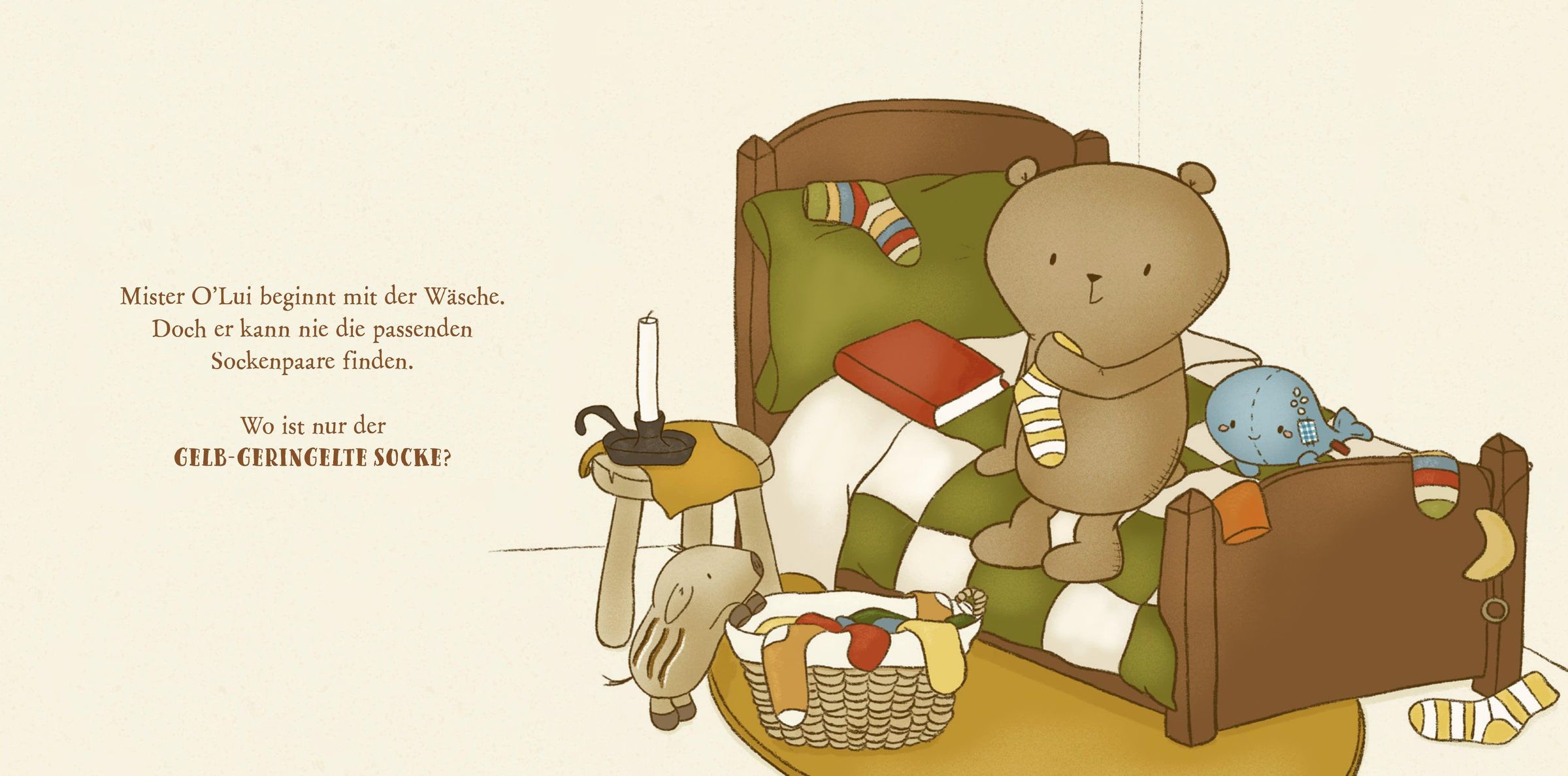 Nanu, wie sieht es denn hier aus? Biberbär Mister O'Lui und sein bester Freund, das Streifenschwein Rupert, müssen dringend aufräumen. Doch das ist leichter gesagt als getan: In der Küche ist die zweite gelbe Tasse verschwunden, im Garten wird eine rote Schaufel vermisst, und irgendwo hat sich die zweite grün-geringelte Socke versteckt. Wer hat gut aufgepasst und kann Mister O'Lui zeigen, wo er suchen muss? Ein interaktives Mitmachbuch, mit dem Farbenlernen und Aufräumen Spaß bringen.