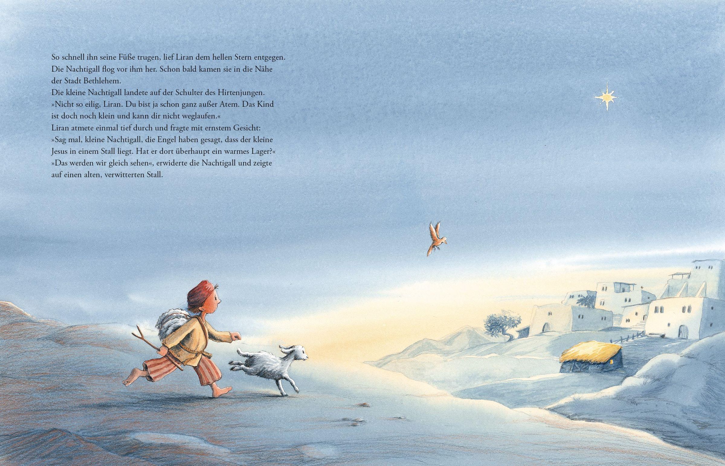 Der kleine Hirtenjunge Liran und seine Freunde, das Lämmchen und die Nachtigall, sie sind ganz aufgeregt. Denn in dieser Nacht ist etwas anders als sonst. Ein Engel erscheint und verkündet Jesu Geburt. Liran folgt dem Stern und ist der Erste im Stall. Der kleine Hirte schließt das Jesuskind sofort in sein Herz. Er bewacht es eifrig, als immer mehr Besucher kommen und der Trubel im Stall immer größer wird. Zusammen mit Lämmchen und Nachtigall sorgt Liran dafür, dass das Jesuskind endlich in Ruhe einschlafen kann.
