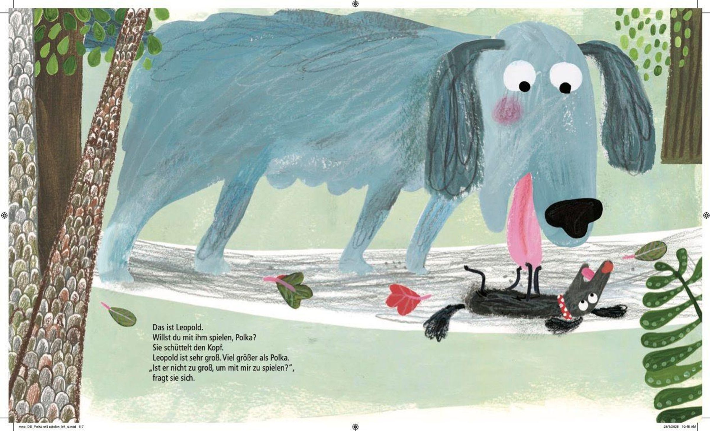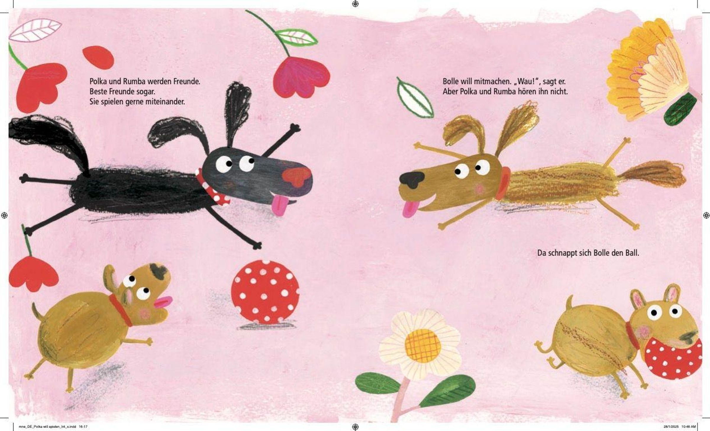 Polka sucht jemanden zum Spielen. Im Park trifft sie auf viele Hunde, aber sie sind alle anders als sie selbst: Leopold ist größer als sie, Georg ist länger und Sigi ist kürzer. Wie soll Polka mit ihnen spielen, wenn sie nicht so sind wie sie? Erst als ihr Ball verloren geht und die anderen Hunde ihr helfen, ihn wiederzubekommen, findet Polka das Selbstvertrauen, sich mit ihnen anzufreunden.