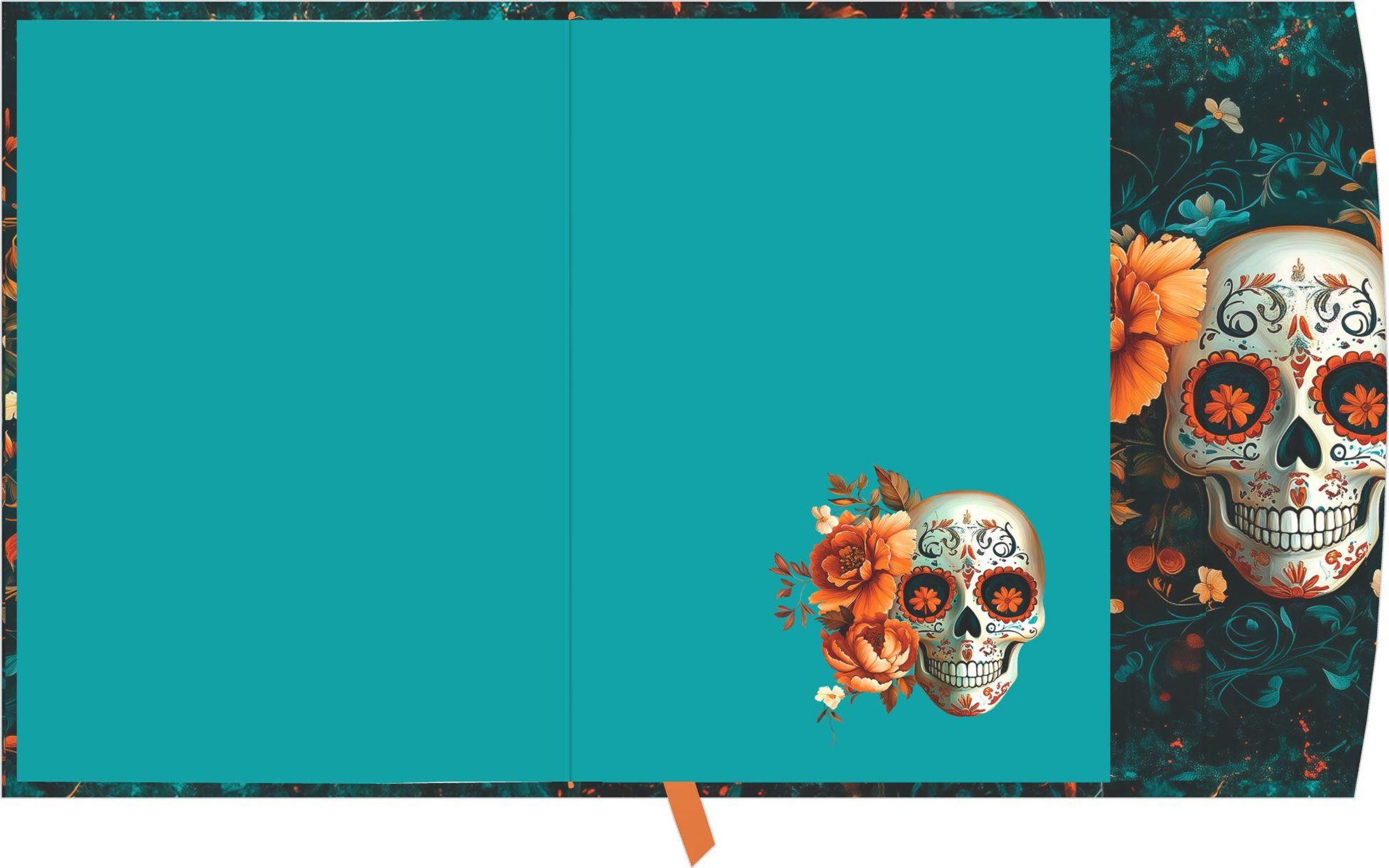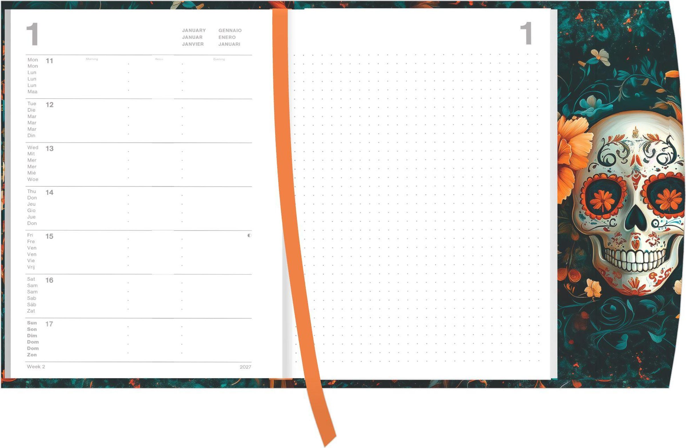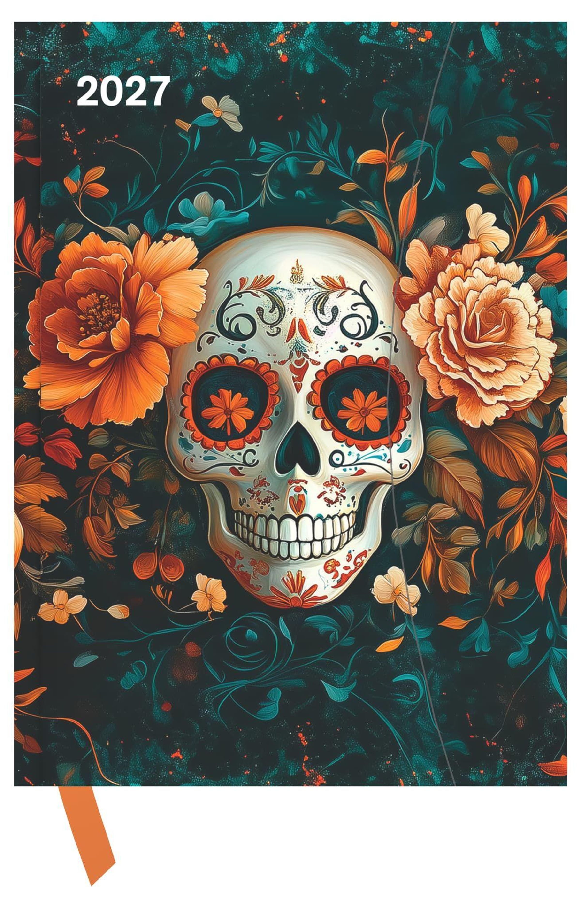 2027, ein dekorativer Totenschädel mit Blumen und Ornamenten in leuchtenden Farben umgeben von Blättern und Blüten., Buch