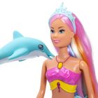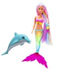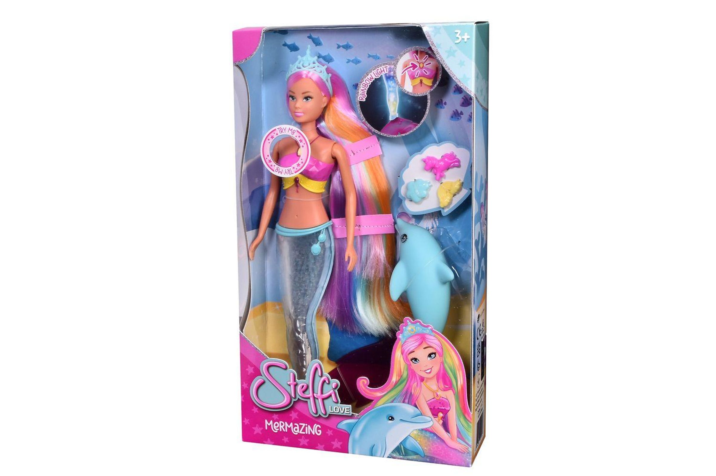 Als zauberhafte Meerjungfrau begeistert Steffi mit einer besonderen Funktion: Auf Knopfdruck leuchtet ihre Schwanzflosse in verschiedenen Farben und zeigt ein faszinierendes Farbspiel mit Regenbogeneffekt. Begleitet wird sie von ihrem Delfinfreund, der für zusätzlichen magischen Unterwasser-Spielspaß sorgt. Ein weiteres Highlight ist ihre regenbogenfarbene Traummähne - das extra lange, bunte Haar lässt sich wunderbar frisieren und mit den beiliegenden Haarclips kreativ stylen. Die Steffi LOVE Mermazing von Simba Toys ist für Kinder ab 3 Jahren geeignet,