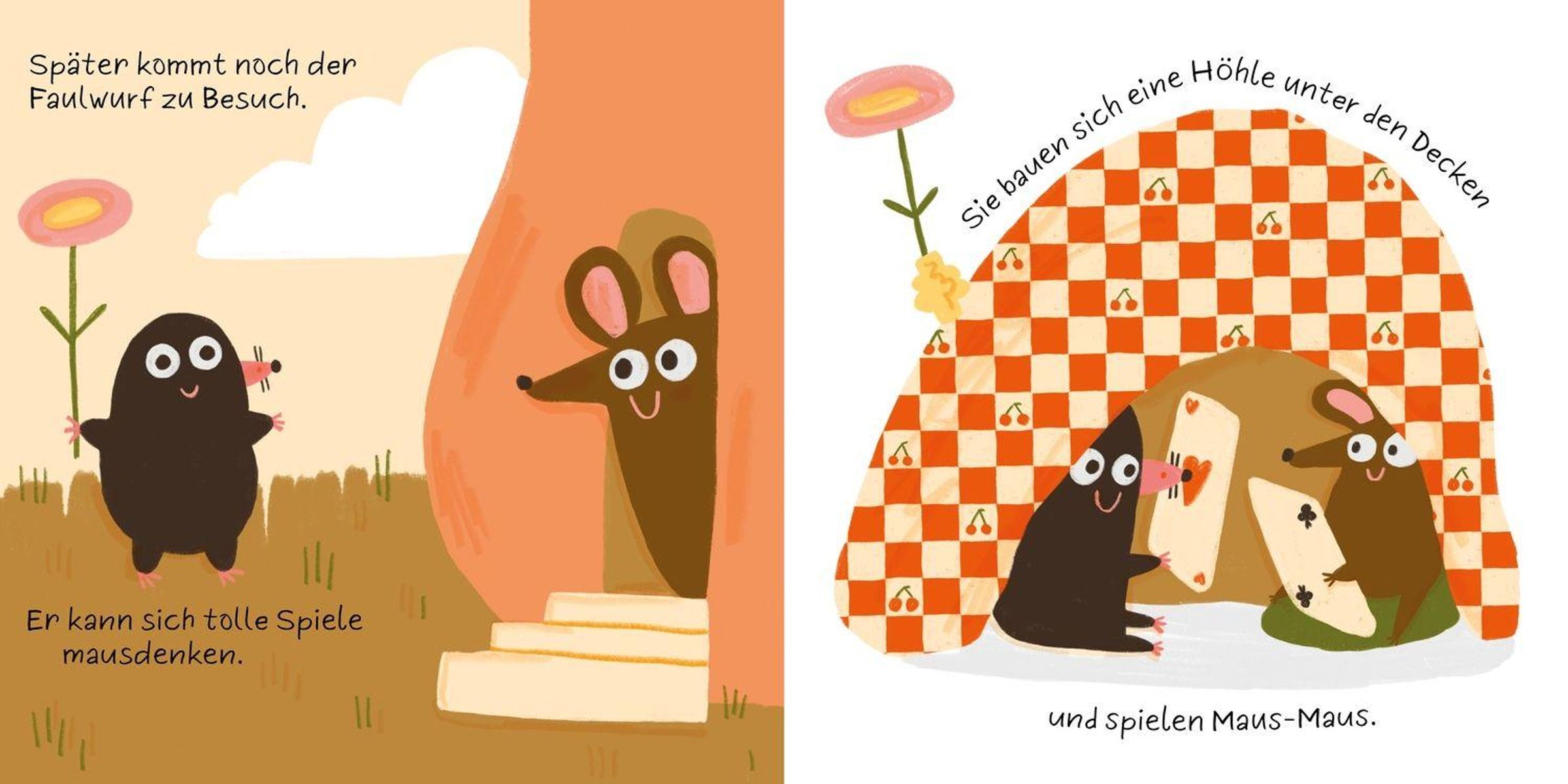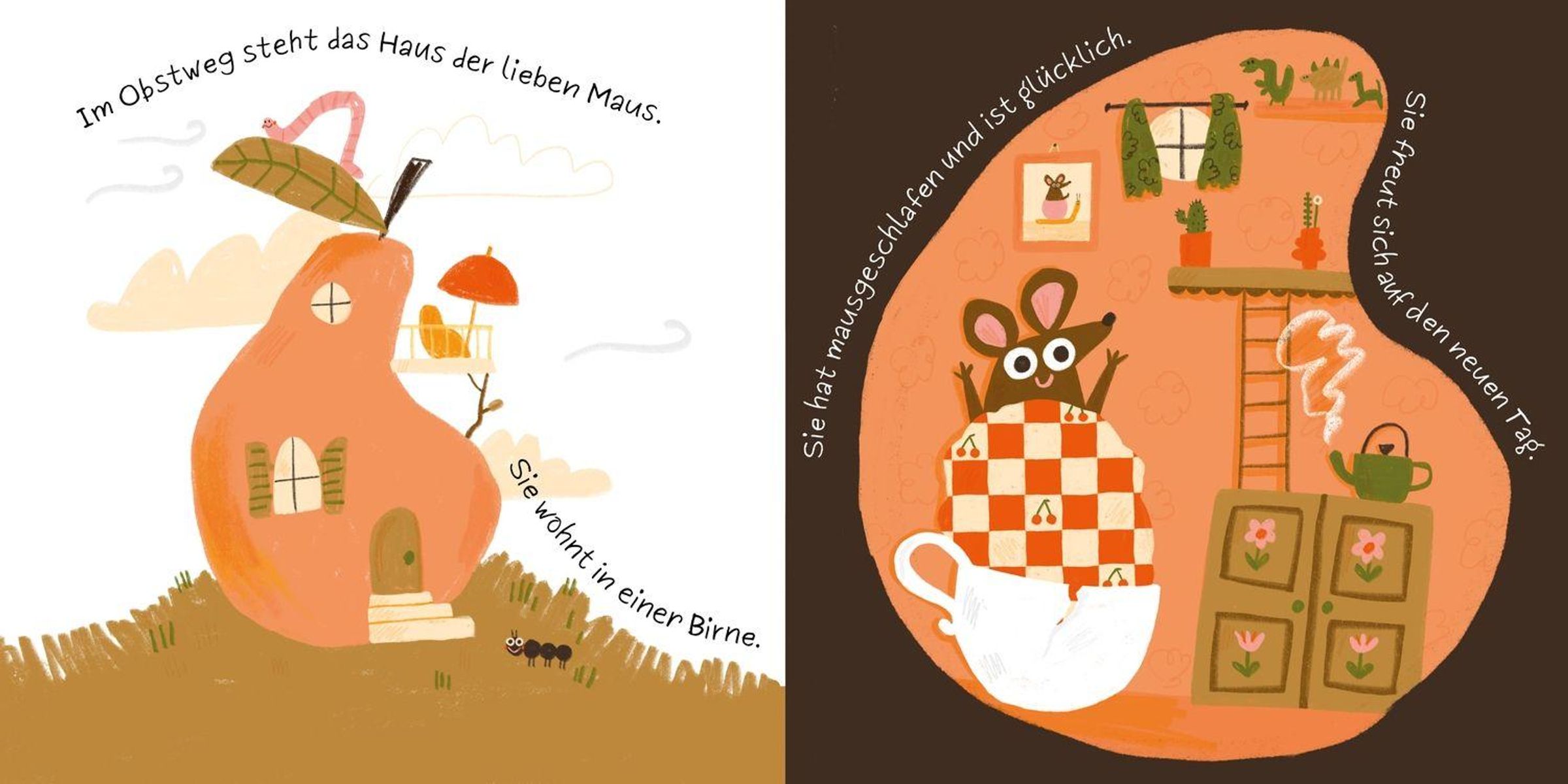 „Ein mausgezeichneter Tag“, „von Slinga“. Illustration: Maus auf großer Orange mit Wurm und Ameise daneben., Buch