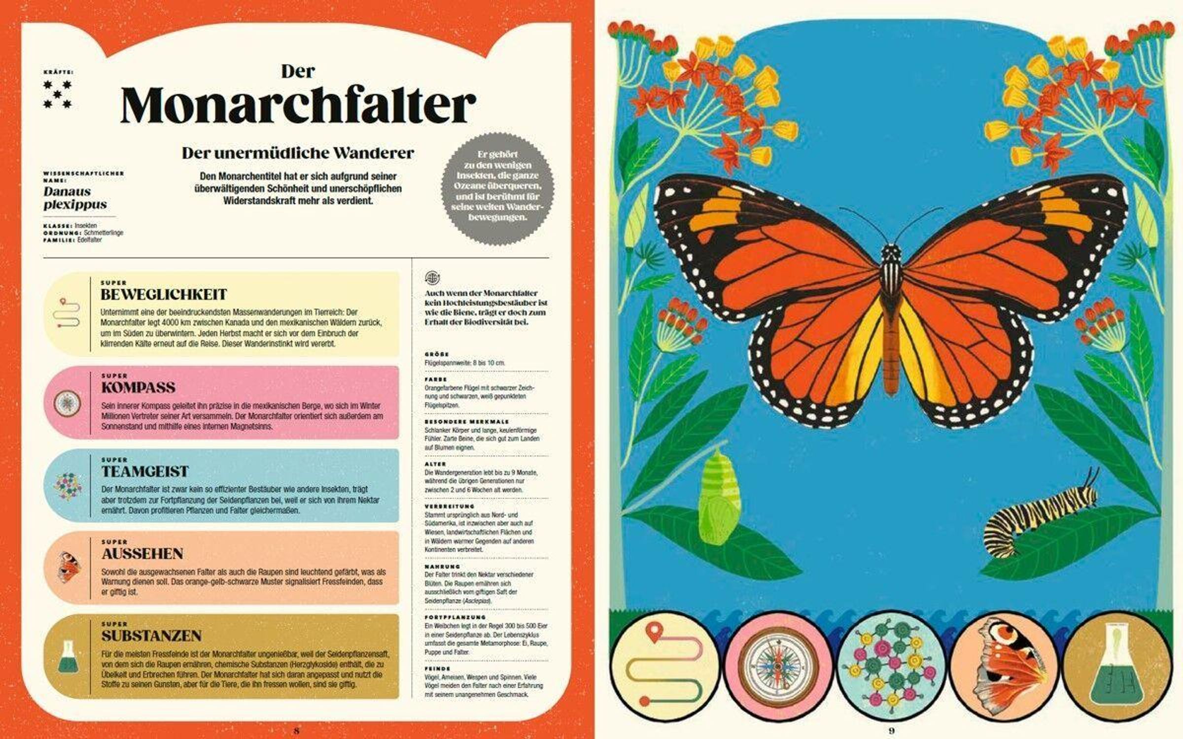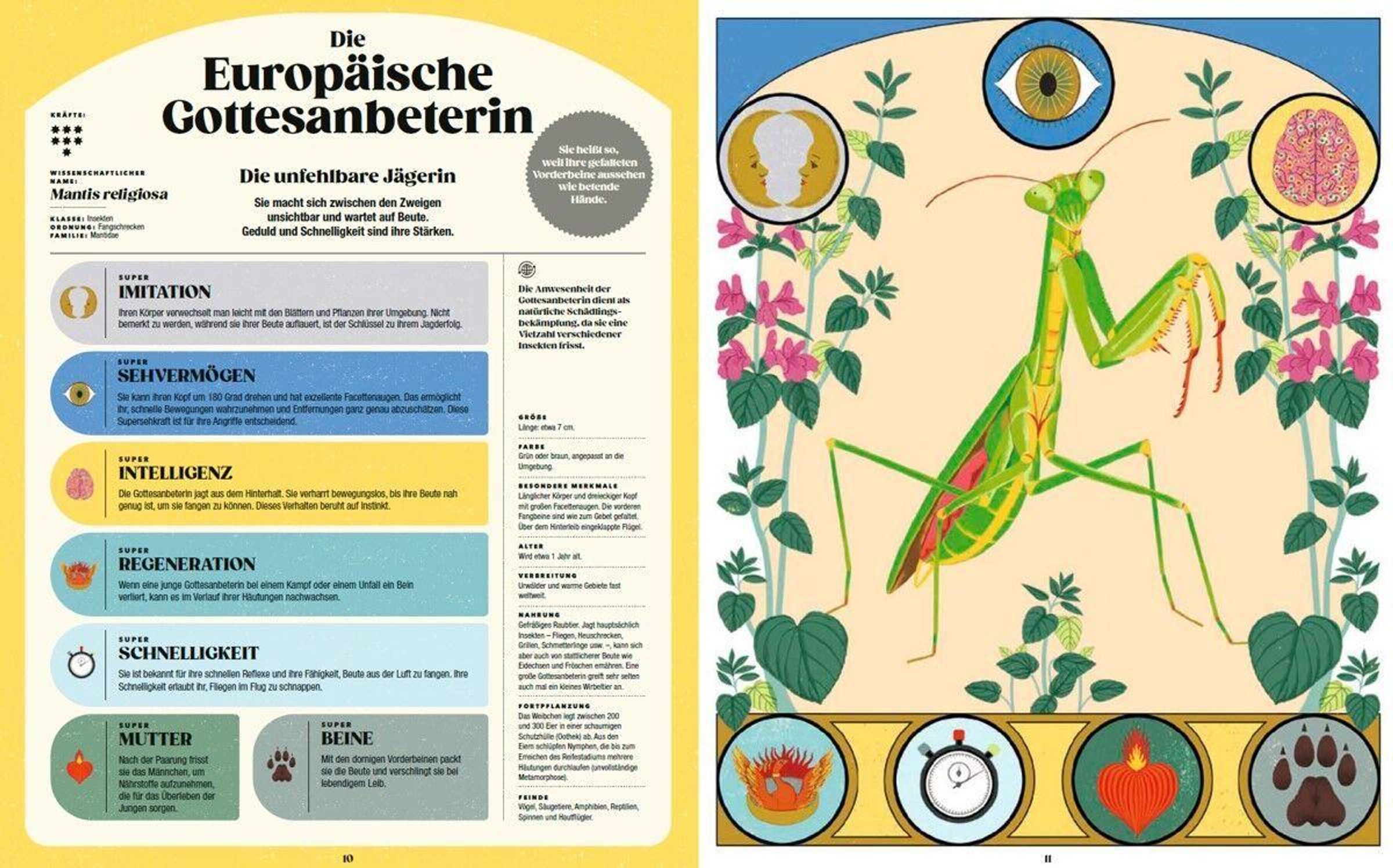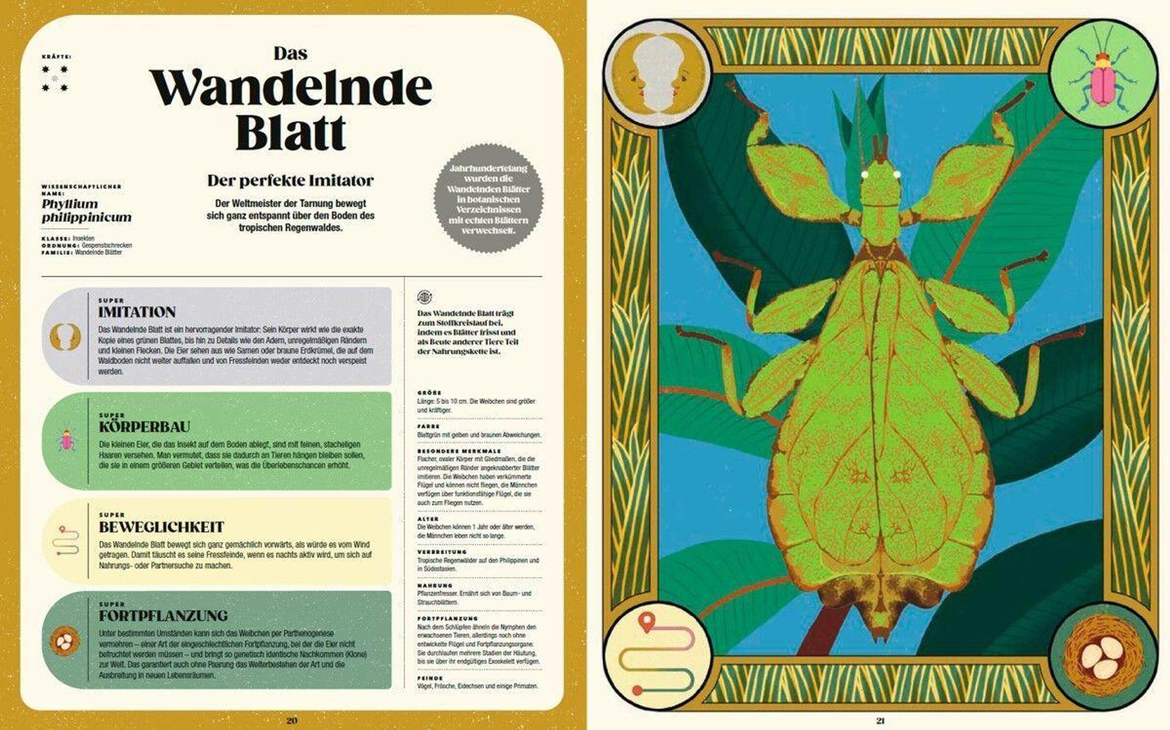 In diesem stilvoll gestalteten Buch lernen Kinder außergewöhnliche Insekten und ihre besonderen Fähigkeiten kennen. Es werden 22 Superkräfte wie "Superschnelligkeit", "Supersensoren" oder "Superanpassung" vorgestellt und den Insekten zugeordnet. Außerdem hat jedes Insekt eine Punktzahl, die anzeigt, wie stark es ist. So entdecken junge Tierforscher*innen spielend 22 erstaunliche Insekten und ihre Eigenschaften.