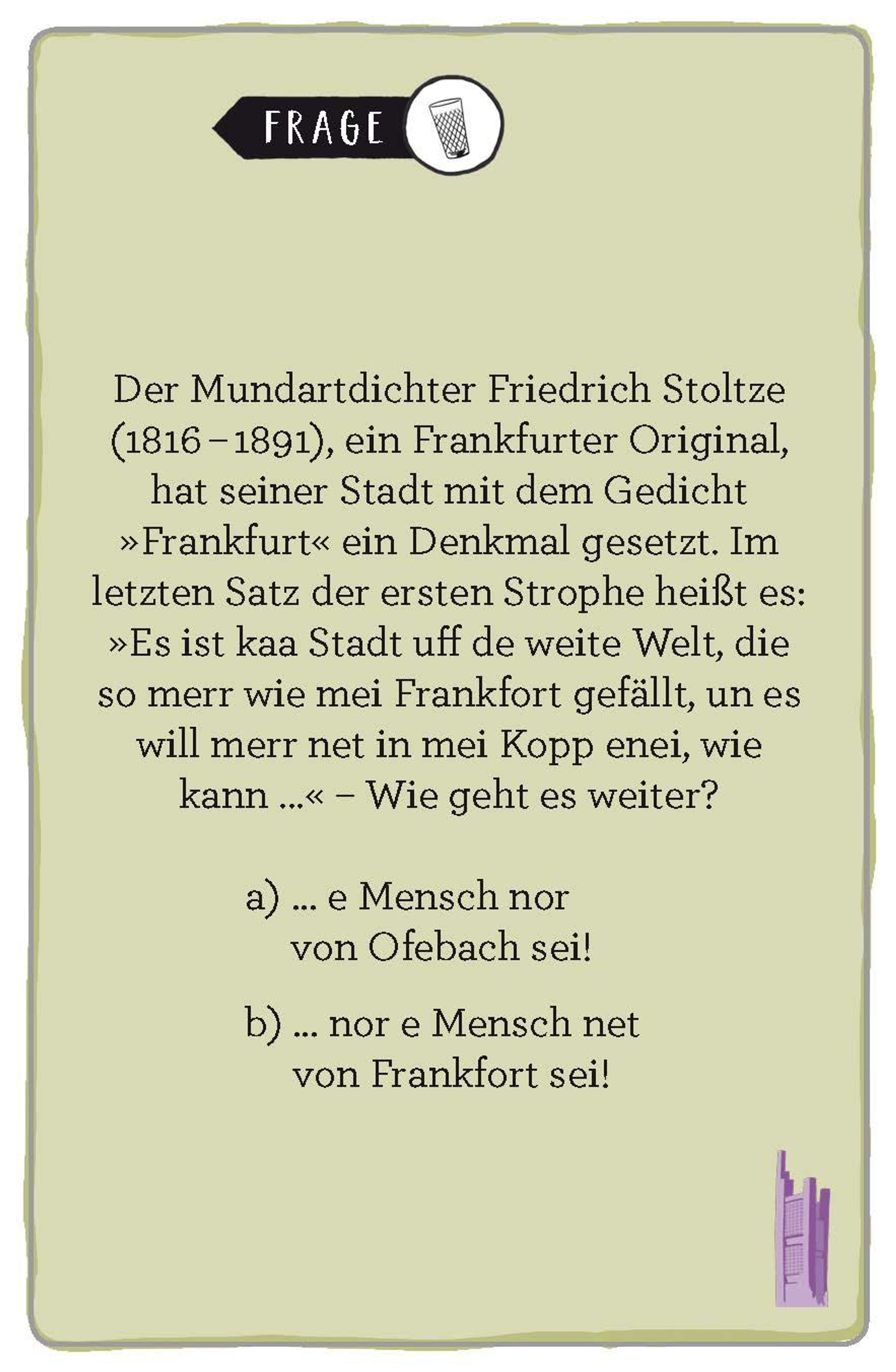 Wie gut kennst du Frankfurt? Mainhattan hat mehr zu bieten als Banken, Börse und Buchmesse: Hinter der imposanten Skyline verstecken sich hippe Szeneviertel, geschäftige Einkaufsstraßen, dörfliche Stadtteile, romantische Parks und überhaupt jede Menge Grün. Sonja Morawietz-Heinemann und Hartmut Heinemann kennen die versteckten Winkel und erzählen in 100 Fragen nicht alltägliche, verblüffende Geschichten rund um die Goethestadt. Eine wunderbar verspielte Liebeserklärung an Frankfurt!