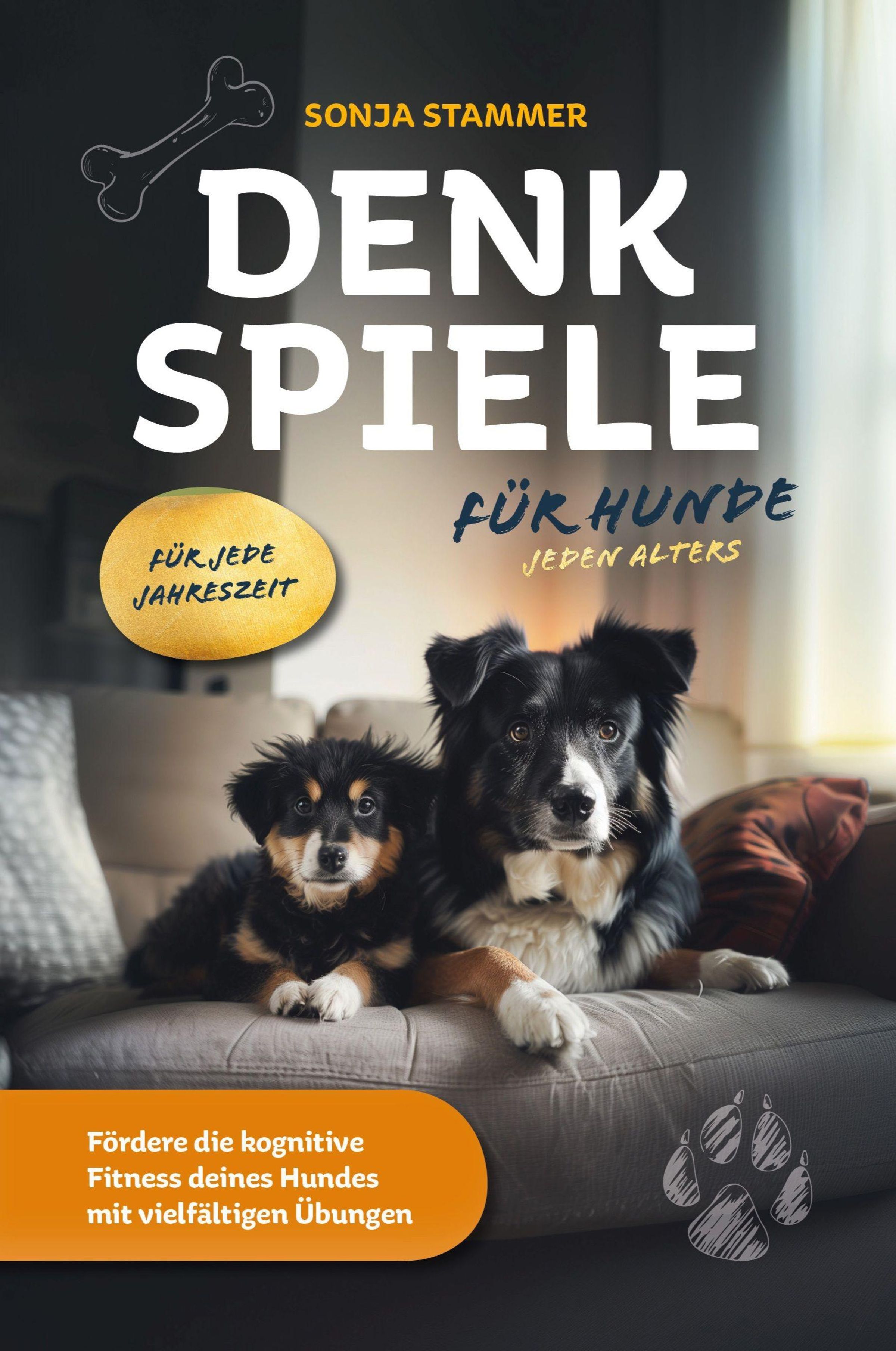 Buchtitel: "Denkspiele für Hunde". Text: "Für jede Jahreszeit", "Jeden Alters". Zwei Hunde auf einem Sofa., Buch
