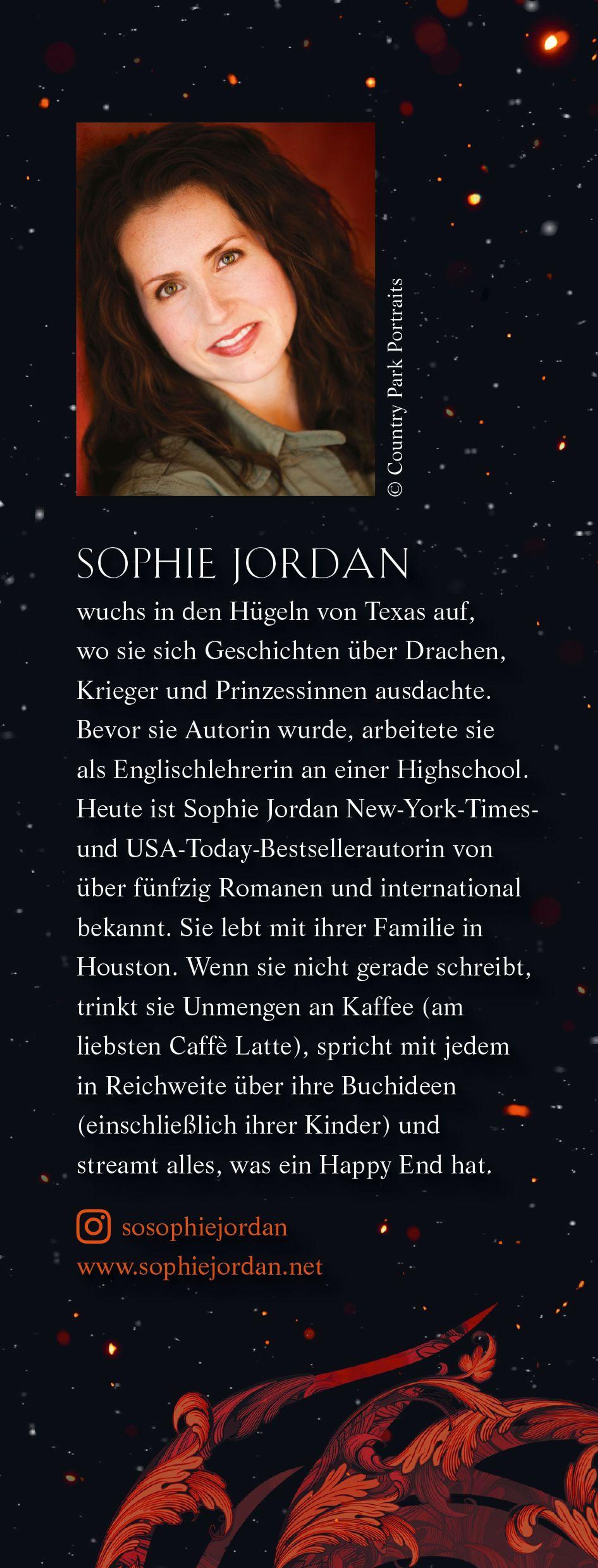 Sophie Jordan wuchs im Hügelland von Texas auf, das sie schon früh zu Geschichten über Drachen, Kämpfer und Prinzessinnen inspirierte. Neben Literatur für Jugendliche verfasst die ehemalige High School-Lehrerin auch historische Romane. Wenn sie nicht gerade schreibt, verbringt sie ihre Zeit gerne mit der Aufnahme von zuviel Koffein (am liebsten in Form von Latte macchiato und Cherry Cola) und bespricht Handlungsstränge mit jedem, der zuhört ihre Kinder eingeschlossen.§Heute lebt die Autorin mit ihrer Familie in Houston.Anmerkungen: