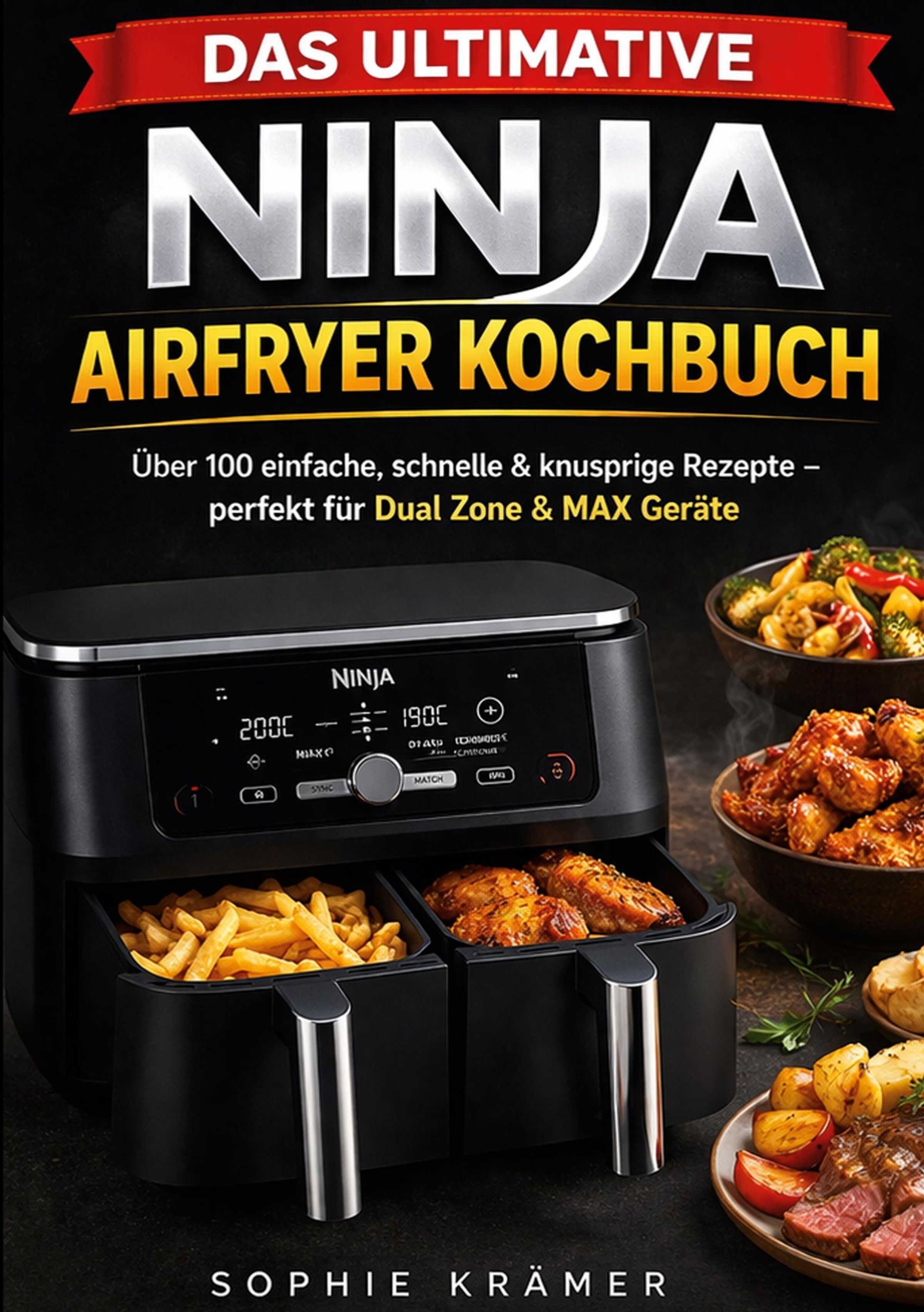 „Das ultimative Ninja Airfryer Kochbuch“. Schwarzer Airfryer mit Pommes und Hähnchen. Teller mit Gemüse und Fleisch., Buch