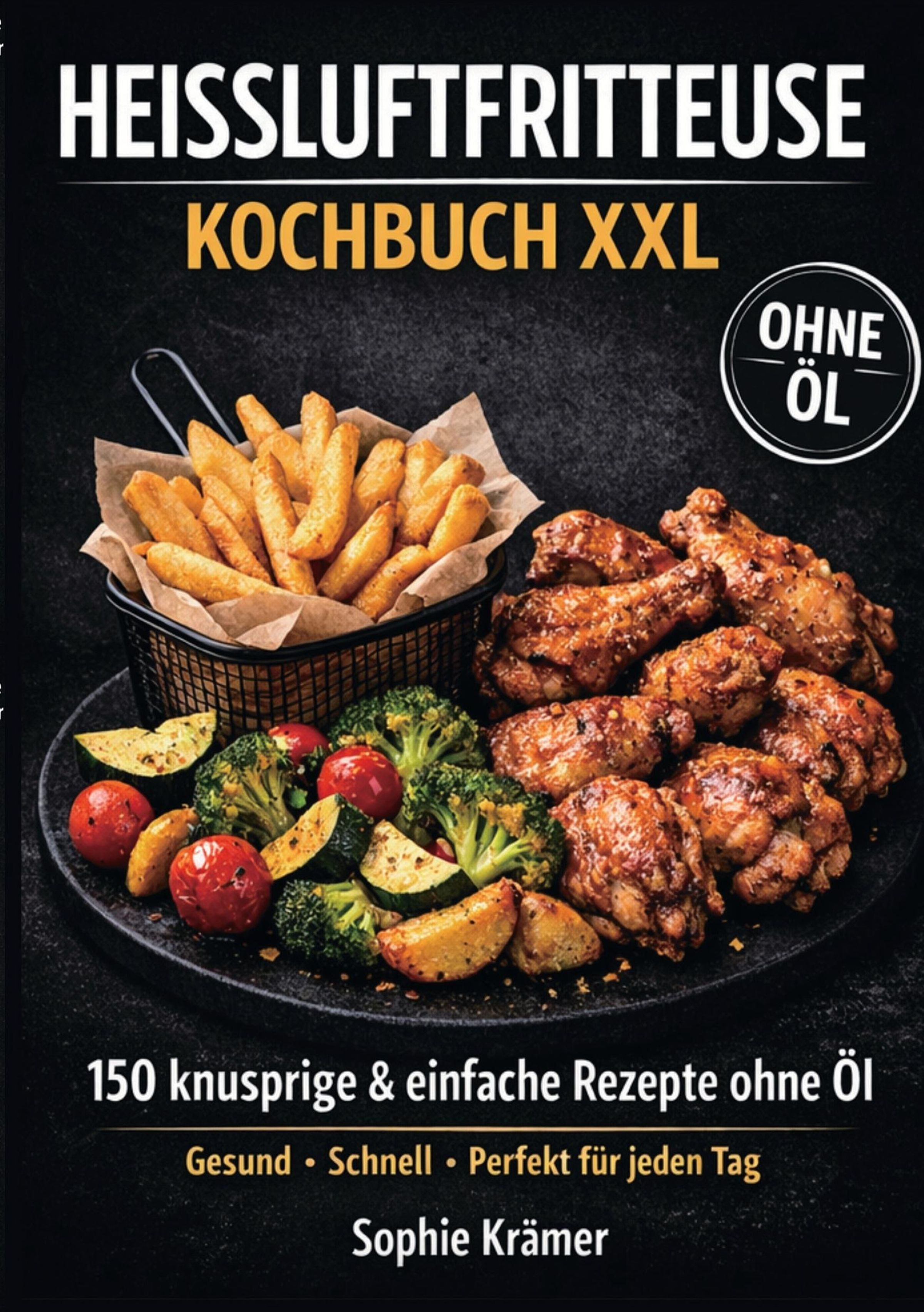 "Heißluftfritteuse Kochbuch XXL", "Ohne Öl", "150 knusprige & einfache Rezepte", Speisen mit Pommes, Gemüse und Hähnchen., Buch