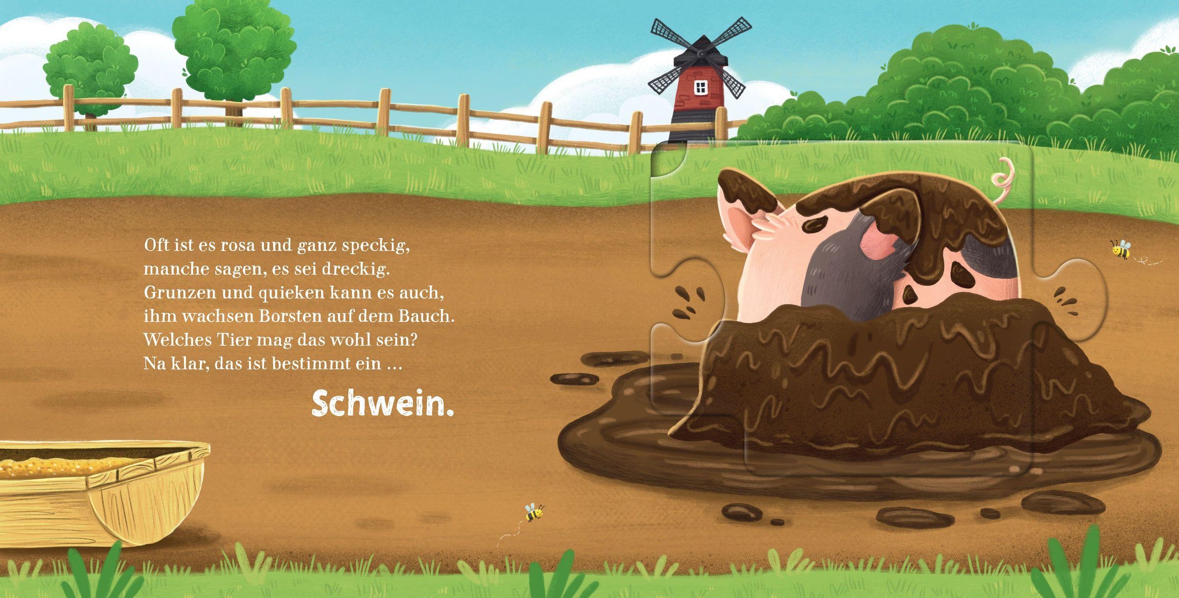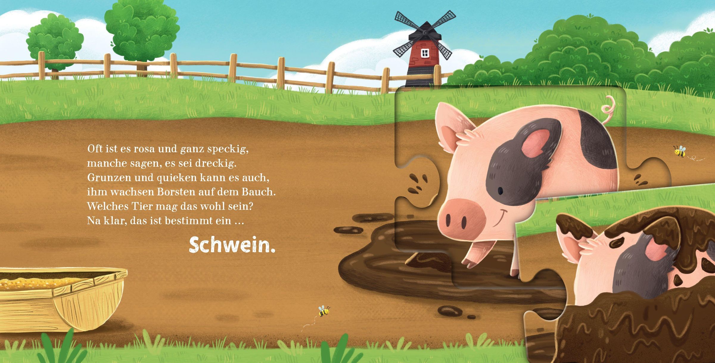 Auf dem Bauernhof ist immer was los, doch heute ist es ganz schön still hier. Wo haben sich die Tiere nur alle versteckt? Ein lustiger Ratespaß beginnt: Was ist weiß, wollig und lugt dort hinter der Hecke hervor? Und welches Tier ist rosa, grunzt und suhlt sich dahinten im Schlamm? Mithilfe von lustigen Reimen können Kinder erraten, welche Tiere sich auf den einzelnen Seiten versteckt haben. Und das Besondere: Sie können sie aus ihren Verstecken herauspuzzeln und am Ende zu einer niedlichen Tierkette zusammenlegen. Welches Tier führt die lustige Bauernhof-Polonaise wohl an? Ist es die Kuh oder doch das Huhn?