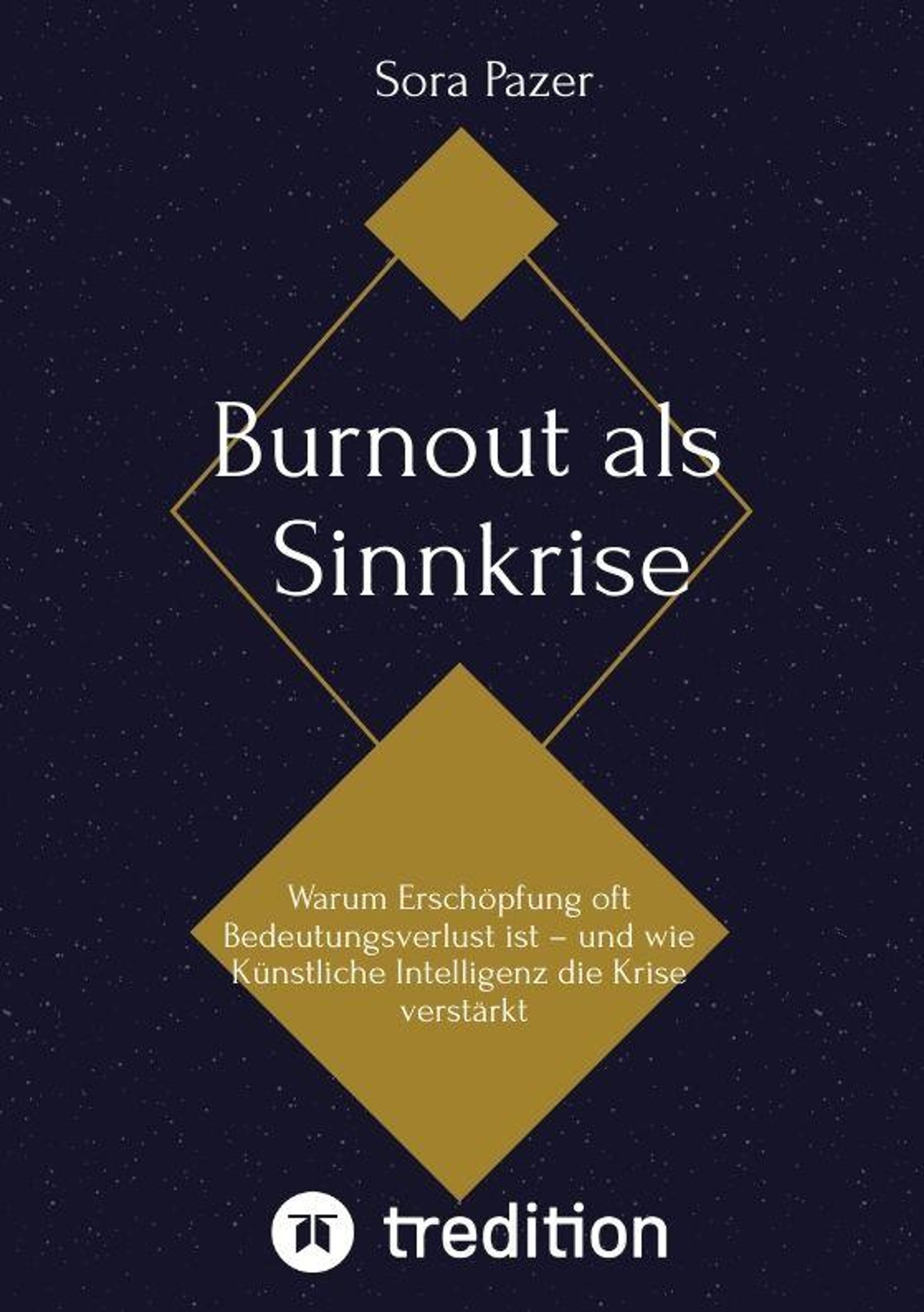 "Burnout als Sinnkrise" von Sora Pazer, Untertitel über Bedeutung und KI-Krise. Blaues Cover mit goldenen Rauten., Buch