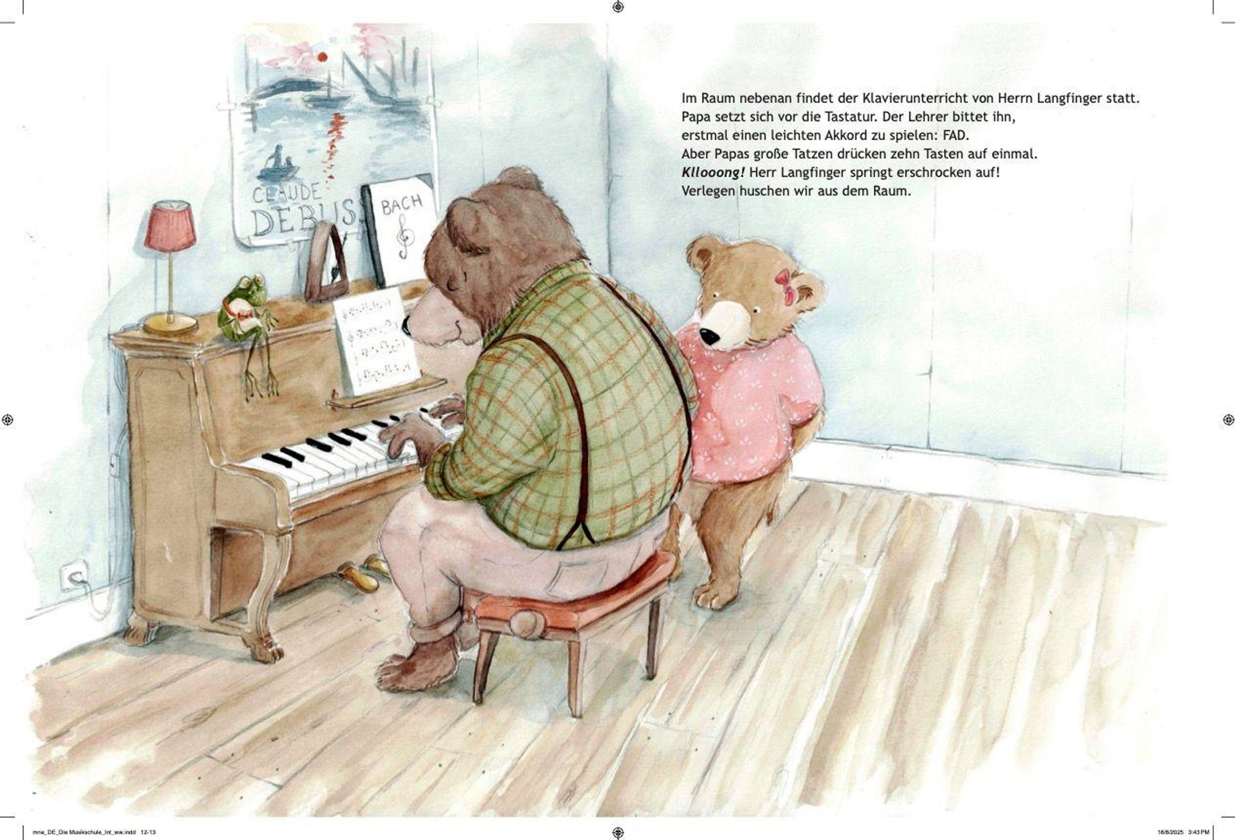 Mein Papa, der Bär hatte einen Kindheitstraum: Musik machen. Ob es jetzt zu spät dafür ist? Aufgeregt betreten wir die Musikschule. Er beginnt mit dem Klavierunterricht bei Herrn Langfinger. Aber mit seinen großen Tatzen trifft Papa nicht die richtigen Tasten. Auch die Geige ist nichts für ihn. Beim Chor von Herrn Bariton übertönt er mit seiner lauten Stimme alle anderen. Da entdecke ich ein kleines, silbernes Dreieck ...und es ist genau das richtige Instrument für ihn!