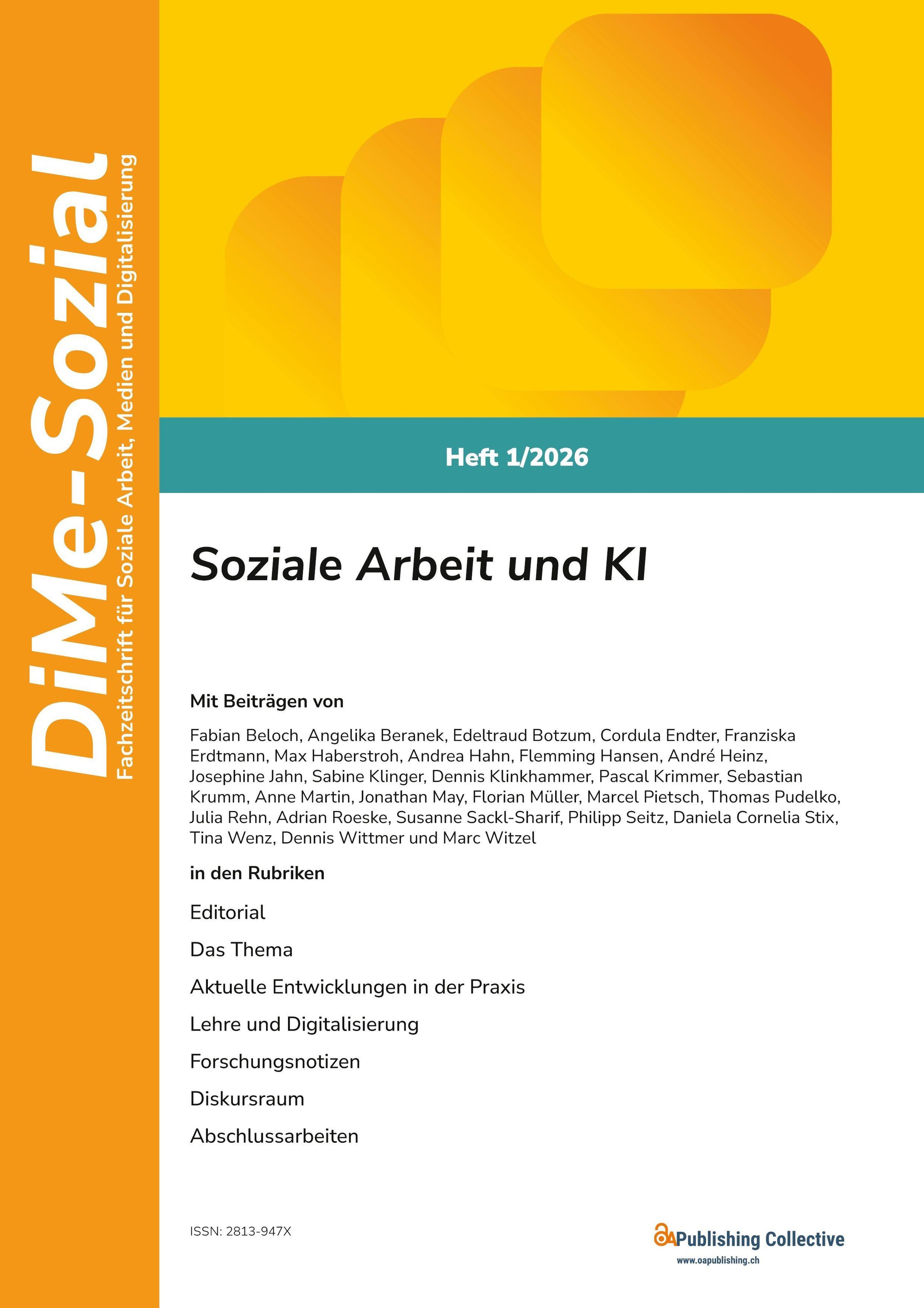 DiMe-Sozial, Heft 1/2026, "Soziale Arbeit und KI", Autorenliste, Rubriken: Editorial, Forschung, Diskurs, ISSN: 2813-947X., Buch