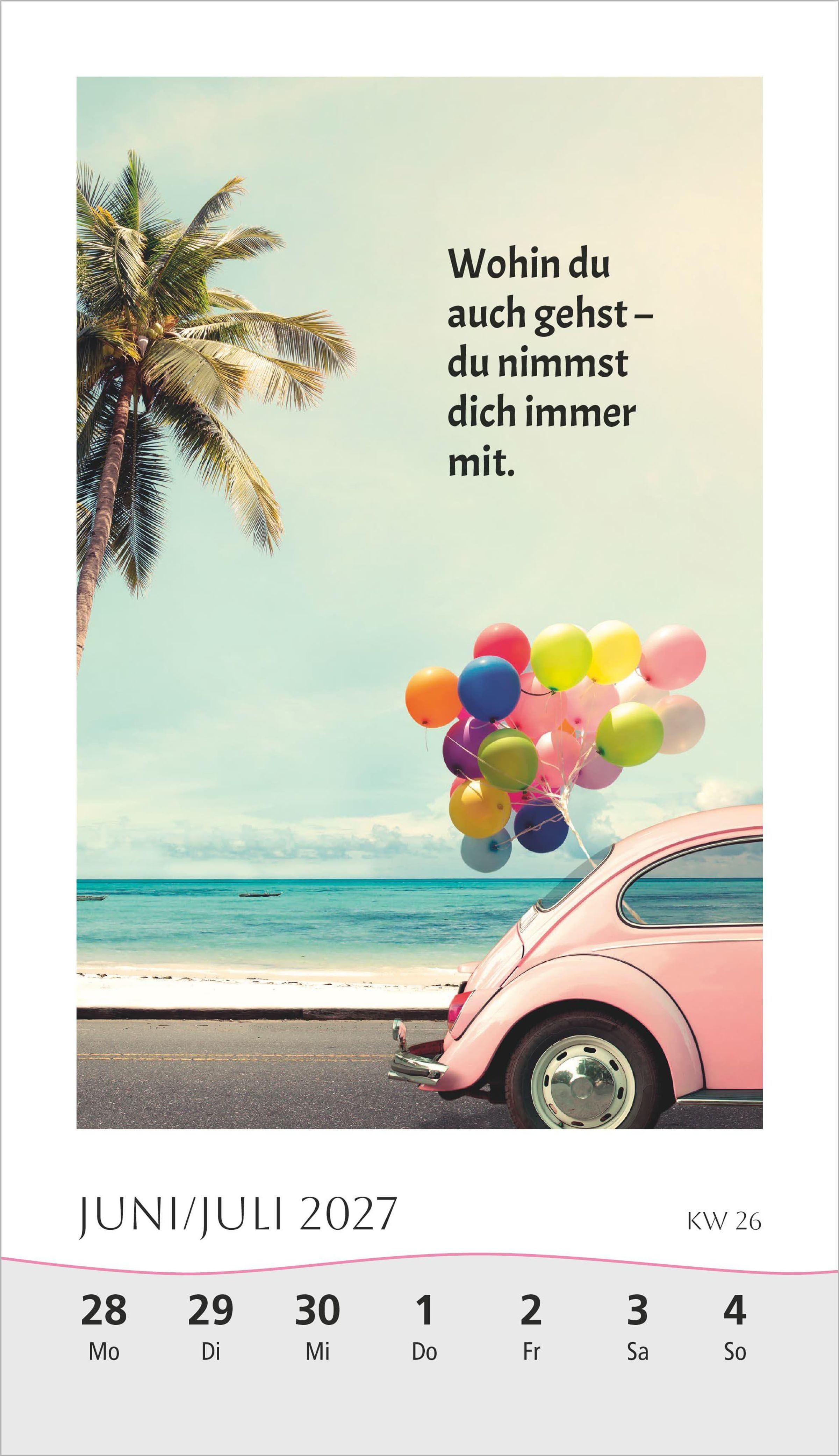 Der DUMONT Wochenwandkalender „Spaziergänge für die Seele 2027" begleitet Sie Woche für Woche mit einfühlsamen Lebensweisheiten, motivierenden Ratschlägen und positiven Affirmationen, die zum Innehalten und Nachdenken anregen. Auf 53 Seiten dreht sich alles um Lebensfreude, Achtsamkeit und stärkende Impulse für den Alltag. Stimmungsvolle, dekorative Bilder unterstreichen die Botschaften -- und auf den Rückseiten warten zusätzliche Inhalte, die die Wochenimpulse vertiefen.