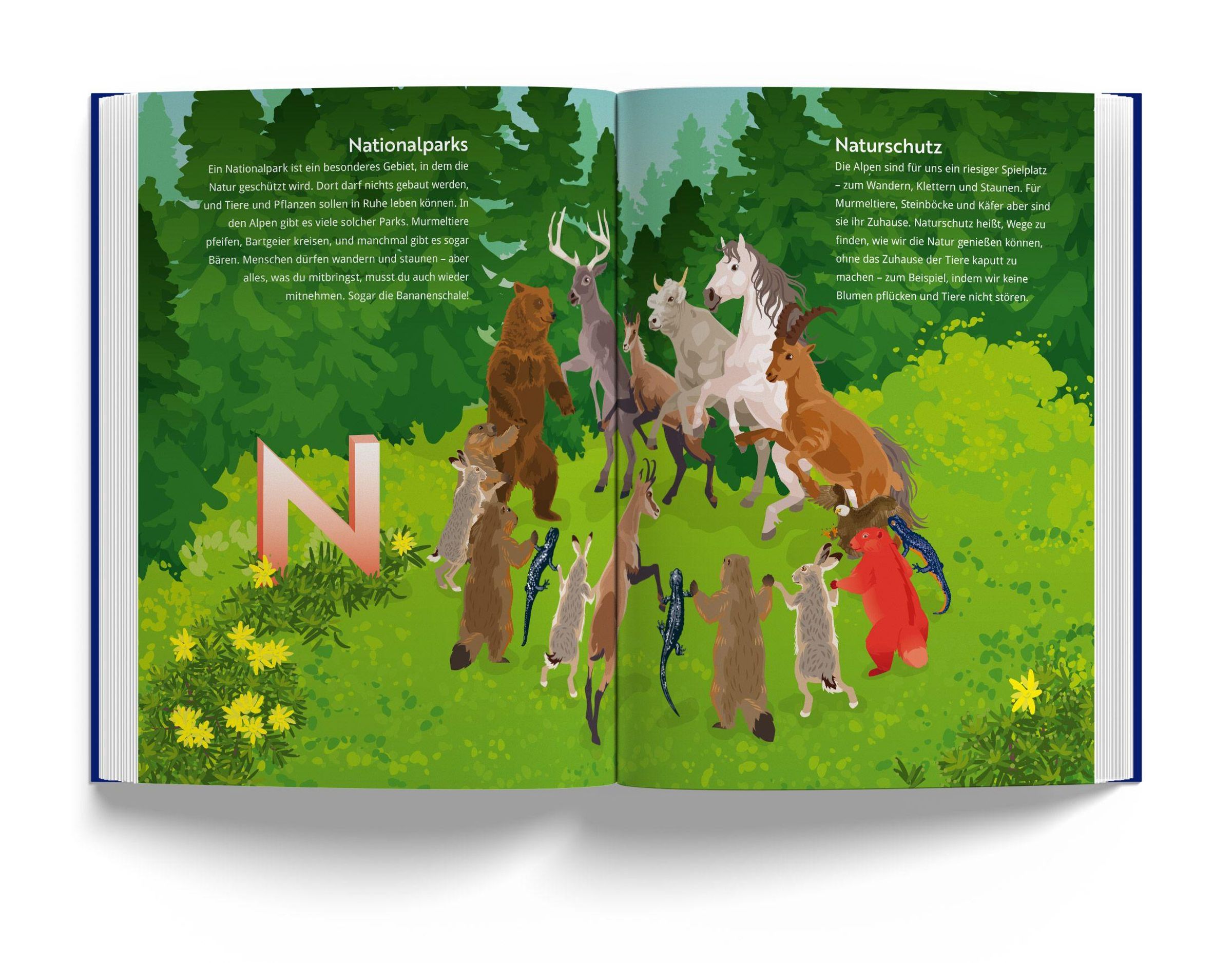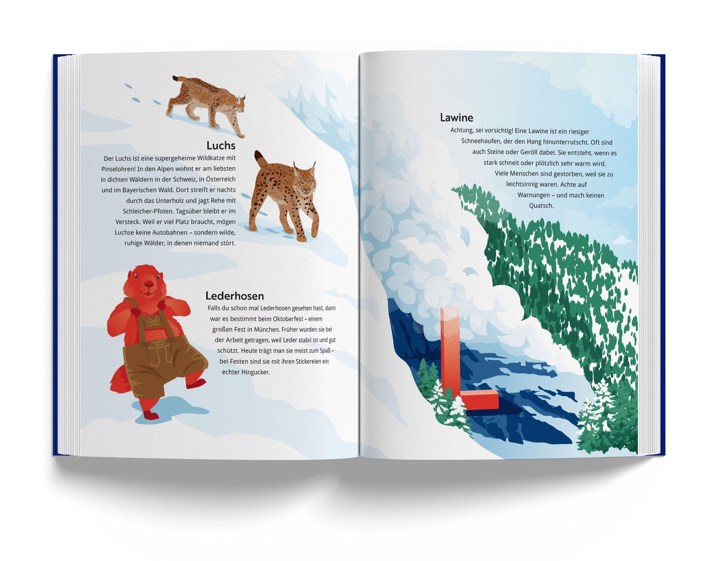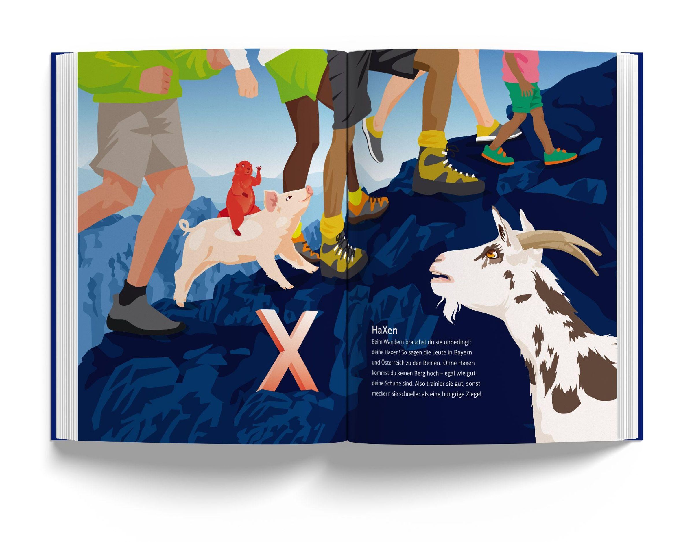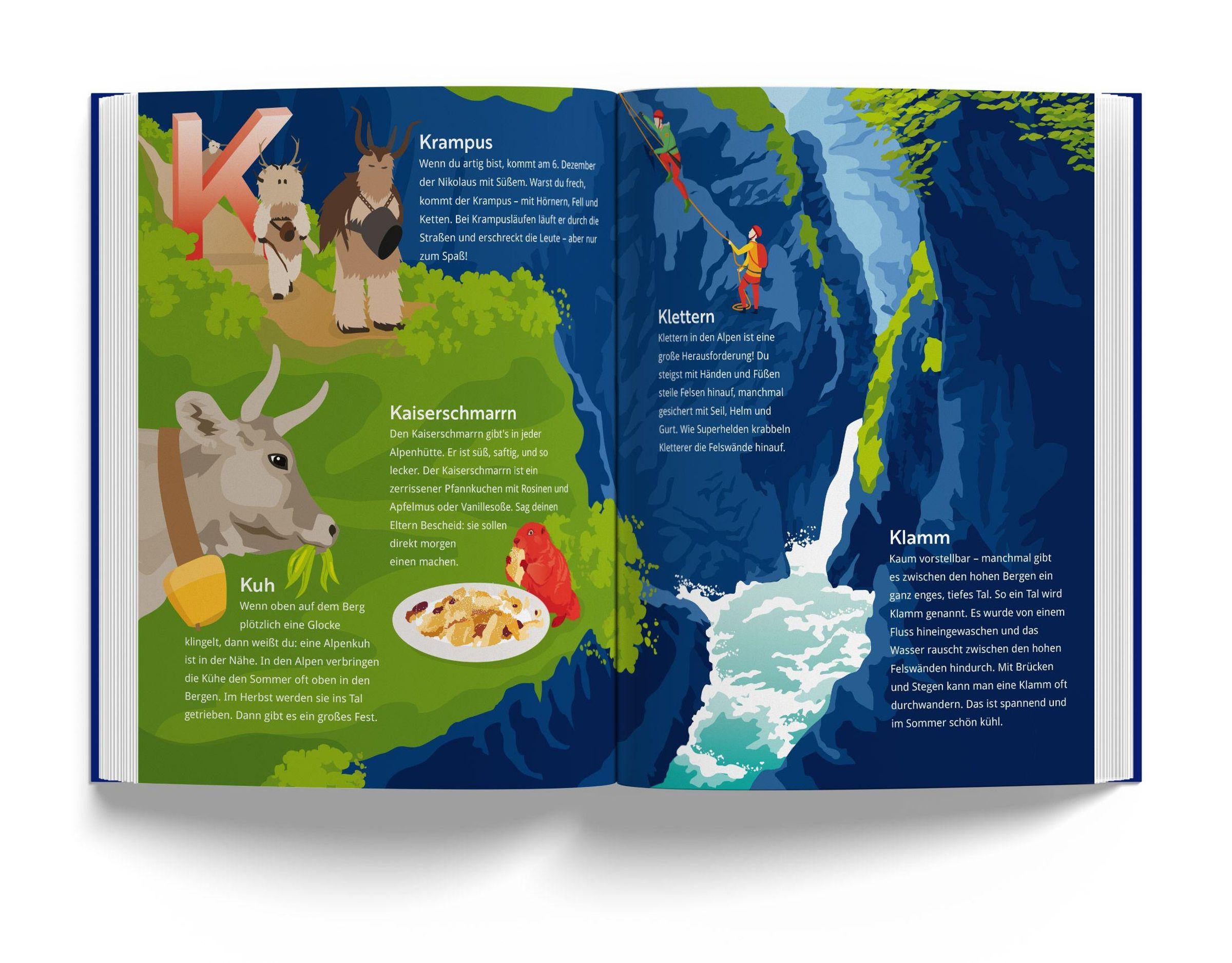 Alpen-ABC ist ein liebevoll gestaltetes Kinderbuch, das den Kindern auf spielerische Weise die Welt der Alpen näherbringt. Zu jedem Buchstaben des Alphabets gibt es eine Doppelseite, auf der ein Berg oder eine Region sowie ein Tier, eine Pflanze oder ein typisches Gericht aus den Alpen vorgestellt wird, deren Name mit dem entsprechenden Buchstaben beginnt. So entdeckt man zum Beispiel das Alphorn am Aletschgletscher, genießt Palatschinken am Piz Palü oder begleitet den Wolpertinger auf seiner Wanderung am Watzmann. Kinder, die gerade das Lesen lernen und eine Verbindung zu den Alpen haben, tauchen so auf unterhaltsame Weise in die faszinierende Welt der Berge ein.