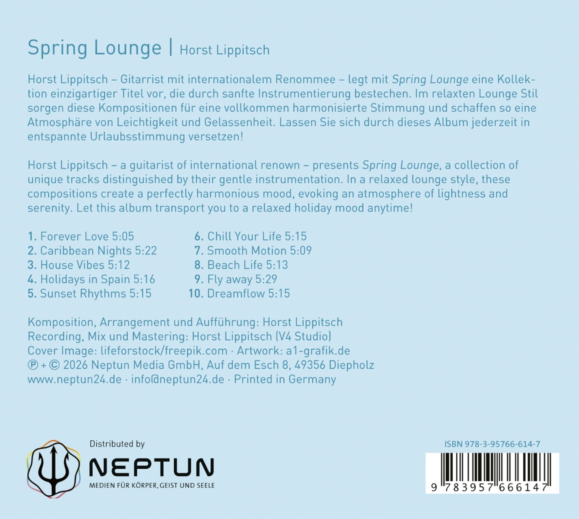 Horst Lippitsch - Gitarrist mit internationalem Renommee - legt mit Spring Lounge eine Kollektion einzigartiger Titel vor, die durch sanfte Instrumentierung bestechen. Im relaxten Lounge Stil sorgen diese Kompositionen für eine vollkommen harmonisierte Stimmung und schaffen so eine Atmosphäre von Leichtigkeit und Gelassenheit. Lassen Sie sich durch dieses Album jederzeit in entspannte Urlaubsstimmung versetzen!