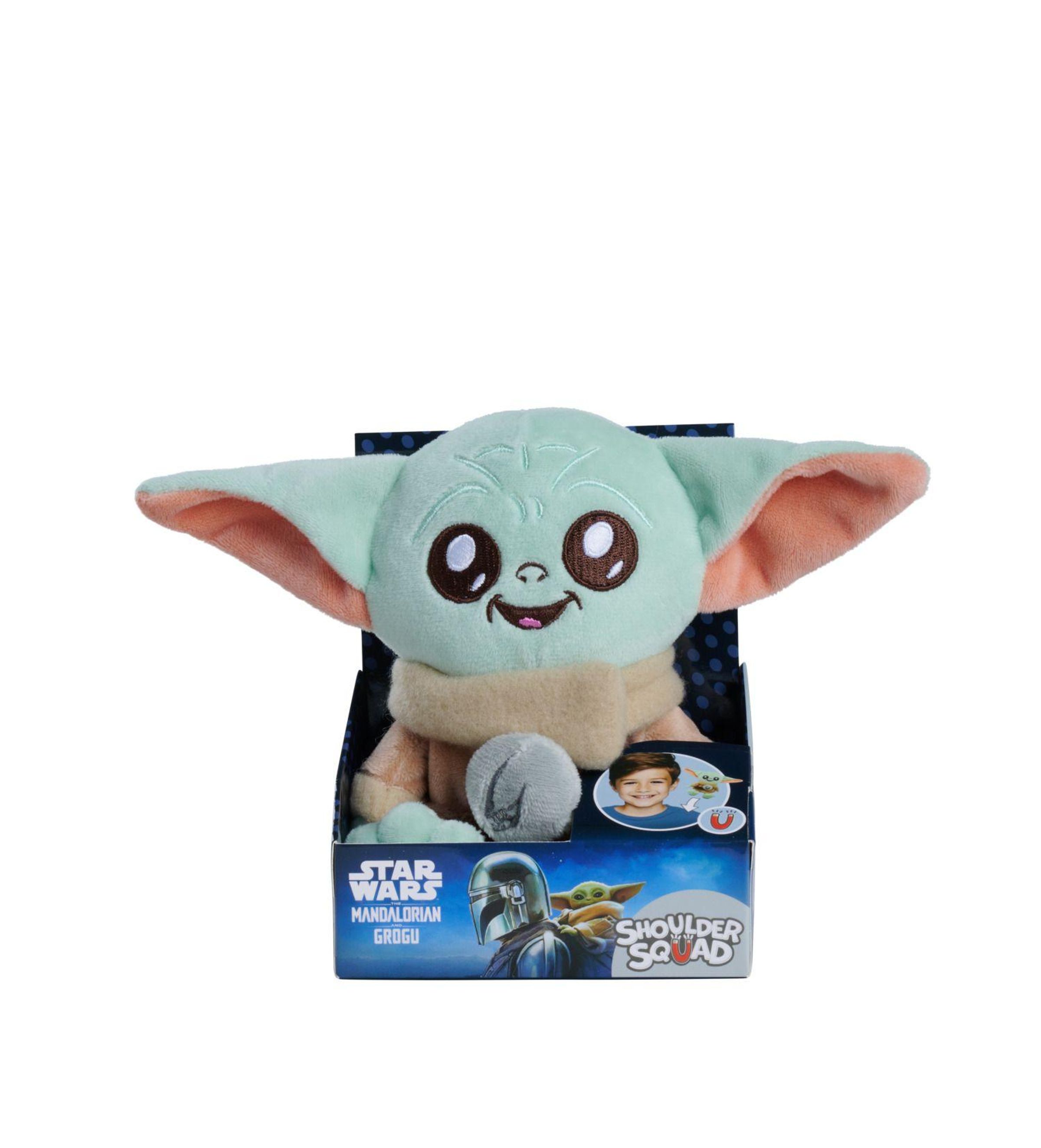 "Star Wars Mandalorian Grogu" und "Shoulder Squad" auf einer Verpackung. Grün-braunes Stofftier mit großen Ohren., Merchandise