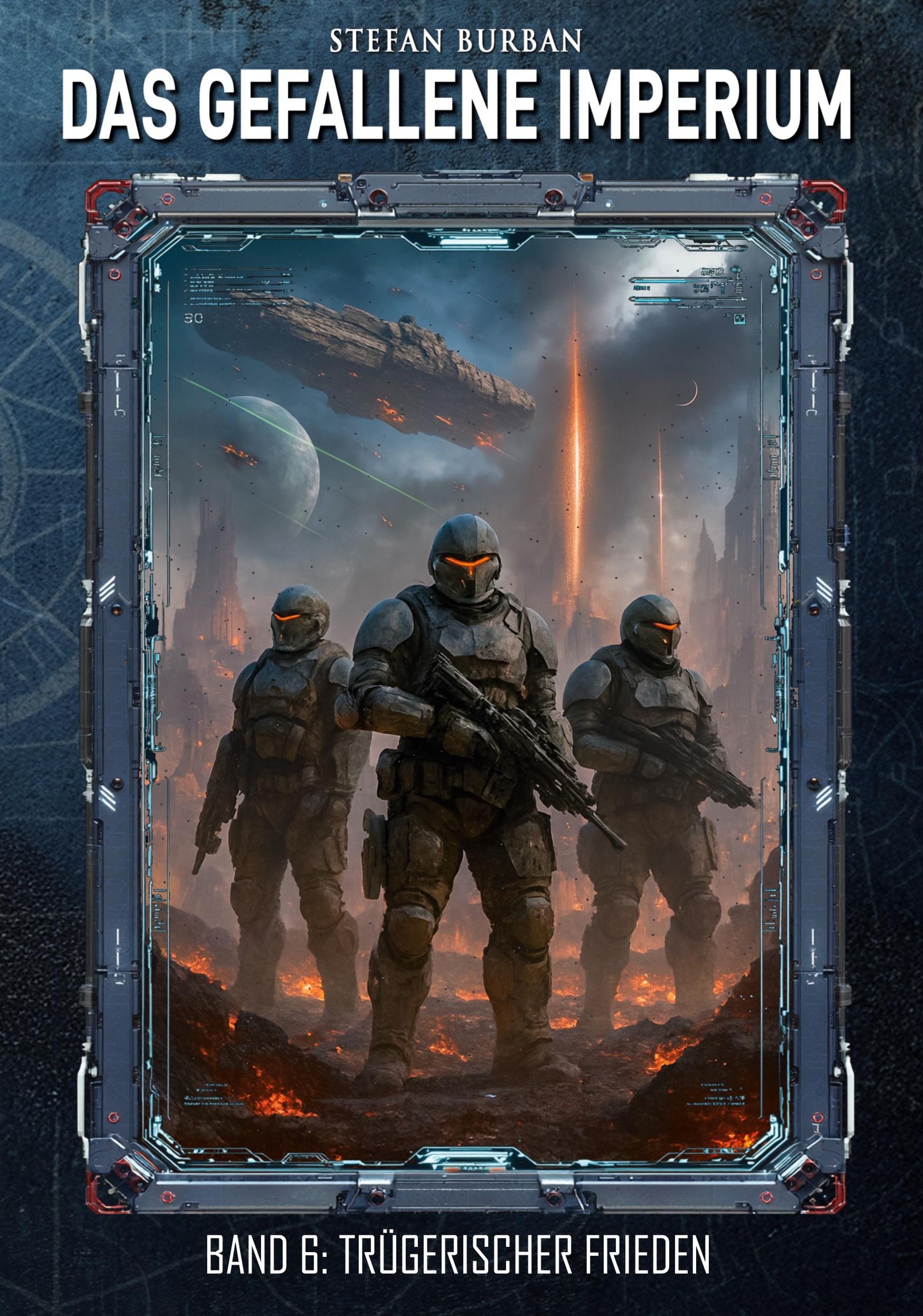 "Stefan Burban, Das gefallene Imperium, Band 6: Trügerischer Frieden." Illustration: Drei Soldaten in Rüstungen, futuristische Kulisse., Buch