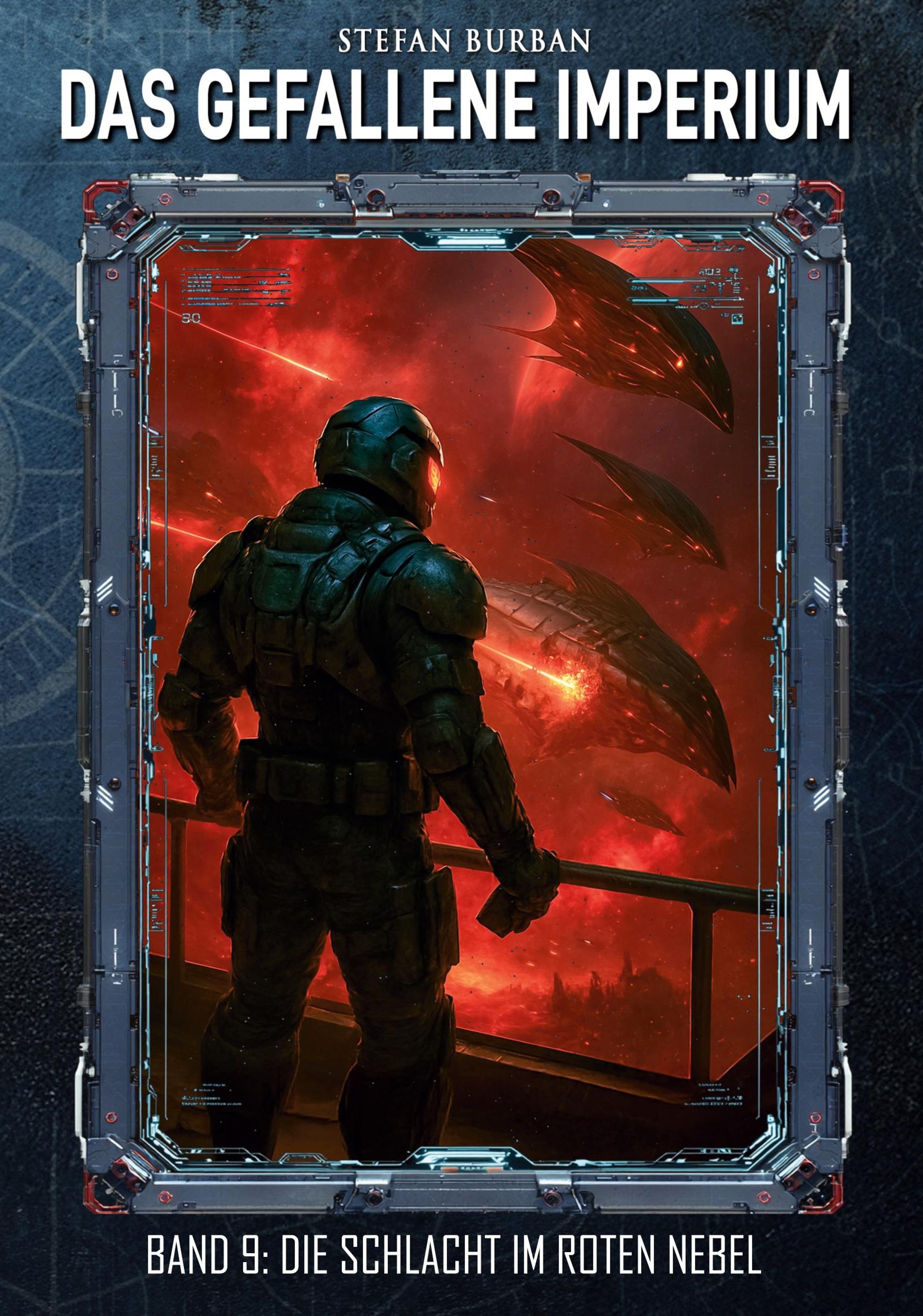 Stefan Burbans Buchcover zeigt einen Soldaten im Weltraum, der rote Nebel und Raumschiffe betrachtet., Buch